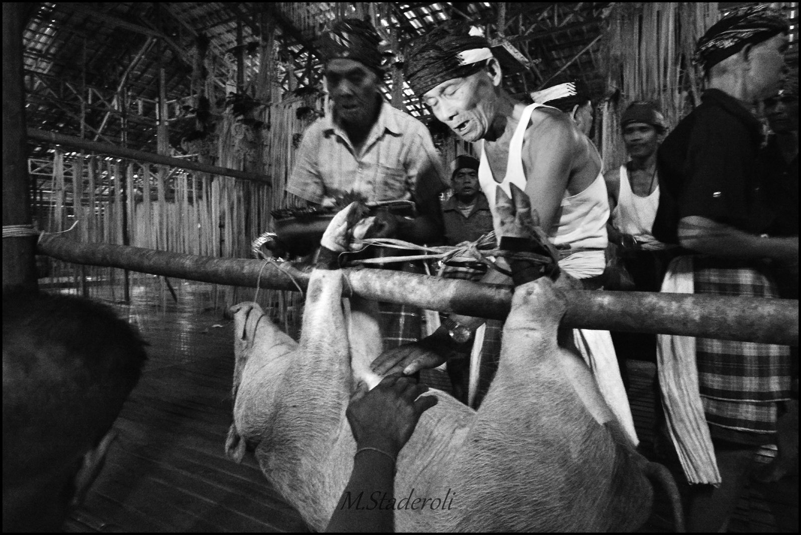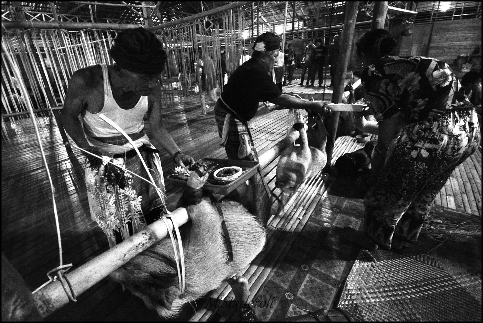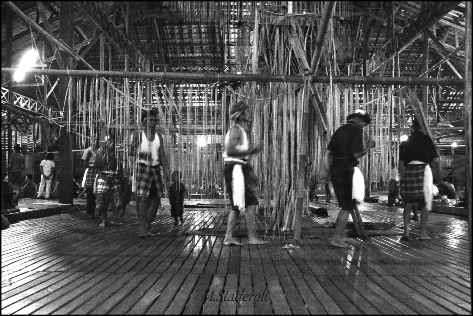 Vers peut-être 20H les tambours ont peu à peu repris. Un groupe d’hommes s’est levé et secouant leurs « bracelets » en fer (désolée mais je ne connais pas le nom de ces objets!) a commencé à chanter et à marcher en dansant autour de la partie centrale. Quand je dis danser c’est plutôt une marche rythmée par la musique car ils ne bougent pas beaucoup le corps. Leur concentration est comme toujours impressionnante, il semble qu’ils ne voient pas ce qui est autour d’eux, on dirait un peu une transe. Ils ont continué comme ça à tourner puis à chaque fois qu’ils arrivaient devant un cochon il y avait des sortes d’offrandes et des incantations de dites (certainement un peu comme les Mentawai qui communiquent avec l’esprit des bêtes). Toujours des espèces de conversations entre hommes et femmes avec les porcs au milieu. Comme il y avait moins de monde j’ai pu prendre plus de photos mais il fait tellement sombre que ce n’est pas terrible. Dommage car il y avait de quoi faire… Cela a duré une bonne heure, puis ça s’est arrêté.