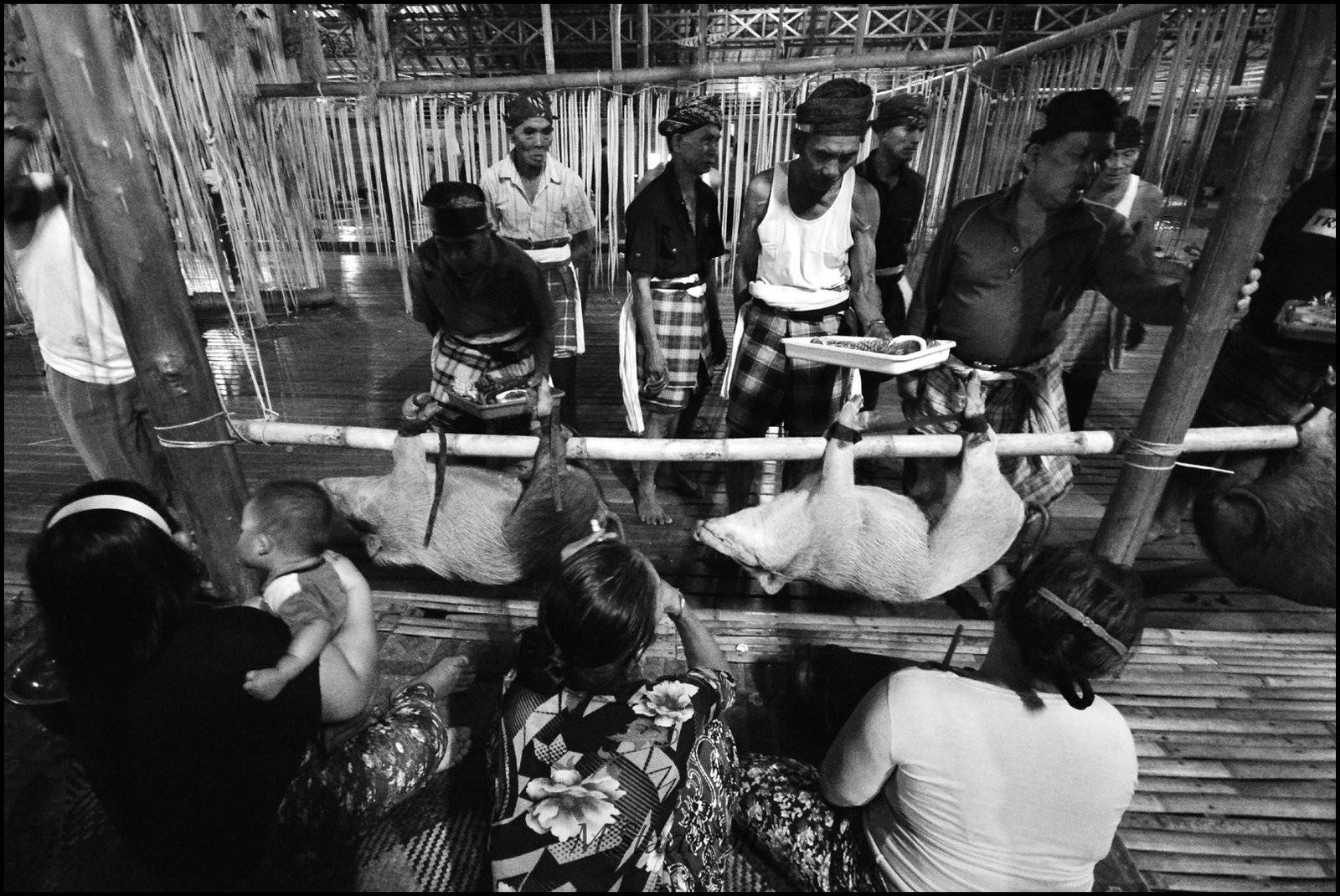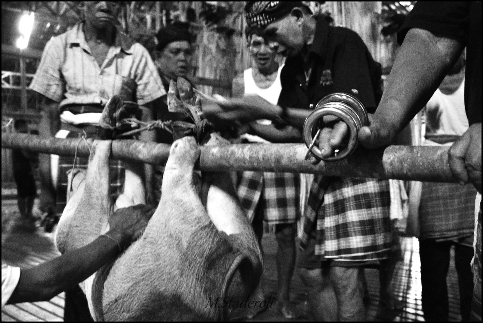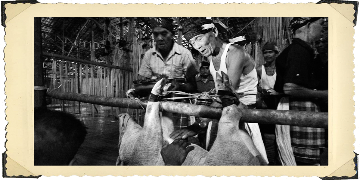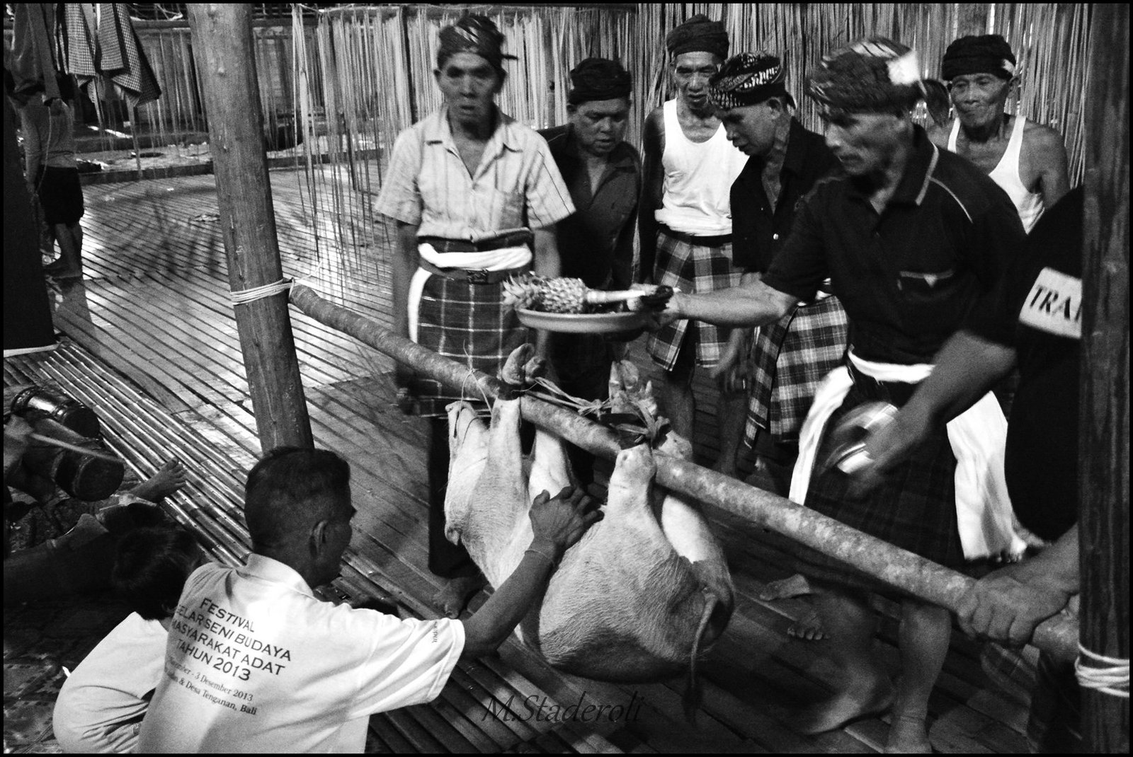 Vers peut-être 20H les tambours ont peu à peu repris. Un groupe d’hommes s’est levé et secouant leurs « bracelets » en fer (désolée mais je ne connais pas le nom de ces objets!) a commencé à chanter et à marcher en dansant autour de la partie centrale. Quand je dis danser c’est plutôt une marche rythmée par la musique car ils ne bougent pas beaucoup le corps. Leur concentration est comme toujours impressionnante, il semble qu’ils ne voient pas ce qui est autour d’eux, on dirait un peu une transe. Ils ont continué comme ça à tourner puis à chaque fois qu’ils arrivaient devant un cochon il y avait des sortes d’offrandes et des incantations de dites (certainement un peu comme les Mentawai qui communiquent avec l’esprit des bêtes). Toujours des espèces de conversations entre hommes et femmes avec les porcs au milieu. Comme il y avait moins de monde j’ai pu prendre plus de photos mais il fait tellement sombre que ce n’est pas terrible. Dommage car il y avait de quoi faire… Cela a duré une bonne heure, puis ça s’est arrêté.