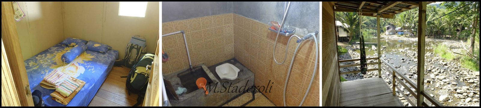 Quand le chauffeur s’arrête tout d’abords je ne crois pas que nous soyons arrivés à bon port. L’hôtel où j’ai réservé, le « Wisma Alya » été décrit dans deux blogs (je n’ai rien trouvé de plus) comme un endroit paisible et charmant . Or ce que je vois ce sont des détritus partout, des choses entassées, de la poussière, et des scooter au milieu de quelques baraques en bois délabrées. Je tourne la tête et reconnais la devanture de l’hôtel que j’avais vue en photo (c’était bien cadré, on ne voyait pas le tour!). Bon… allons y ! Il y a quatre chambres qui sont à 150 000rp soit 10€. La salle de bain est commune, on le savait, et j’avais vu une belle photo d’un hamac sur une terrasse donnant sur la rivière. Nous entrons dans une pièce où une dizaine de matelas sous plastique sont empilés, une petite fille regarde la télé allongée dessus et ne répond pas à notre « hallo ». La patronne nous mène jusqu’à une sorte de grosse échelle. Les chambres sont en haut. Nous savions que ça allait être « très simple » mais nous avons été déçus quand même car nous pensions que ce serait un poil plus grand et qu’il y avait un balcon. La chambre était propre mais devait faire 6m2, juste de quoi poser un matelas au sol et nos sacs à côté. Pas la moindre étagère, ou quoi que ce soit pour poser quelque chose. La terrasse, ou plutôt le balcon vu en photo est en fait commun à toutes les chambres. Mince ! Un hamac et trois chaises en plastique, si nous sommes huit ça fait « just » ! Visiblement une autre chambre est occupée. Nous posons nos affaires, un peu dépités car cette étape « longue » devait être « nature et repos ».