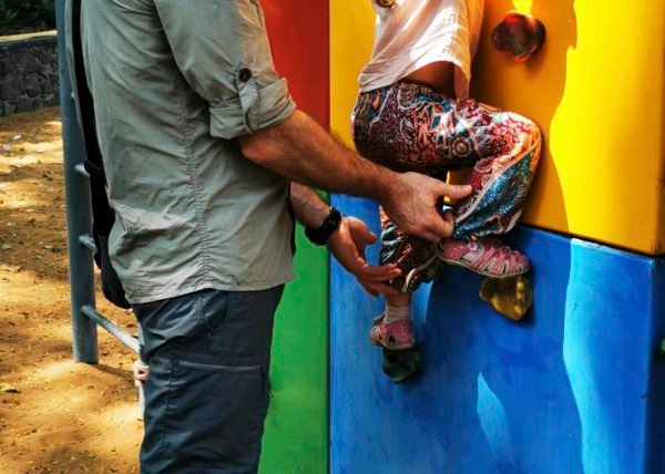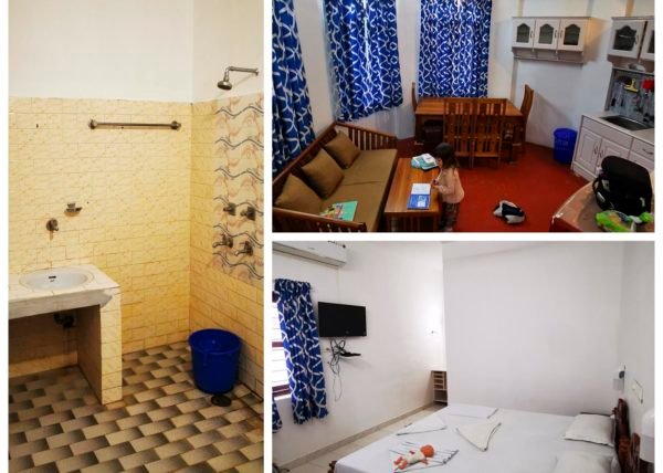 Nous voilà en bord de mer, nous logeons à l hôtel Wilson Ayurvedic Resort (qui n'a rien d ayurvedique et encore moins de resort 🤣) à deux pas de la plage de Lighthouse, avec clim et piscine pour 18€. La piscine est vraiment sympa (c'est le seul hôtel où nous en aurons une, profitons !) de l extérieur c est flatteur mais les chambres c est basique local défraîchi, faut pas regarder de près quoi 😆 Pour le prix c est le jeu en général ! Mais c'est suffisamment confortable ! La chambre qu on nous avait donnée avait la clim cassée ("ha bon ? Heu oui le câble électrique pend au mur...) 😂) du coup on a une espèce de suite ou de studio, pratique quand Lou dort.