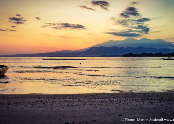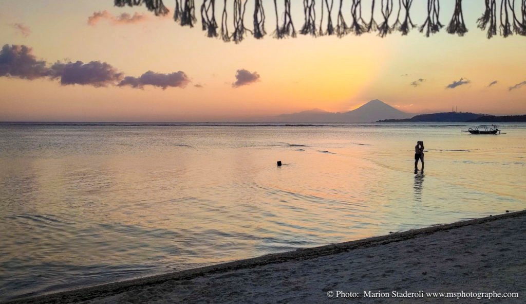 Je suis vaguement réveillée par l appel à la prière 📢 vers 4h45, puis je somnole rêvant d eau turquoise et que je dois me lever pour aller sur la plage ... 5h45, debout, je me fais un café et file au bord de l'eau 😍. Le bruit des vagues, le chant du coq et le ciel qui s illumine, puis le soleil qui pointe derrière les reliefs de Lombok 😍 presque seule au monde ❤️