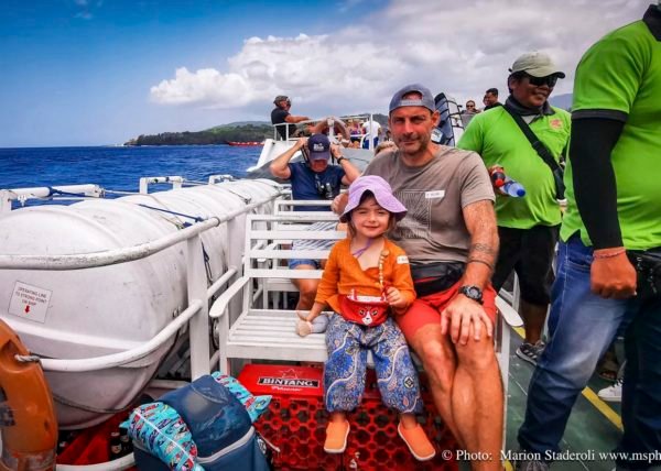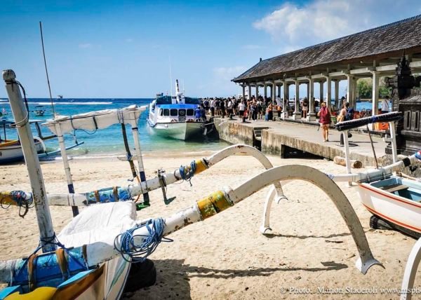 Le réveil ⏰ sonne à 6h pour nous, 7 pour Lou, et Pande notre chauffeur nous récupére à 7h30. Arrivée 9h15 au port de Padangbai, nous récupérons les tickets réservés, puis attendons le bateau devant un petit shop, pour un départ à 10h30⏰. On en profite pour prendre des bananes 🍌, c est qu on a loupé le petit dej, et des pique-niques emballés ds des feuilles de babanier pour 1€ 😋 car on va sûrement louper aussi le déjeuner 😅