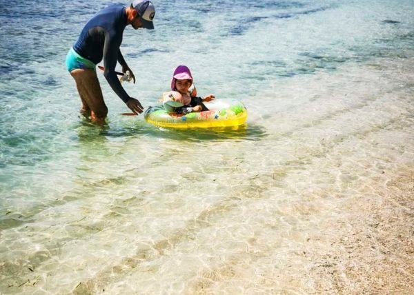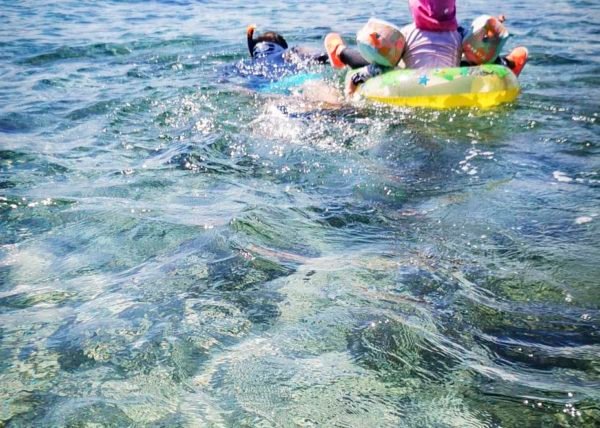 On part en maillot se mettre à l eau 🌊 judte à côté de l hôtel. On a un petit bâteau gonflable au cas où Lou en ait marre de nager, et on plonge !