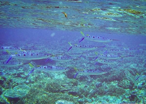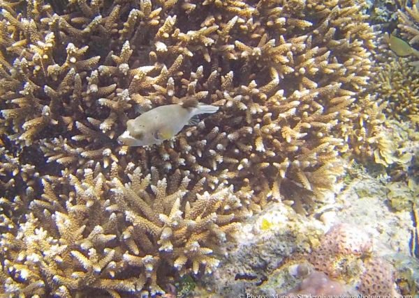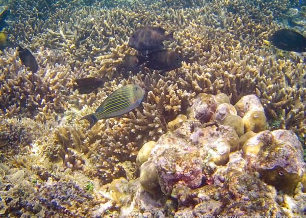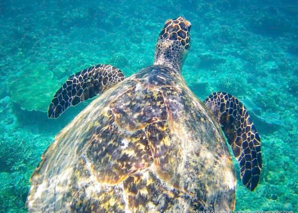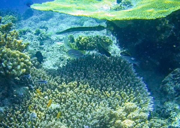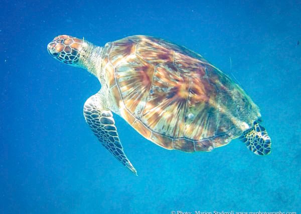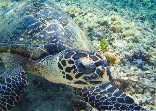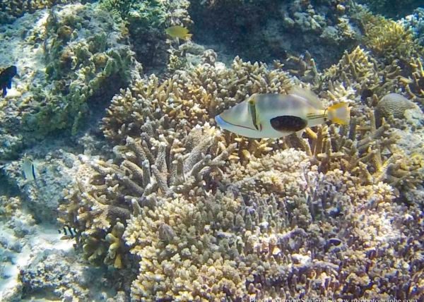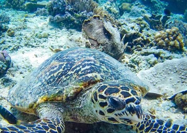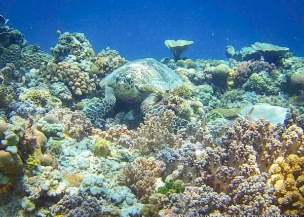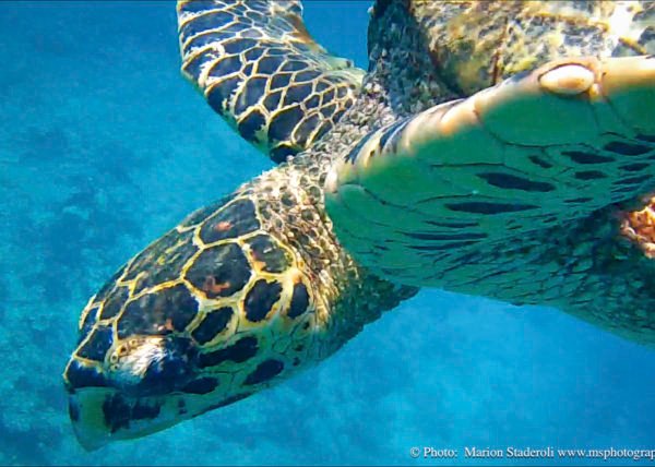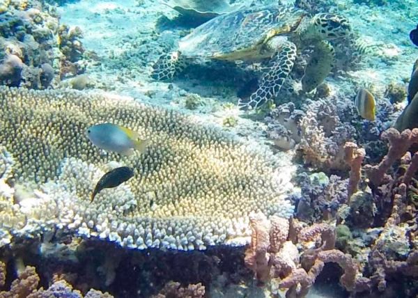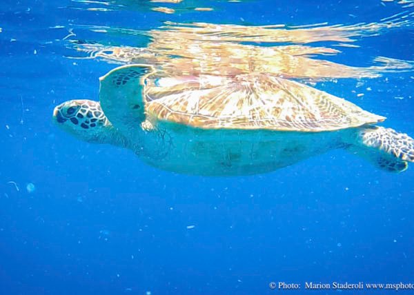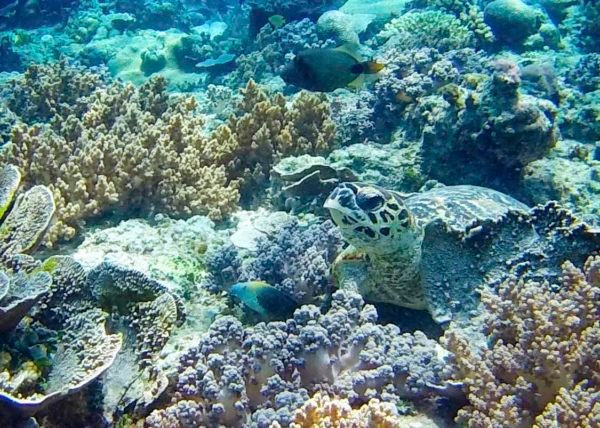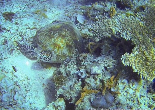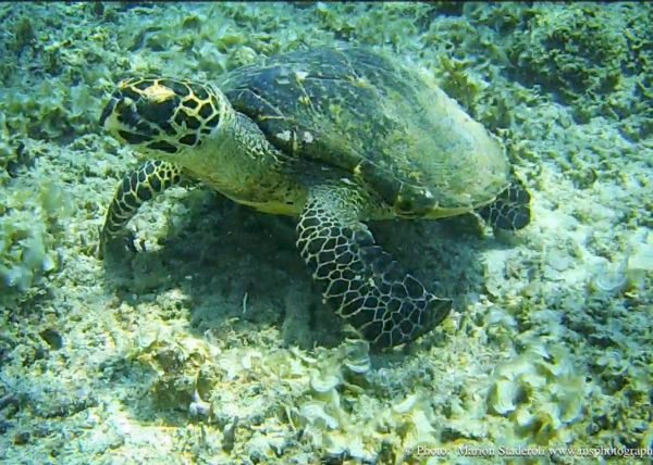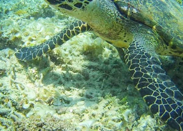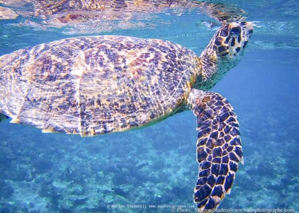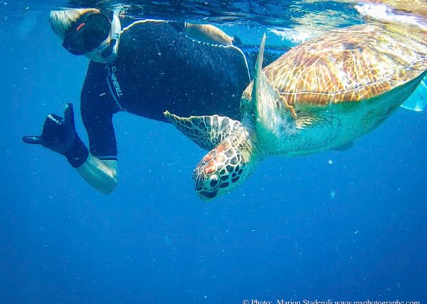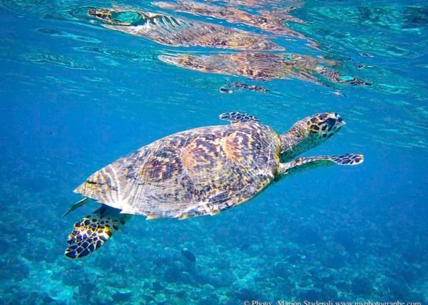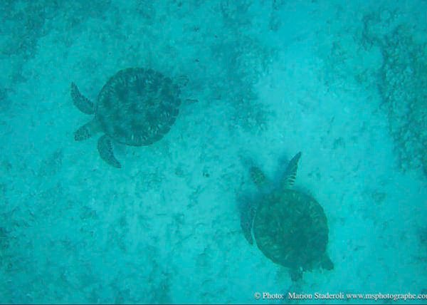 La marée est un peu haute, ça bouge un peu donc c est moins clair que l autre jour mais on peut quand même observer les poissons et assez rapidement une tortue. J ai le nez dessus sans la voir