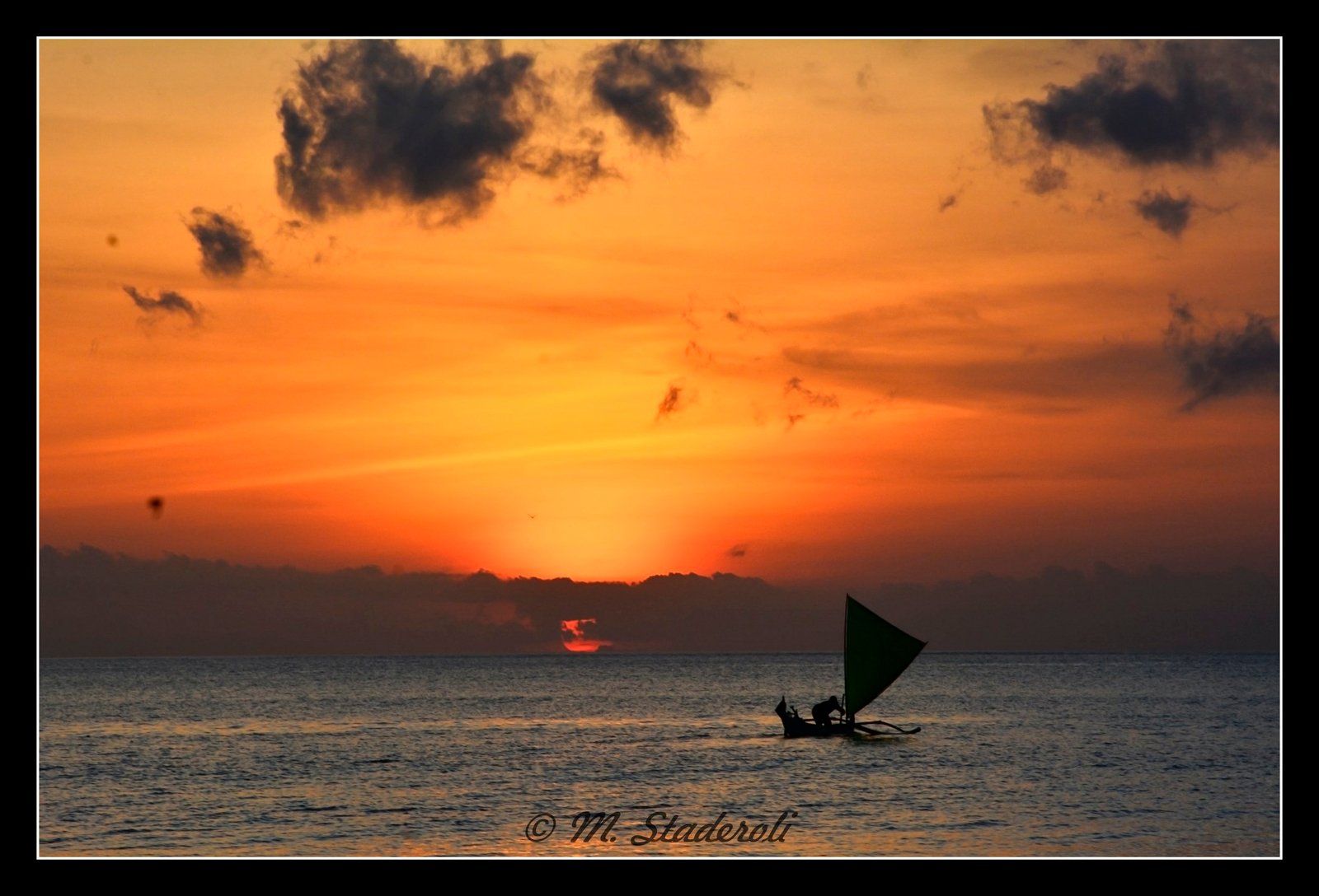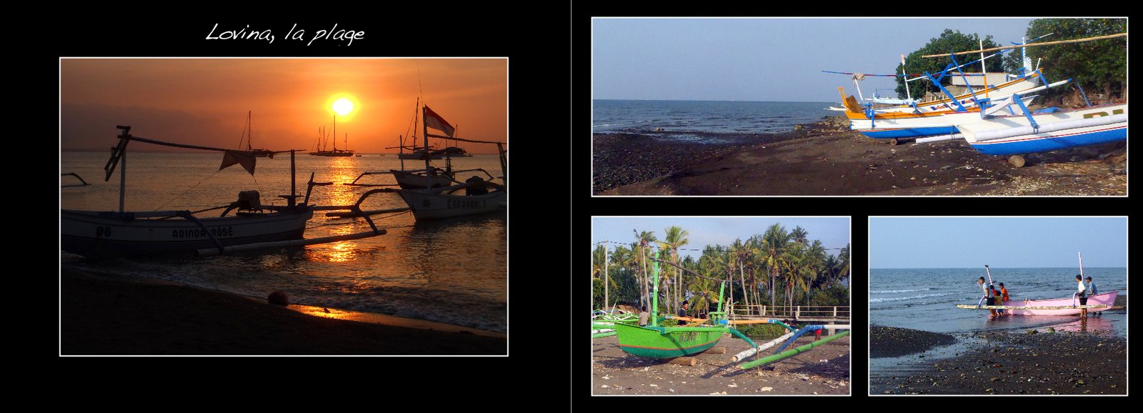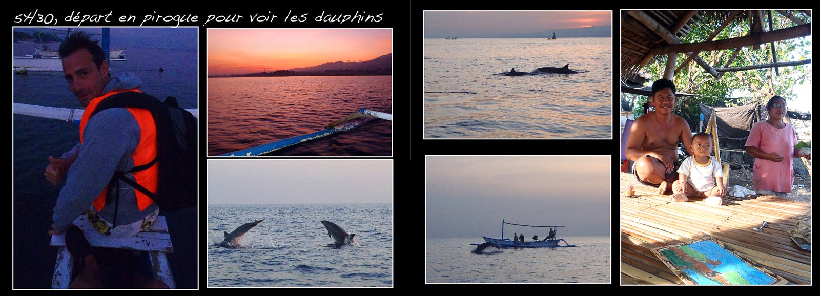 L’attraction ici ce sont les dauphins ! Toutes les personnes que vous croiserez vous proposeront une excursion (à voir les prix, à négocier). En réalité nous nous faisions assez peu d’illusion d’en voir. Nous avions croisés des touristes qui revenaient de Lovina et qui en avaient vaguement aperçus de très loin, peu engageant… Suivant les conseils de notre guide « petit futé » et des Balinais que nous avions rencontrés (qui eux nous affirmaient que les dauphins étaient bien là quasiment tous les jours à la même heure…) nous avons donc prévu une excursion avec un pêcheur pour voir les fameux dauphins de Lovina. C’est assez peu cher et ça vaut quand même le coup d’essayer ! Nous voilà donc debout à 5H du mat’, départ à 5H30 tout près de la pension, en bateau de pêche traditionnel. L’avantage c’est que nous sommes arrivés les premiers sur l’eau et avons bénéficié d’une bonne demie-heure seuls au lever du soleil. C’était très calme et très beau. Déjà une bonne chose ! Puis tout à coup le pêcheur qui scrutait sans cesse l’horizon accélère…et magie…voilà tout un banc de dauphins! Ils sortent, puis disparaissent pour réapparaître un peu plus loin, le jeu est donc de les repérer et de les suivre ! Nous les avons bien vus plusieurs fois, mais j’avoue que passée la demie-heure où nous étions seuls, d’autres bateaux sont arrivés de toute part. De plus gros bateaux avec beaucoup plus de monde. Et là l’ambiance est moins calme ! Chaque fois qu’un des bateaux aperçoit les dauphins, il met le cap et fonce, et là tous les autres font de même ! Cela ressemble un peu à une course poursuite bof bof …