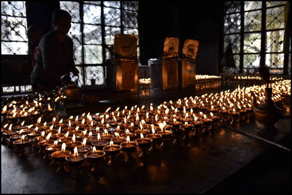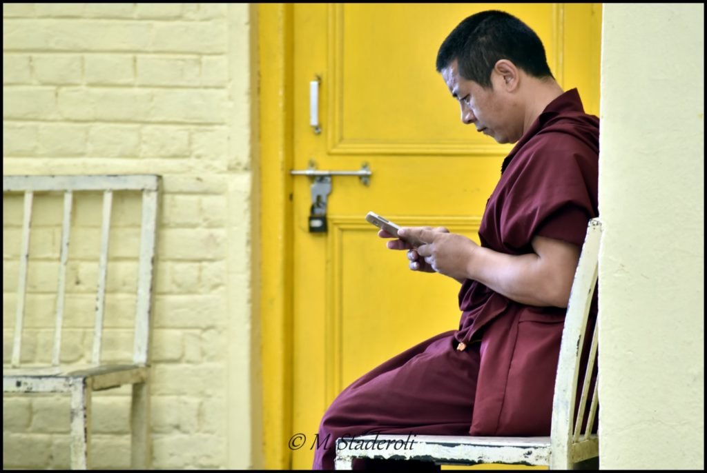 La présence de ce peuple se remarque tout de suite car on voit des moines un peu partout dans la ville, et même sans ça, les faciès et les tenues vestimentaires ne sont plus les mêmes. On croise partout des tibétains et presque tous ont un collier-chapelet, un « mala », dans la main et certains un moulin à prières.
