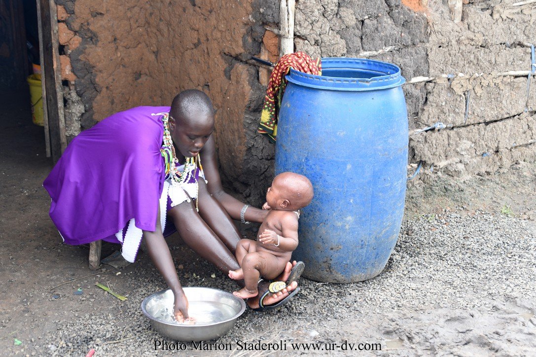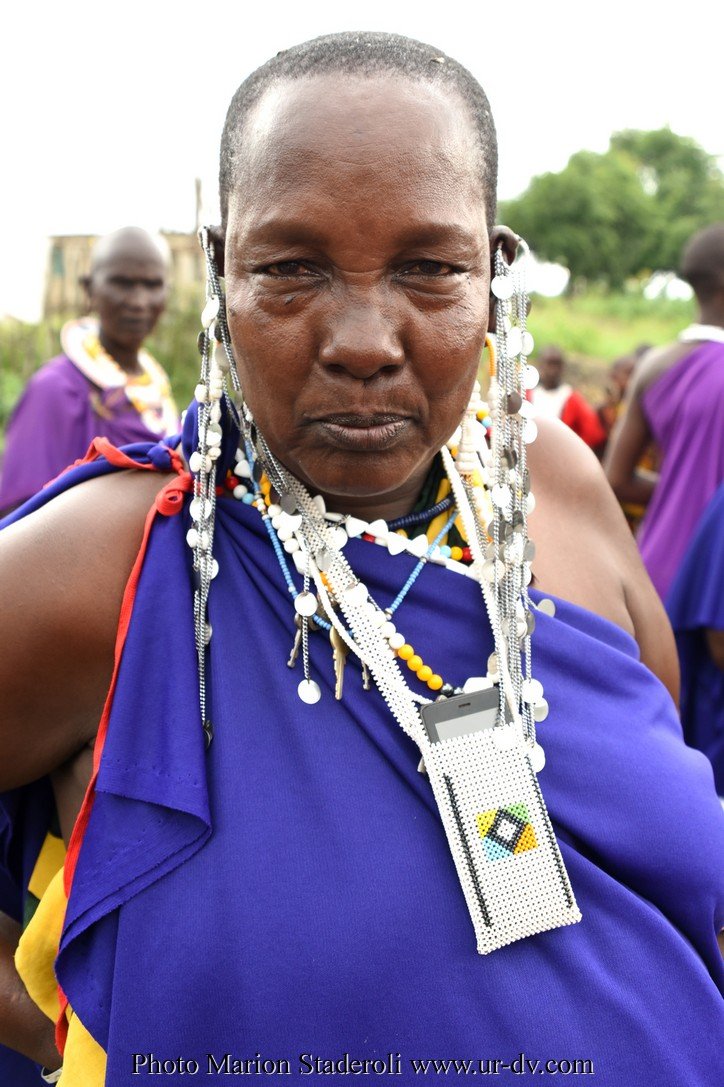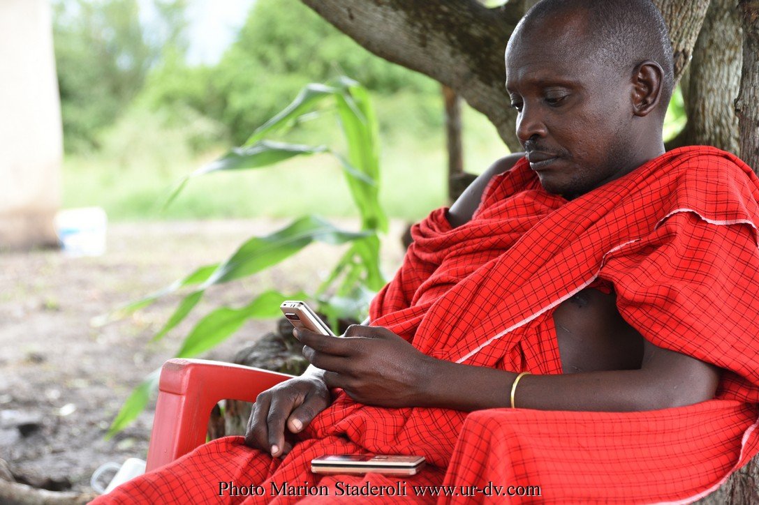 Ceci n’est possible que car elle quitte plusieurs mois le village et revient avec de l’argent. Ainsi, sa maison est en dur, elle a un réchaud à gaz (même si elle cuisine souvent au bois avec les autres femmes), quatre chaises en plastique et une table basse. Elle va aussi de temps en temps acheter de l’eau à des voisins qui ont des citernes de récupération de pluie au lieu de la puiser dans les rivières ou trous d’eau. Nous avons été surpris de trouver une ampoule pendant au plafond de la maison et de voir que grâce à un boîtier elle peut recharger une batterie solaire en envoyant des crédits avec son téléphone portable (qui capte plutôt bien)! Dingue ! En parlant de téléphone, tous les maasia en avaient un (et même parfois deux!). Ils avaient beau se laver dans une mare, ils avaient tous investi dans ce moyen de communication moderne dont ils usaient et abusaient toute la journée ! Beaucoup de femmes ont même de petites pochettes en perle au tour du coup prévues à cet effet. D’ailleurs quand j’avais demandé quel cadeau on pouvait porter de France et qui leur serait utile on m’avait dit.. un smartphone « si vous en avez , sinon c’est pas grave »! Il a fallu leur expliquer que cela coûte trèèèès cher chez nous…