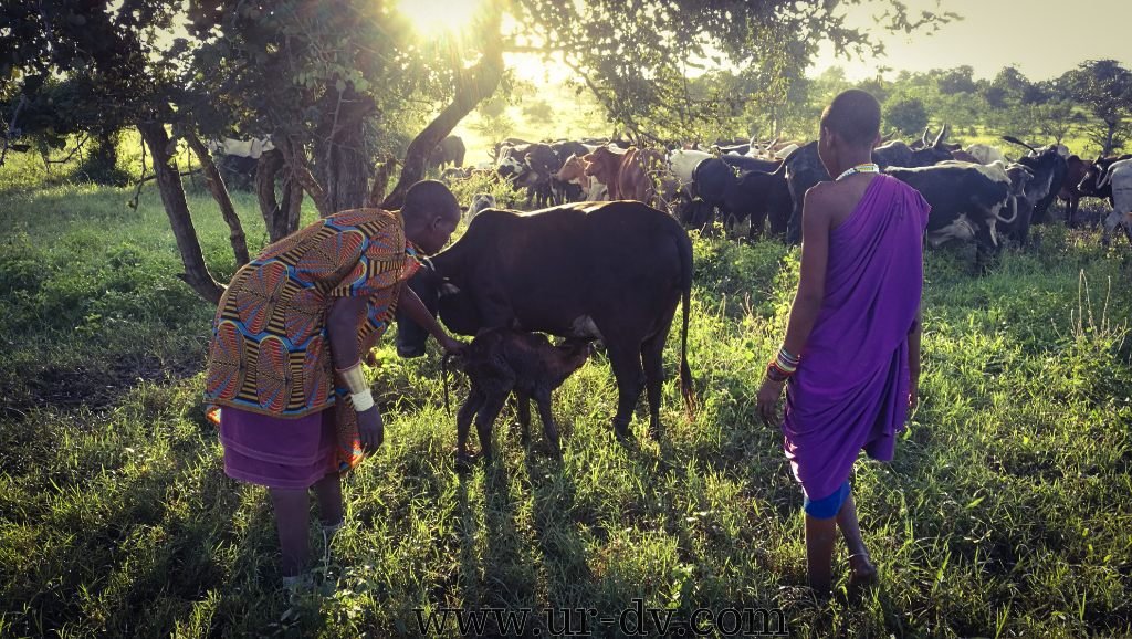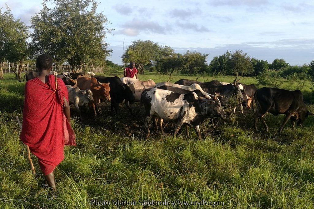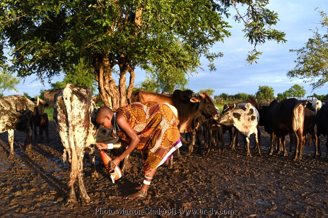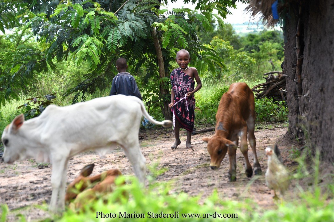 Chaque homme a plusieurs femmes dans le même village (du moins autant qu’il le peut car pour avoir des femmes ils faut pouvoir offrir beaucoup de vaches!) et du coup les familles sont très grandes ! Selina et Mateo sont un couple un peu moderne car il ne vit pas en général dans ce village avec elle (il était venu exprès pour nous) mais avec son autre femme. Par contre il va à Zanzibar avec elle. Quand je vous disait que Selina était moderne ! Bref les journées se passaient lentement, parfois trop pour nous d’ailleurs car en plus nous étions traités comme des rois, toujours tenus un peu à l’écart des tâches et priés de nous reposer ! Pas facile de tenter de s’imposer tout en essayant de ne pas les froisser. Heureusement le prétexte des enfants était toujours bon pour aller vadrouiller. Ces mômes sont trop mignons et tellement rapidement autonomes ! Déjà jeunes les garçons s’occupent de rentrer les veaux.