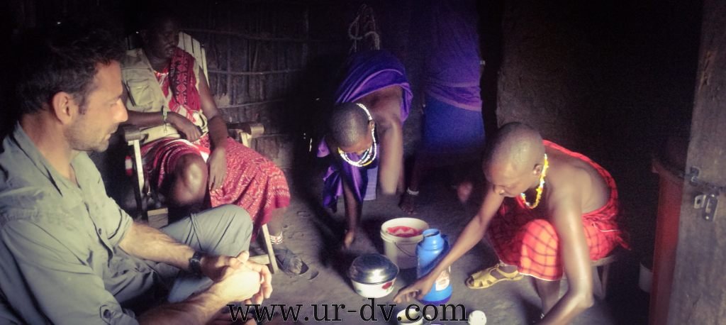 Aucune hutte traditionnelle donc, mais une vie somme toute en marge de notre monde. Les tenues et bijoux, restent traditionnels, bien que les enfants en bas âges portent des vêtements classiques, et la nourriture a elle aussi évoluée. Normalement les maasai qui sont des éleveurs nomades, se nourrissent exclusivement de lait et de viande. Aujourd’hui , ils achètent de la farine, du riz , et autres aliments dans les villages voisins. Mais la base reste bien le lait, et nous avons pu en déguster du tout frais à chaque repas, souvent infusé avec du thé et du gingembre mmhh. Les rites traditionnels sont quant à eux encore pour beaucoup respectés (notamment et malheureusement l’excision, pratiquée en cachette car interdite………..) Les enfants pour beaucoup vont à l’école dans les « gros » villages voisins.