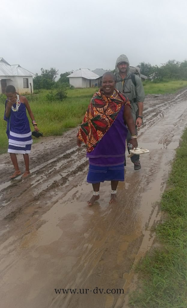 Pour l’instant il ne pleut pas mais partout d’immense flaques et la présence de boue nous confirme que nous sommes bien en saison des pluies ! Puis nous prenons notre repas dans un des bouis-bouis, et voyons passer des maasai. Je me dis « tiens, c’est marrant, si ça se trouve il connaissent « notre » famille ». Nous dégustons notre viande de chèvre et notre « ugali » qui est une pâte blanche faite de farine et d’eau dont il faut faire des boulettes en la malaxant dans la main, puis la tremper dans de la sauce. On se régale, et tout ça ne coûte que l’équivalent d’un euro ! On se questionne un peu sur le lendemain… Comment va t on faire pour trouver le village… A qui demander… Que va t on trouver au bout ? Andrew m’avait proposé de venir nous chercher à Dar Es Salaam, mais j’avais refusé, je ne voulait pas qu’il fasse un tel déplacement et puis on pouvait bien se débrouiller ! Mais là, je me dis que je vais quand même lui envoyer un message histoire de lui dire que nous sommes bien là, et lui demander la direction. Nous en sommes là de nos réflexions, quand… j’aperçois comme un mirage la silhouette imposante de Selina ! Je n’en crois pas mes yeux, elle est là, à 20 mètre de moi ! Je me lève, elle m’aperçoit, elle crie, court et saute dans mes bras…. On se donne l’accolade un bon moment tout en riant. Magnifique moment, d’autant plus qu’il était totalement imprévu.