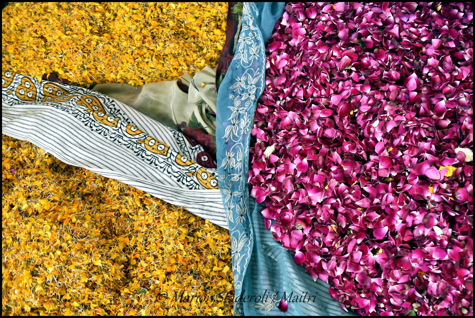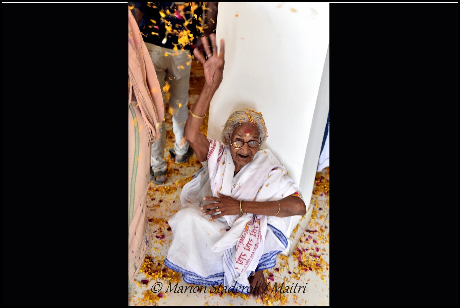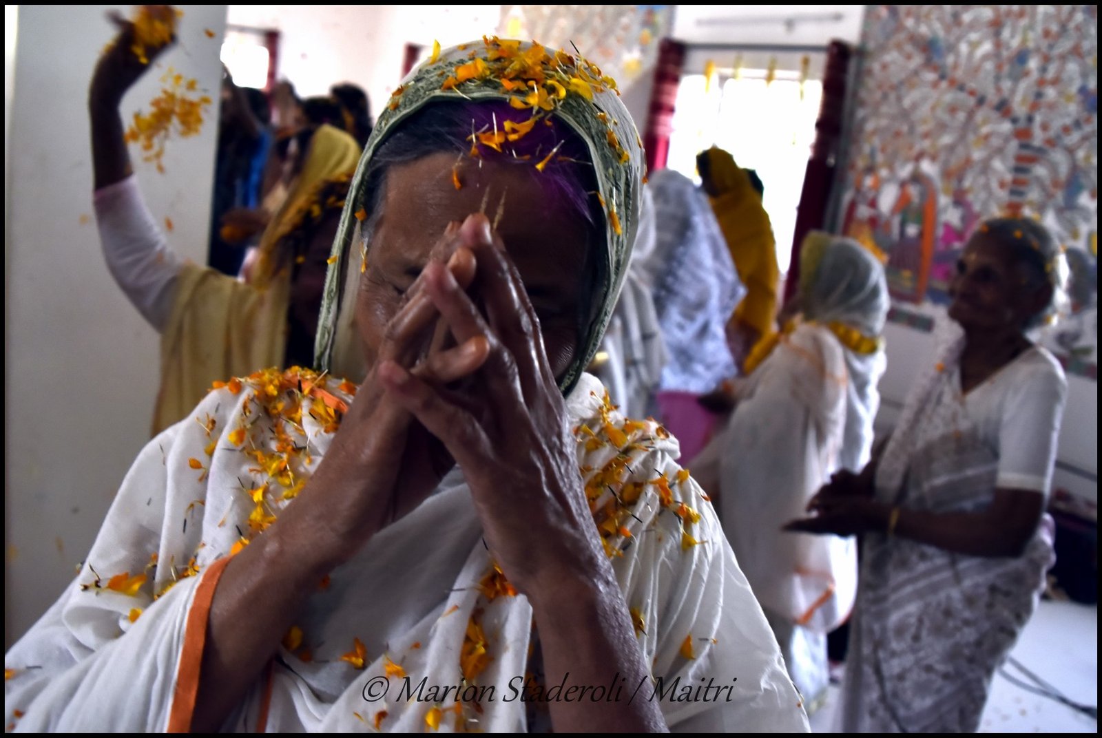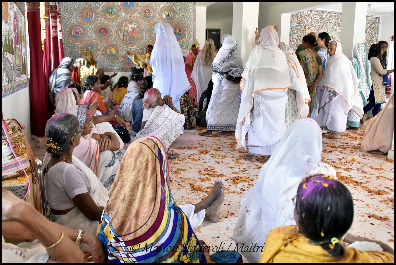 Le cortège est ensuite entré dans l’ashram et là durant environ une bonne heure ce fut la fête ! Musique, chants, danses, on jette des fleurs tout le monde rit et s’amuse. J’ai adoré voir ces vieilles femmes qui ressemblaient alors à de petites filles coquines. C’était juste génial, du bonheur à l’état pur… Certaines étaient vite fatiguées et suivaient la fête assises au sol et d’autres avaient l’énergie pour danser encore et encore. Elles étaient aux anges quand je les prenais par les mains et dansais avec elles.