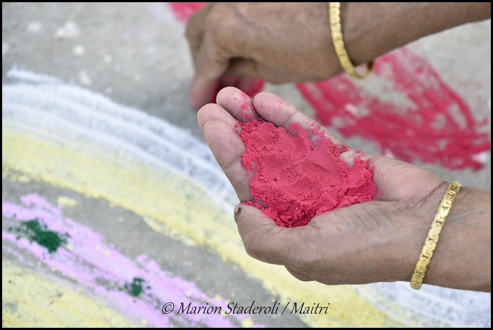Ensuite nous avons assisté aux préparatifs de Holi. Des pétales de fleurs ont été rassemblées (dans l’ashram on utilise très peu de pigments en poudre et pas du tout d’eau colorées qui tâches vraiment trop) et devant la porte, des mandalas ont été dessinés avec ces mêmes poudres colorées.