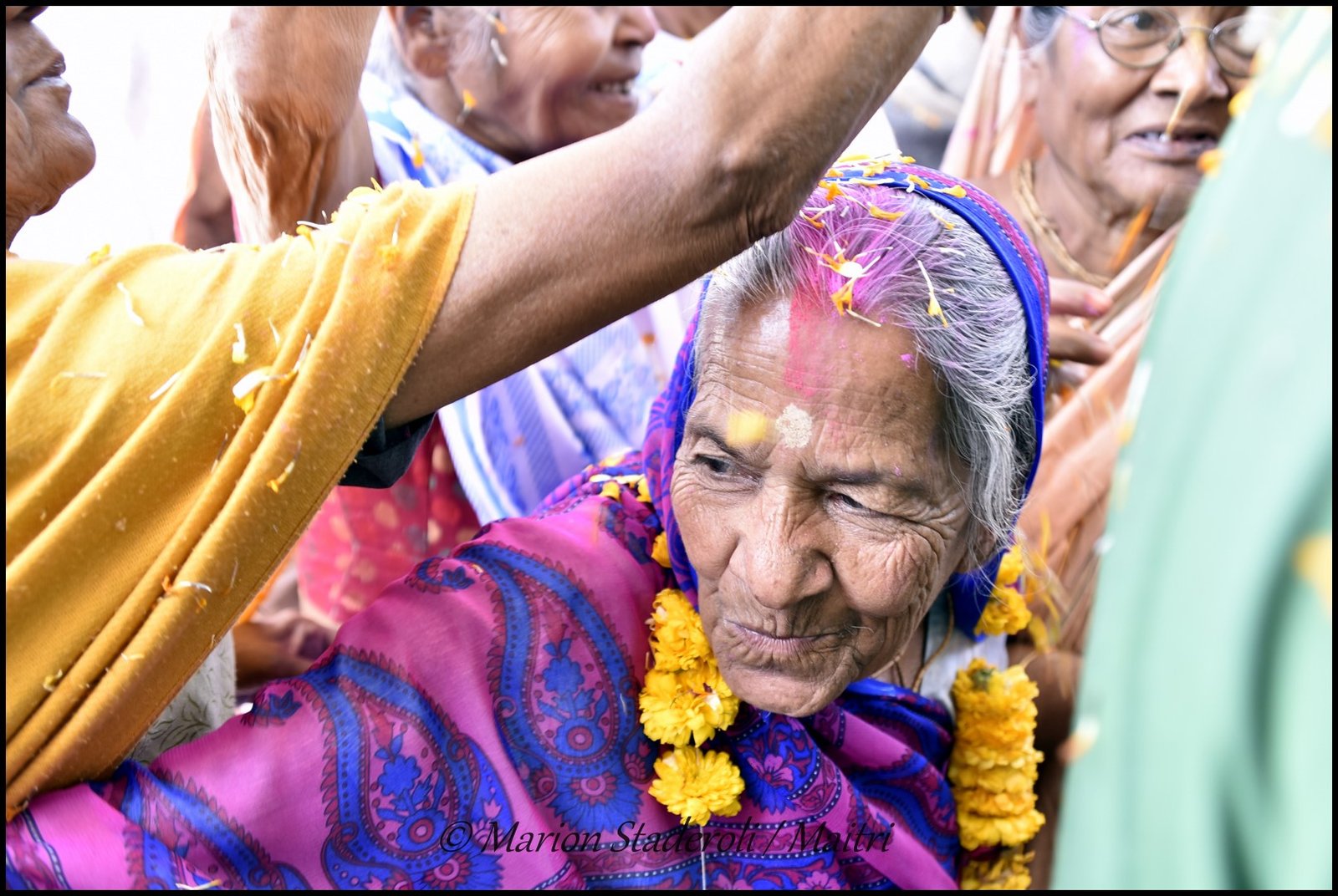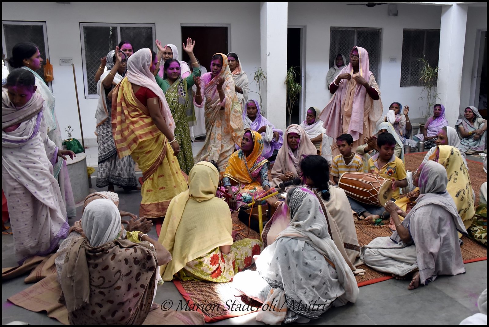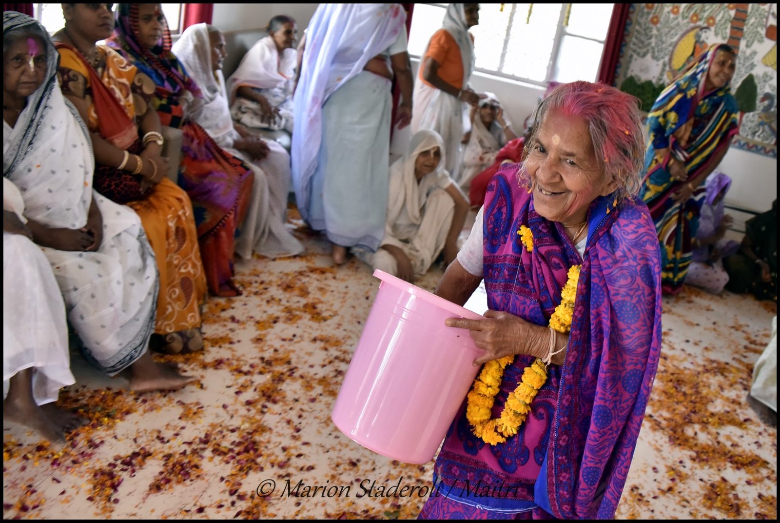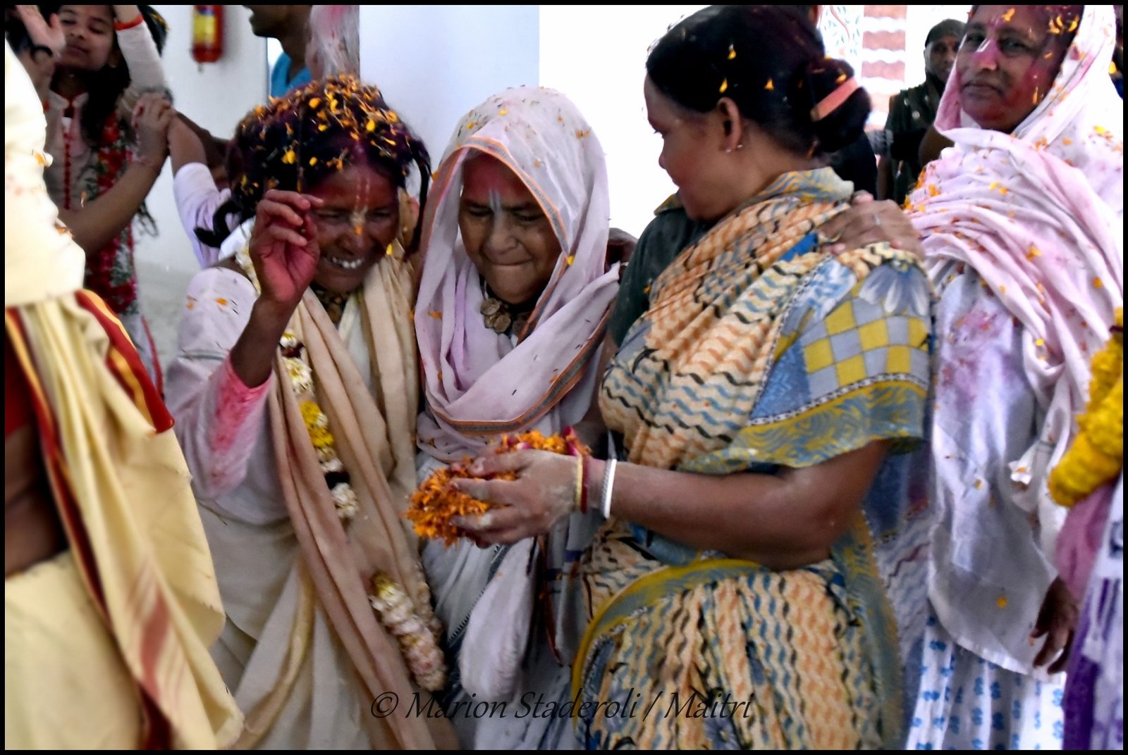 Au fur et à mesure que la matinée avançait l’ambiance devenait de plus en plus festive. Il y avait de la musique et quelques veuves commençaient à danser et à s’amuser. Les plus turbulentes essayaient de voler un peu de poudre pour la jeter à la tête des copines (et se faisaient gronder ensuite!) Je leur ai fait des photos et elles étaient toutes ravies. J’ai repéré les plus souriantes et les plus câlines, elles sont adorables, et d’autres sont plus réservées mais dans l’ensemble l’humeur étaient bien joyeuse.