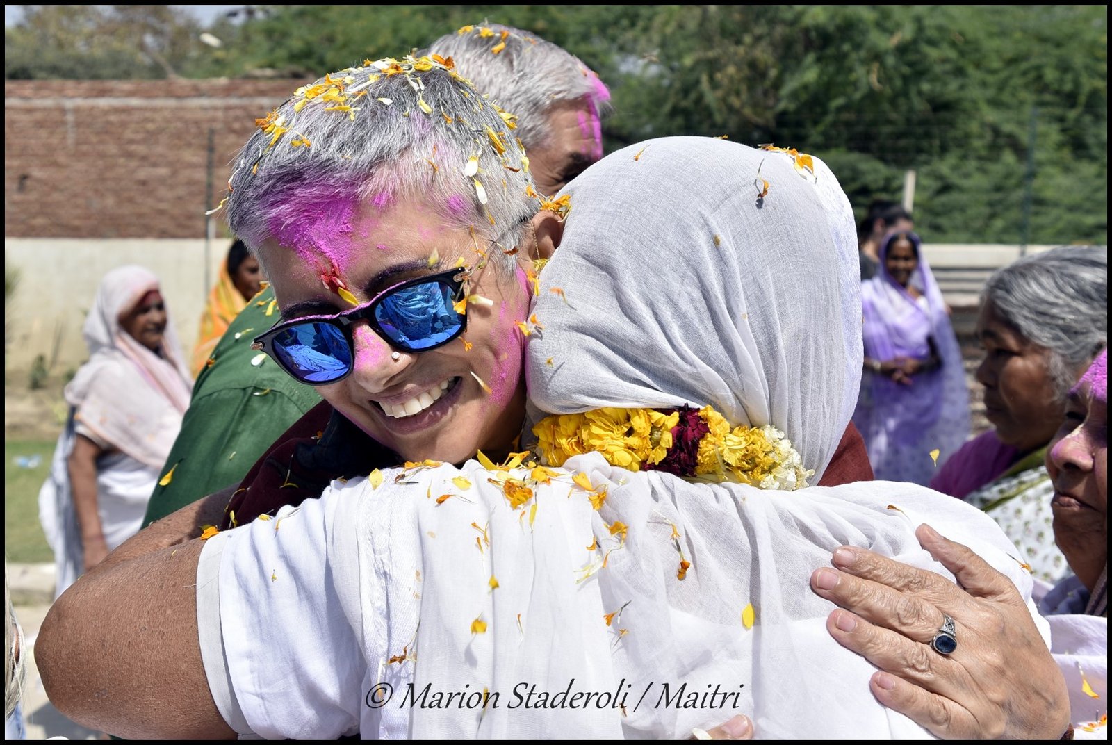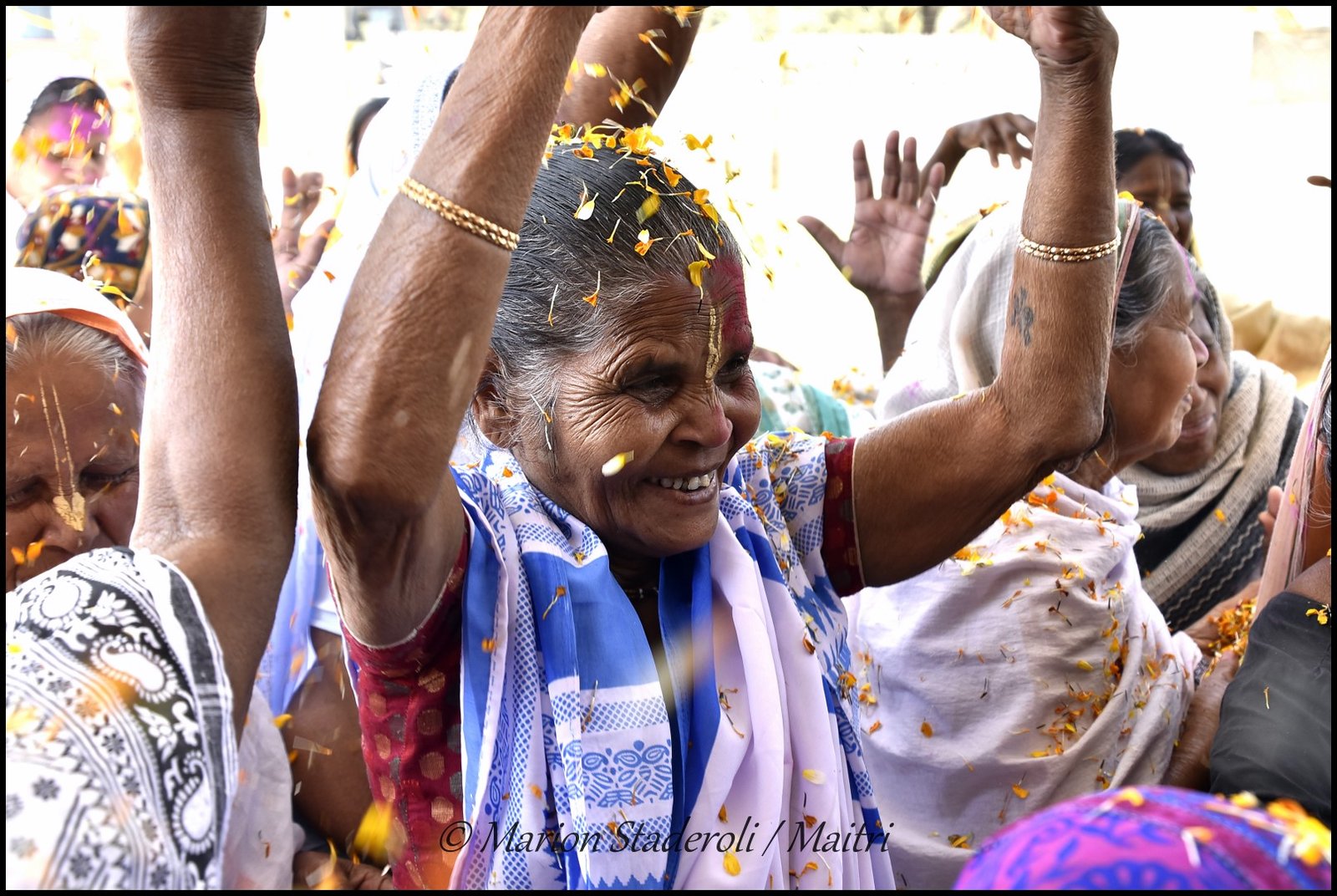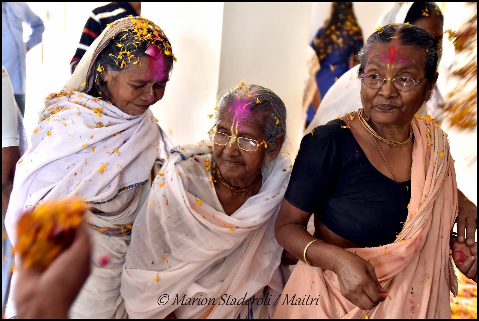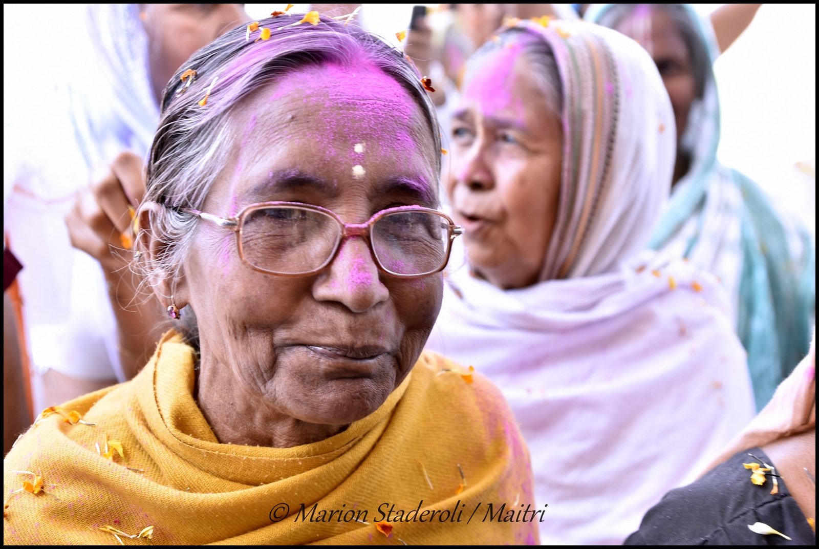 Au fur et à mesure que la matinée avançait l’ambiance devenait de plus en plus festive. Il y avait de la musique et quelques veuves commençaient à danser et à s’amuser. Les plus turbulentes essayaient de voler un peu de poudre pour la jeter à la tête des copines (et se faisaient gronder ensuite!) Je leur ai fait des photos et elles étaient toutes ravies. J’ai repéré les plus souriantes et les plus câlines, elles sont adorables, et d’autres sont plus réservées mais dans l’ensemble l’humeur étaient bien joyeuse.