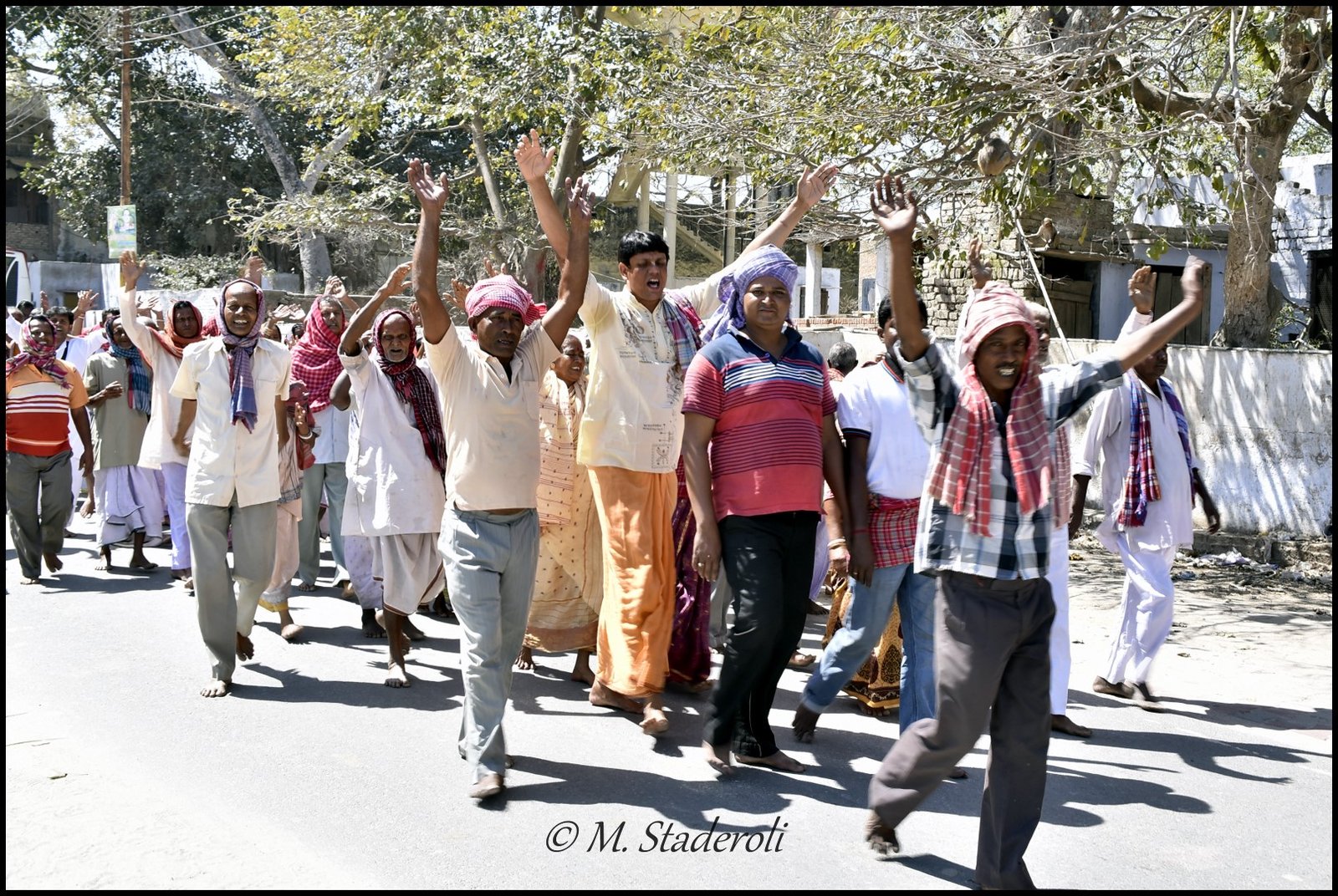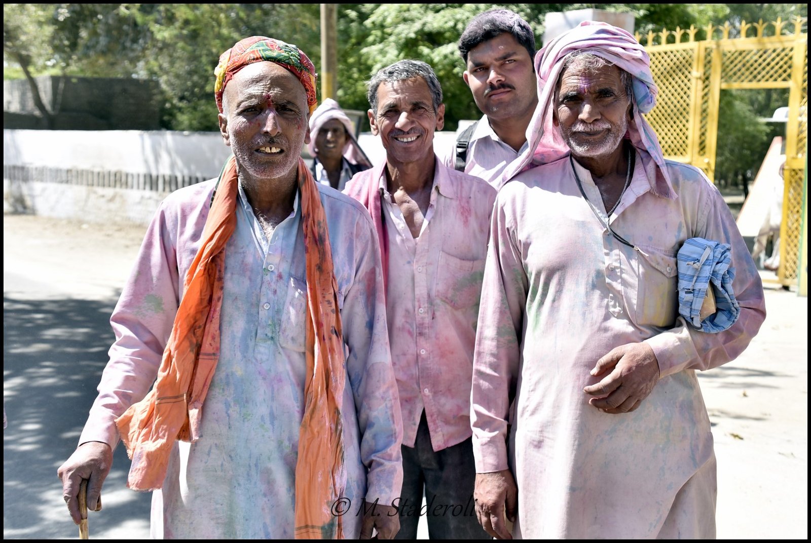 Pour cette dernière journée nous n’avions pas de programme défini. Rester à l’ashram ? Sortir « voir » Holi au risque de nous retrouver en pleine cohue ? Finalement à force d’entendre des chants venant de la rue nous avons décidé de sortir, d’autant plus qu’il nous fallait absolument trouver un taxi pour le lendemain (chose que Yadosha nous avait annoncée comme impossible à cause de Holi!). Une fois devant le portail nous avons simplement suivi un des nombreux groupes qui passaient sans savoir où nous allions. Pour Holi les hindouistes défilent pieds nus en disant des mantras ou des « radhe-radhe » ou bien « Hare krishna », si j’ai bien compris ils font une sorte de pèlerinage de 20km. Sur le chemin d’autres les aspergent de couleurs. Nous avons marché un moment découvrant une partie de Vrindavan. On voit bien que le coin est plutôt pauvre, il y a beaucoup de personnes qui mendient sur le bord de la route (dont des sadhus et des veuves) . Il n’y a rien de spécial à voir si ce ne sont les très beaux temples qui attirent de plus en plus de touristes . Nous avons fini par rejoindre ce que nous avions vu sur un plan comme le « taxi stand ». Nous y avons trouvé quelques petites agences de tourismes et transport et avons pu réserver un taxi non sans mal car les gens ne parlent pas trop anglais ! Ce coin là était animé et nous avons essuyé quelques bombes à eau et jets de poudre ! Heureusement que j’avais emballé mon appareil dans un plastique. Il n’y avait pas foule, les gens se déplacent par petits groupes et l’ambiance est vraiment bon enfant. Les gens croisés étaient très sympas, ils nous souhaitaient un « joyeux Holi » et plusieurs ont voulus se photographier avec nous et d’autres que je les photographie.