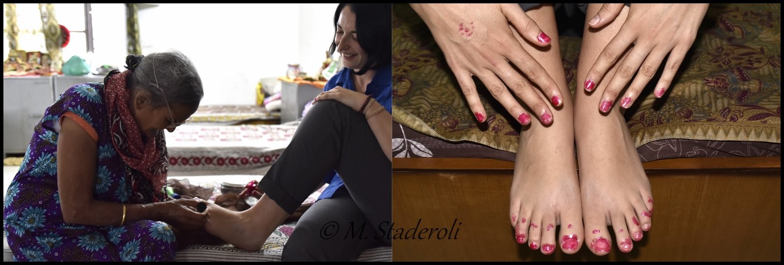 Puis nous avons vu une mamie qui me plaît trop car je trouve qu’elle a une tête coquine avec ses lunettes doubles foyers tenues par un élastique. En plus elle est super moderne c’est la seule qui parfois ne porte pas de sari. Non seulement elle met de la couleur et en plus elle porte des robes, je crois que c’est vraiment rare d’oser faire ça! Donc nous la voyons, elle nous parle, on rit, dialogue de sourd, comme d’hab. Puis je lui montre que j’ai un vernis à ongles et propose de lui en mettre. Elle m’attrape, m’emmène dans sa chambre, me fait asseoir sur son lit et attrape le flacon. Heu… Ah oui en fait elle veut m’en mettre à moi ! Bon ok. Quelle partie de rigolade ! Je pense que ses doubles foyers ne sont pas suffisants car il y en avait autant à côté de mes ongles que dessus. Elle était morte de rire. Elle n’arrivait même pas à viser pour tremper le pinceau dans le flacon. A la fin elle voulait même me faire un bindi sur le front ! Comme je protestais elle avait l’air de me dire « c’est pas grave après tu te laves ». Quel bon moment j’ai passé, elle est trop belle et trop géniale cette mamie.