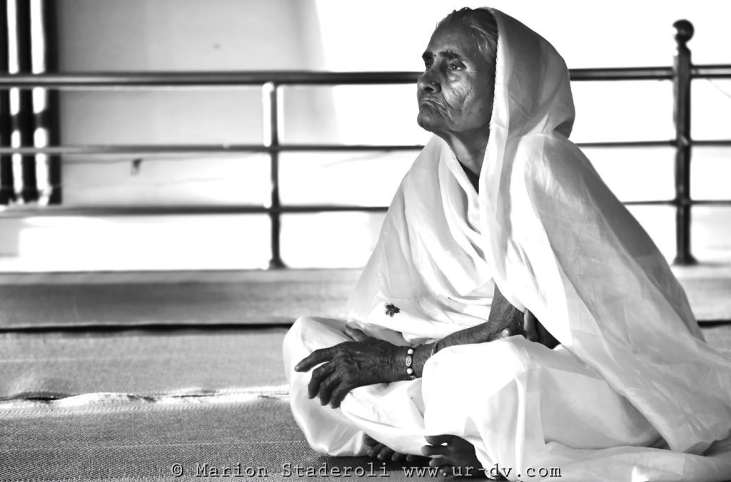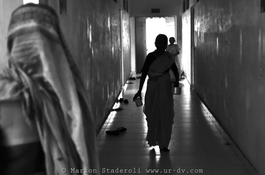 Elles ont pu, dans cet ashram, retrouver un peu de calme et de paix. J’ai l’impression qu’elles ont en quelque sorte trouvé là une nouvelle famille. Elles s’épaulent et se soutiennent pour certaines, se donnent la force de continuer, même si je sais que leur cœur est toujours lourd, car tout cela ne peut effacer le poids de leur destin. On les voit sourire tout de même, prier ensemble et parfois se taquiner. Je pense qu’elles ont, pour les plus optimistes, de vrais moment de joie dans cette maison. Il y en a même quelques unes (peu) qui osent porter un sari coloré.