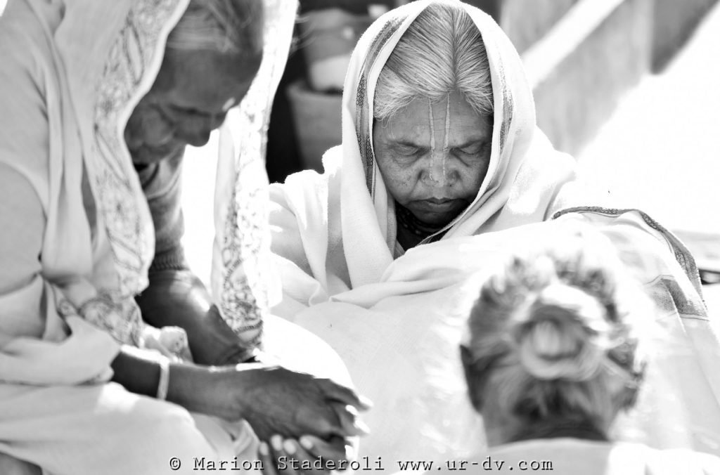Dès 5H30 du matin l’ashram s’est animé, les clochettes de prières tintent et ça piaille. Nous sommes descendus vers 7H dans la salle commune. Baba nous a tout de suite proposé du thé . Une grand-mère était assise devant l’hôtel religieux commun et lisait un recueil de prières. Elle était trop belle toute petite avec sa peau fripée et se lunettes ! Je l’ai photographiée puis elle m’a fait signe de venir m’asseoir au sol près d’elle. Là elle m’a fait une sorte de bénédiction, puis elle a commencé à me parler avec un doux sourire. Bien sûr je ne comprenais rien , mais ça ne l’a pas empêchée de continuer quelques minutes, les yeux dans les yeux. J’avais beau ne pas la comprendre son regard me disait des choses. Un moment vraiment émouvant et surréaliste.