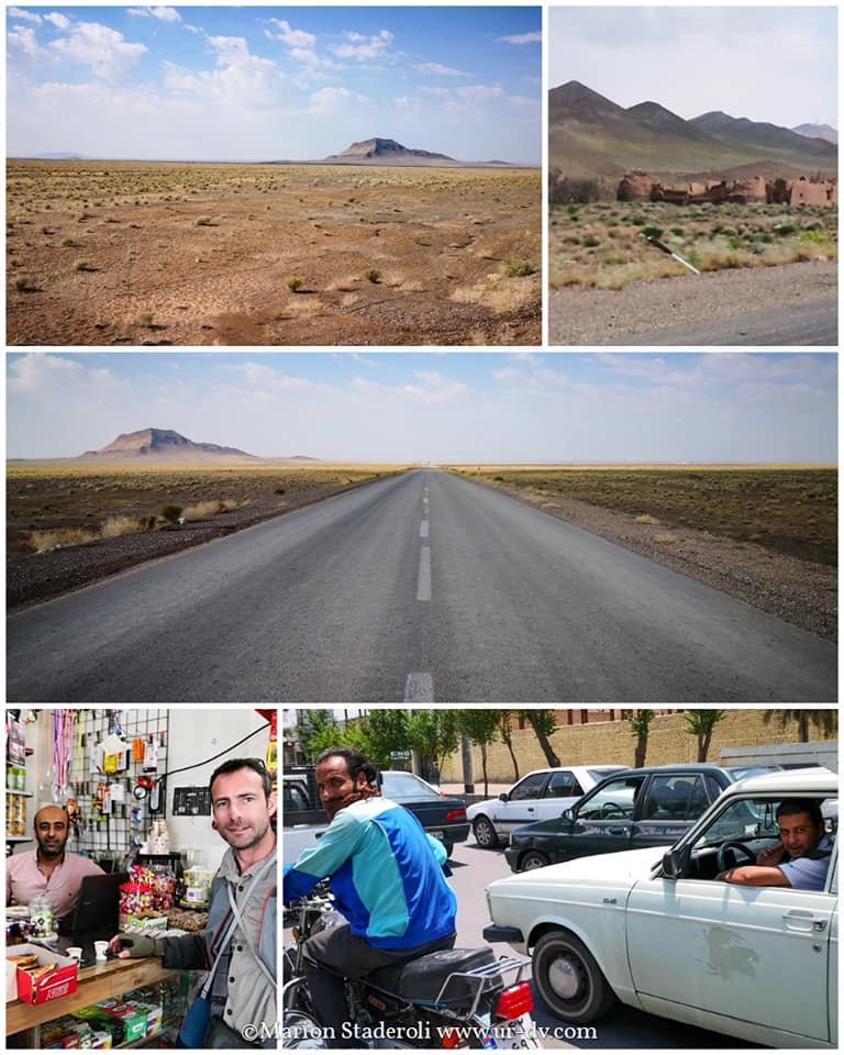 Aujourd’hui nous avons roulé vers Yazd ,4h, 200km plus loin (ref hotel en bas) . Nous devions emprunter une petite route avec certains points d intérêt, malheureusement à cause de l pluie cette nuit une zone en cuvette s est remplie d eau et la route était fermée… Obligé de prendre la voie rapide, nul! C est languissant… Heureusement qu à chaque arrêt et même par les vitres des voitures les gens nous abordent, nous sommes des curiosités à cause de la moto. On a du nous proposer 5 fois de venir boire un coup 😁d ailleurs le vendeur du magasin sur une « aire » est venu nous chercher pour nous offrir un café et un chocolat ❤️ A cause de ces longues routes monotones sans intérêt, nous avons pris la décision de ne pas aller jusqu’à Chiraz. Celà ferait beaucoup trop de journée à rouler… Nous préférons prendre plus de temps à chaque étape, flâner, nous imprégner et ne bouger que sur de petits périmètres.