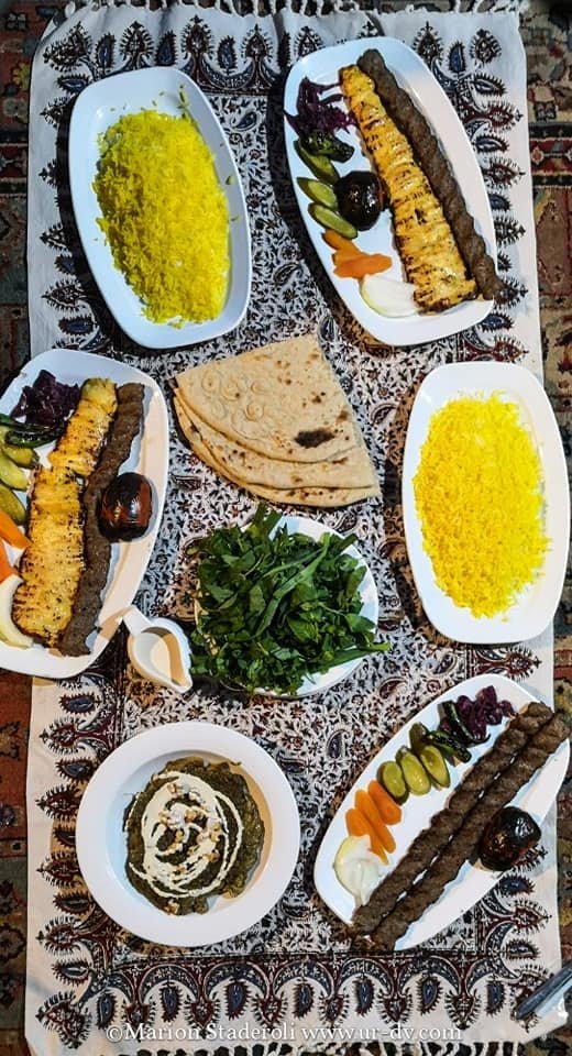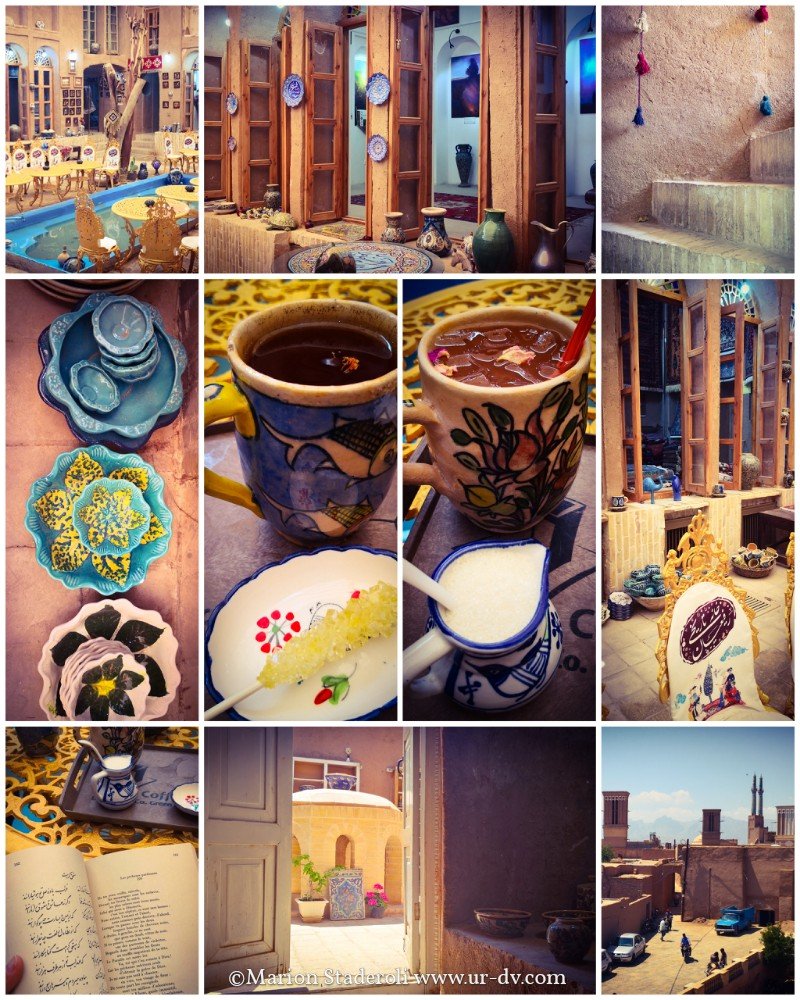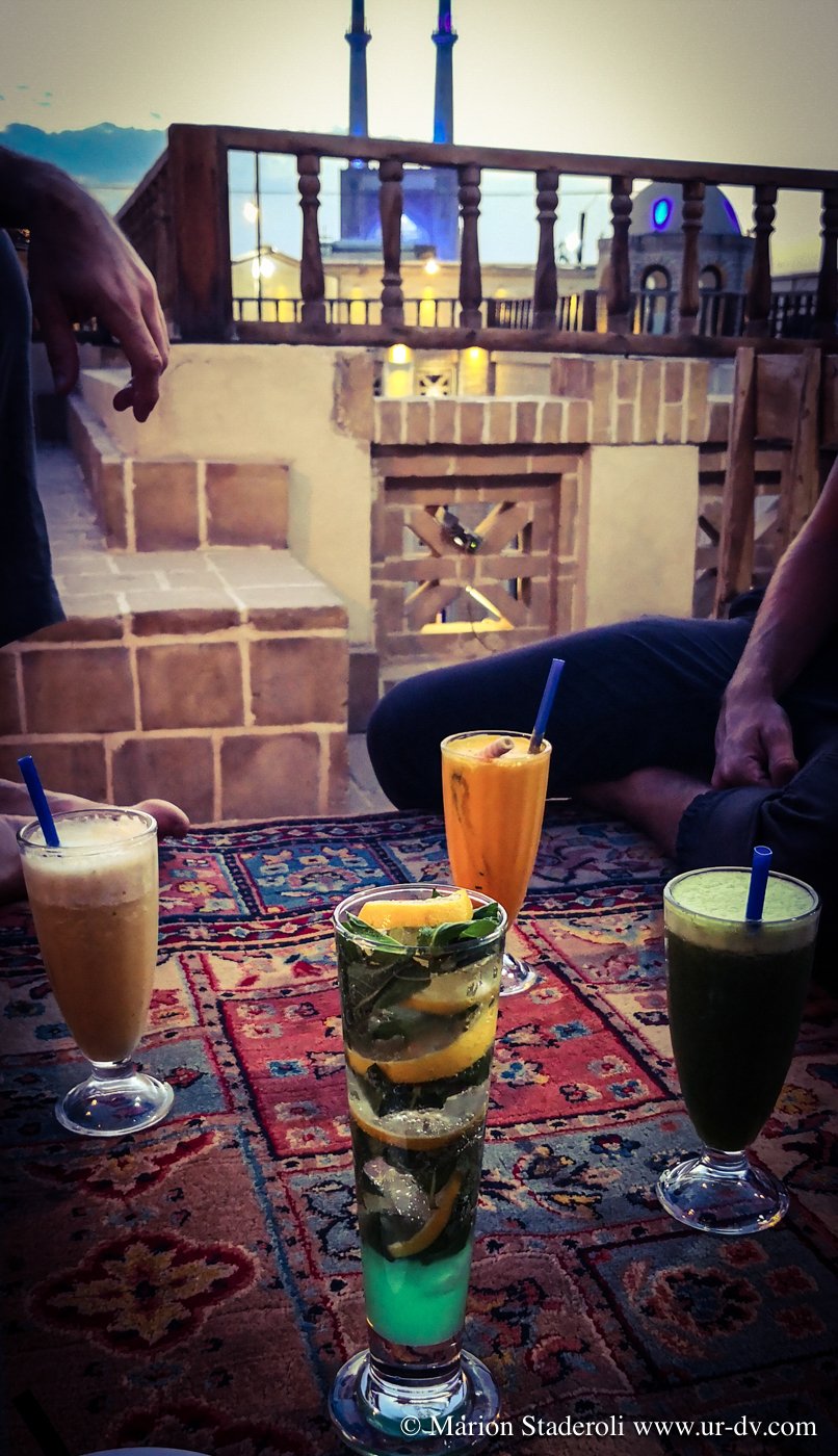 Un arrêt interessant à la « Library view point » dans une maison vieille de 250 ans. On peut y boire un verre dans la cours ou sur le toit, y acheter de l artisanat , et bien sûr y lire ou acheter des livres. On nous a fait découvrir le célèbre poète iraniens Hâfez. Les Iraniens son fans de poésie (et de littérature) il paraît que même les illettrés connaissent des vers par cœur… On a des progrès à faire en France je crois 😁