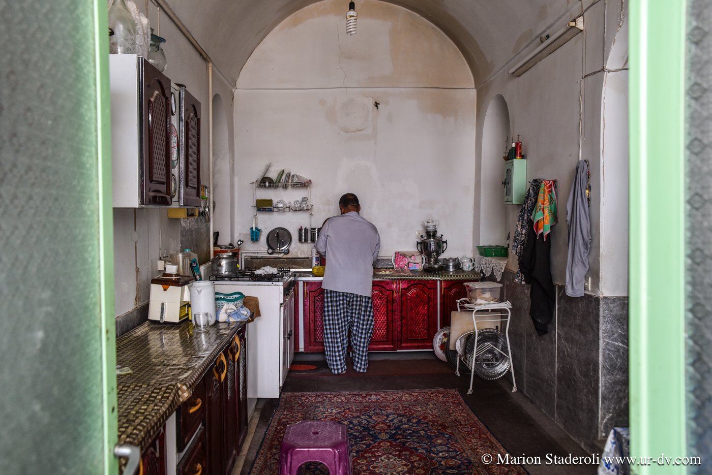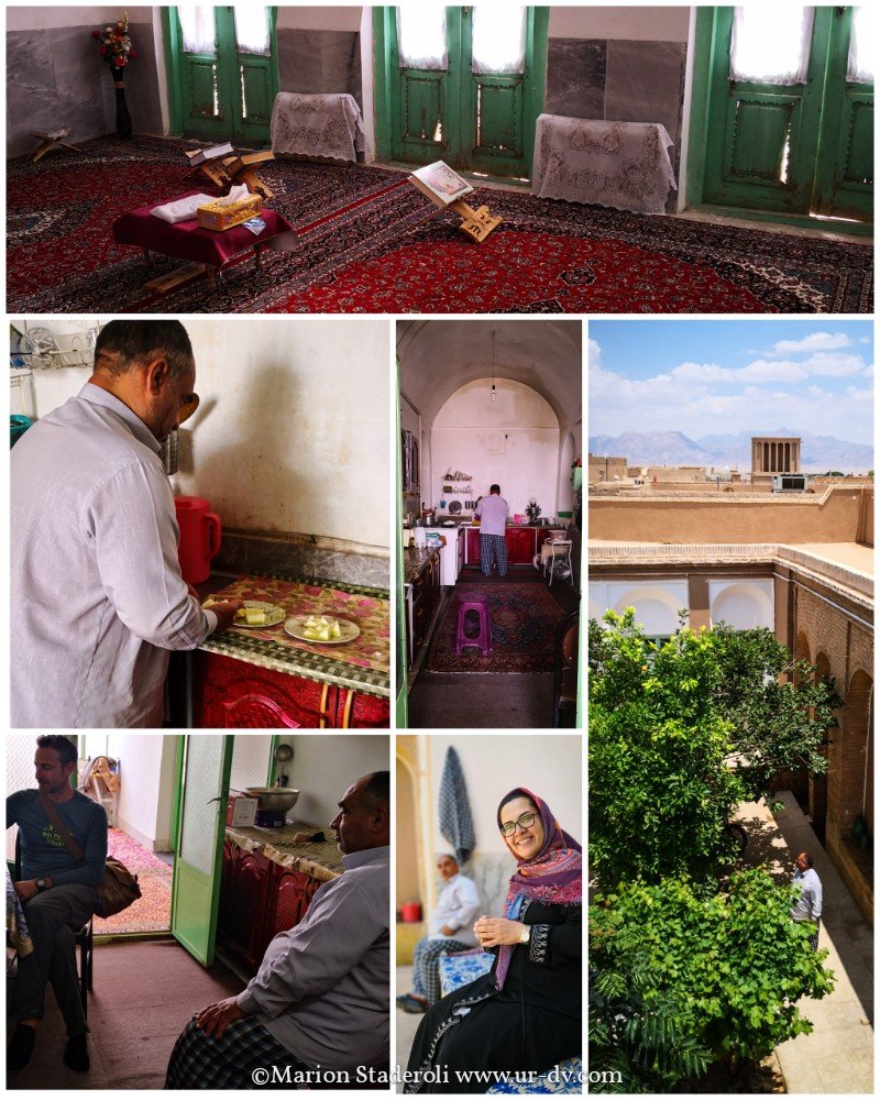 Dans la rue, nous passons à côté d un homme assis sur sa moto, on se dit bonjour, il nous baragouine quelque chose comme  » house, view,  » et fait signe de le suivre. Il part en moto et nous voilà à ses trousses ! Nous pensons qu il veut nous indiquer un restaurant mais lorsque nous passons une lourde porte en bois, nous nous trouvons dans une grande cour intérieure, autour les murs sont en partie délabrés, nous comprenons que c est une très ancienne maison, certainement la sienne. Il ne parle pas anglais mais uniquement farsi, il nous guide dans les différentes pièces et étages puis nous fait signe d aller sur le toit pour la vue. Superbe… Mais nous sommes un peu interdits…va t il nous demander de l argent pour cette visite? Lorsque nous redescendons il nous prépare des assiettes de fruits et concombres. Nous mimons « argent » histoire de savoir à quoi s attendre, mais il répond non fermement.