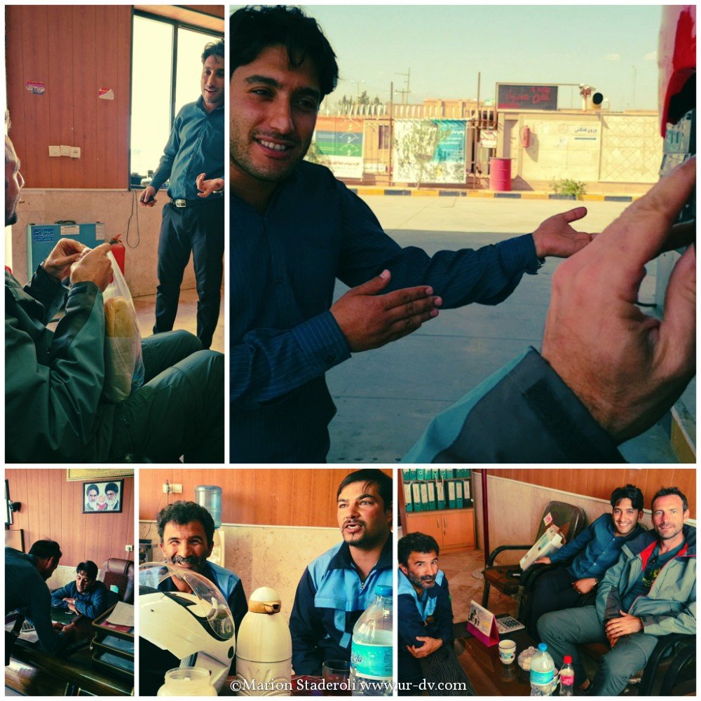 Nous venons de passer une bonne partie d aprèm dans l arrière boutique d’une station service 😂! Et de deux rencontres aujourd’hui! Alors que nous passons à la station essence, le pompiste, qui ne parle que quelques mots d anglais, nous souhaite la bienvenue en Iran, puis nous fait signe de venir boire un thé. Ok! Nous descendons de moto et nous voilà dans un bureau avec lui, puis tous les autres pompistes! Ils nous posent des questions, si nous aimons le pays, si nous sommes venus de France à moto, et le prix de l essence en France (forcément ça les intéresse lol). Au moment de les quitter, l un d entre eux, le chef (il ne porte pas l’uniforme) qui s appelle Jalal, nous fait signe d aller chez lui. Nous disons que nous devons partir, pour aller visiter un village, il dit de revenir après, il aura fini de travailler.