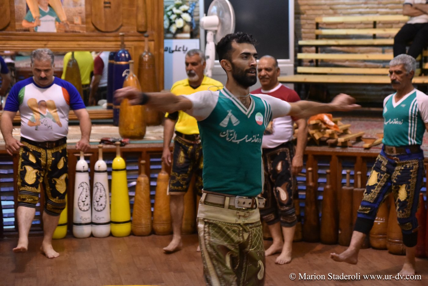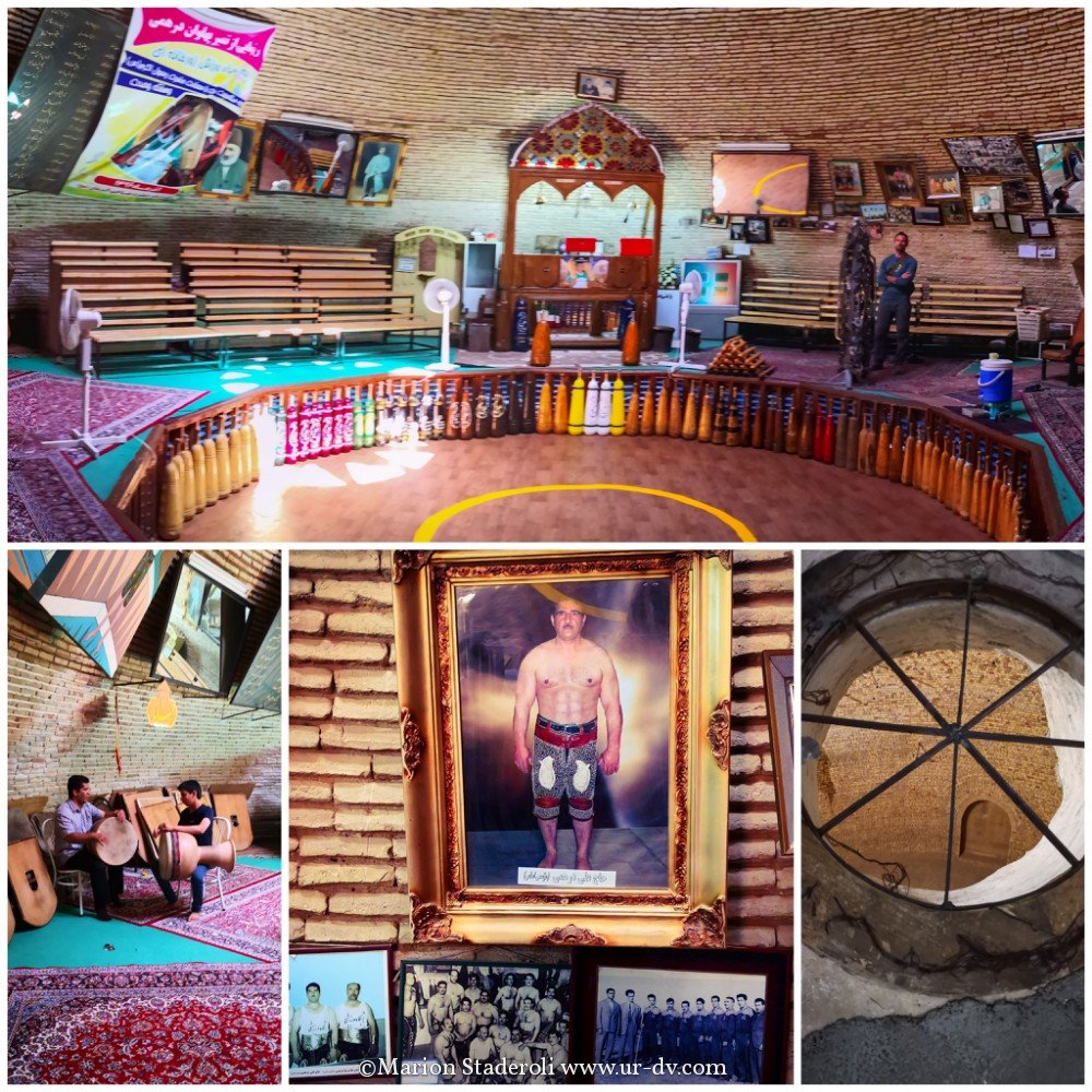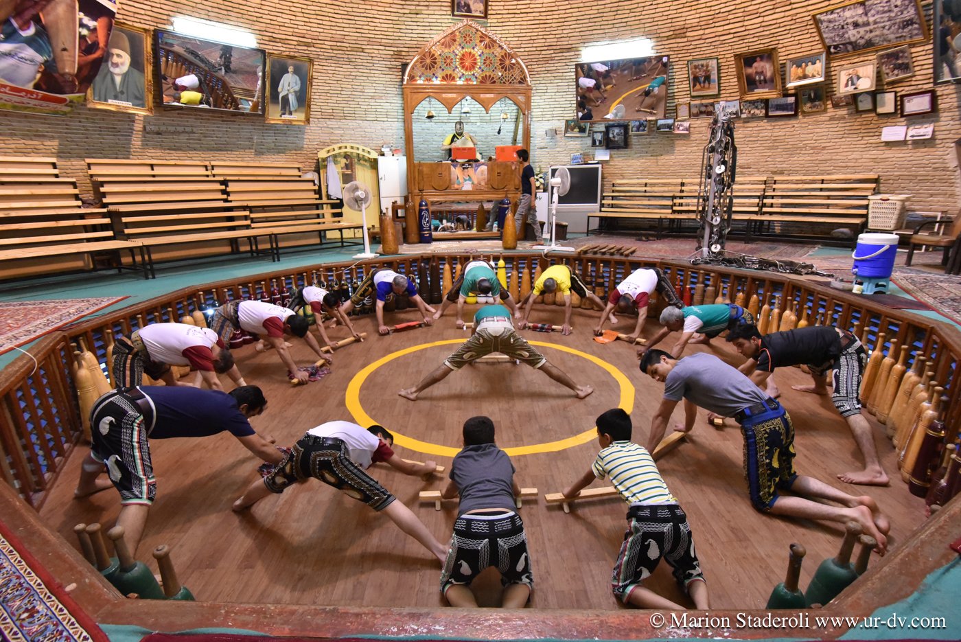 La Zurkhaneh en elle-même, se présente comme une fosse octogonale d’environ 1 m de profondeur, dans laquelle sur un sol de terre battue, s’entraînent les athlètes pahlevan. À la différence de la gymnastique pratiquée en Occident, les exercices constituent un véritable sport collectif cumulant épreuves physiques et de souplesse, rituels spécifiques, et respect de règles morales et éthiques. Les Pahlevan évoluent au rythme du son d’un tambour joué par le morshed ou guide, lui-même assis à une place surélevée dans la salle.