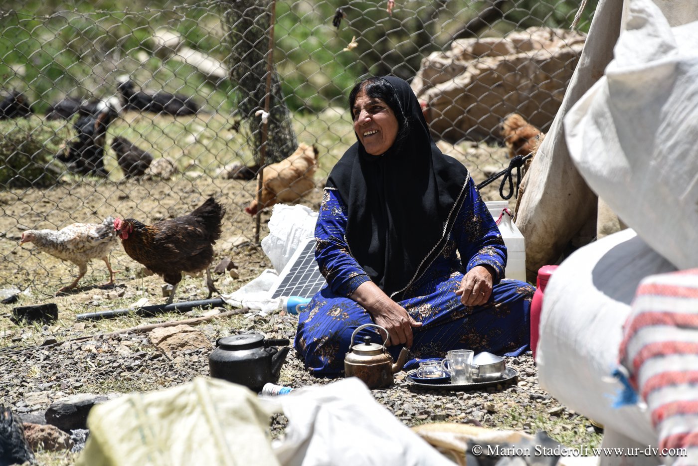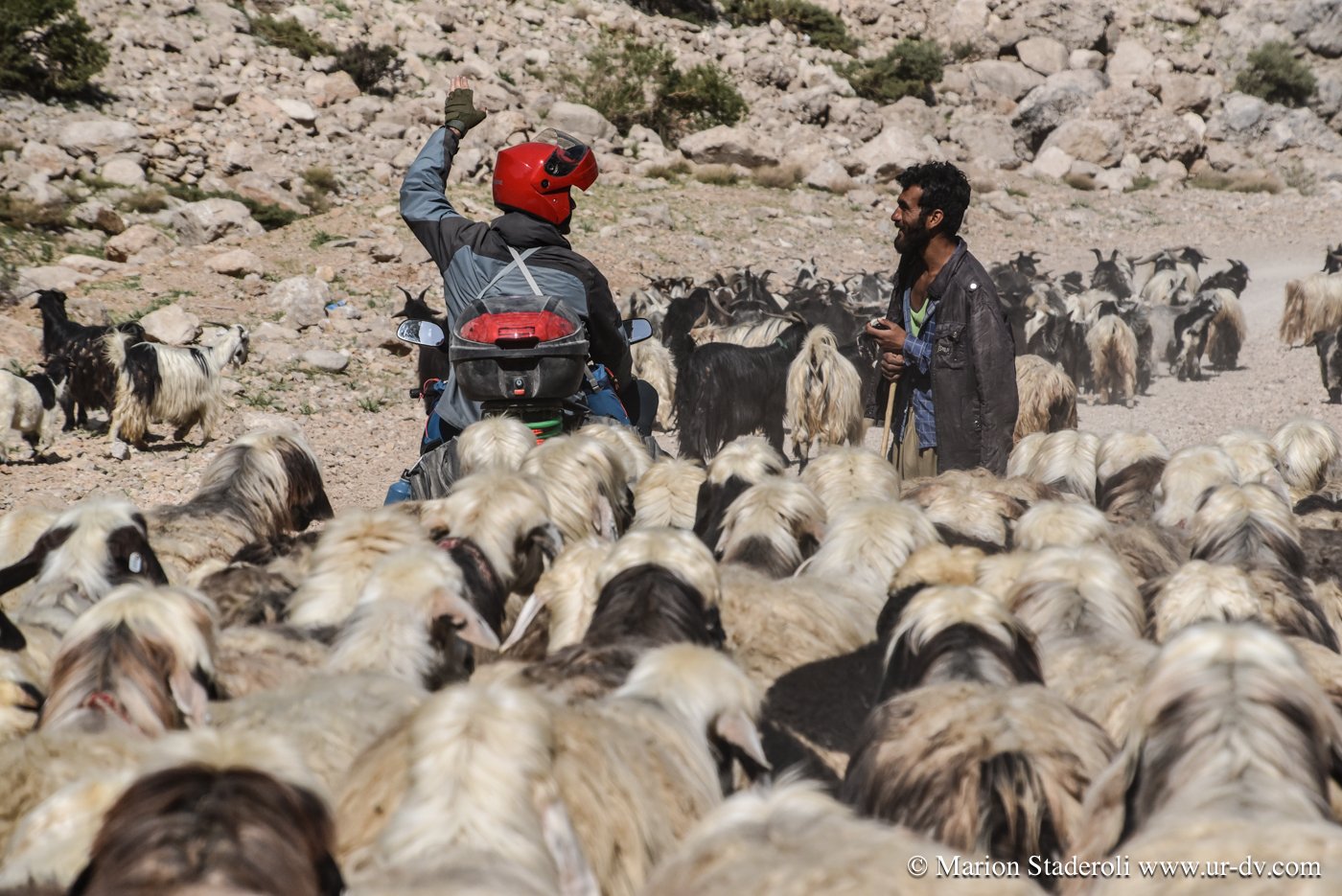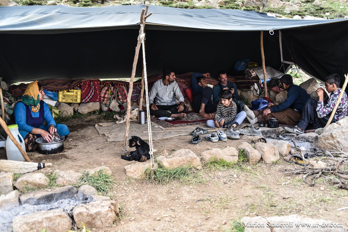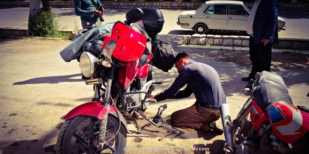 Nous réalisons que ces 100 kilomètres vont nous emmener vraiment très loin, avec un sentiment de bout du monde extrême qui ajoute à la tension psychologique. Mojtaba nous suit de loin, car nous lui envoyons un message pour le tenir au courant de notre progression à chaque moment où nous réussissons à avoir un brin de signal. Ainsi nous nous sentons moins seuls, (à ce moment là du voyage je vois ça comme un avantage, avec le fait que l’on soit attendus, mais plus tard je verrai les choses autrement). Les heures passent sans que nous ne nous en apercevions vraiment, avec toujours cette inquiétude latente de réussir à atteindre notre objectif avant la nuit… Pourtant, même si nous ne nous arrêtons même pas pour grignoter quelques biscuits, nous prenons le temps d’apprécier le trajet et n’hésitons que très peu à nous arrêter un moment, lorsque nous tombons sur une famille de nomades en train d’emballer leur campement pour la transhumance. Ce sont des instants uniques, et nous en profitons pour prendre un peu de repos, nos genoux, nos fesses et notre dos sont déjà bien fatigués. Nous sommes accueillis chaleureusement, ils semblent étonnés de nous voir là, à moto et seuls, et encore plus surpris de connaître le nom de notre destination: « c’est très loin ! » Nous nous arrêtons donc et deux jeunes qui parlent quelques mots d’anglais nous abordent, puis nous invitent à venir prendre un thé sous leur tente. Moments fantastiques, nous sommes complétement dans un autre monde, un peu fébriles mais heureux de cette chance. Une telle plénitude flotte dans l’air… on pourrait rester à des heures, juste à les regarder vivre.