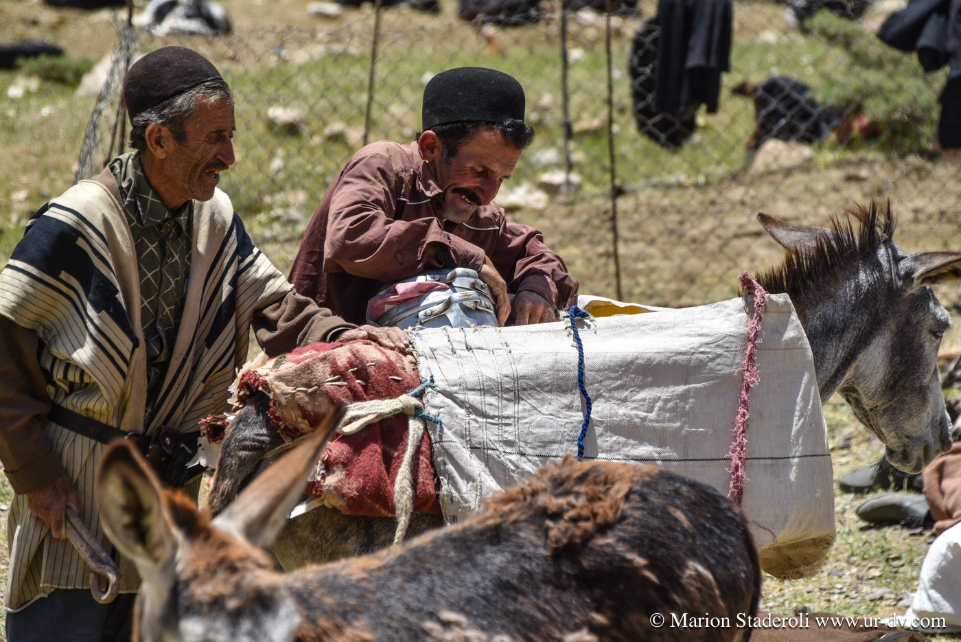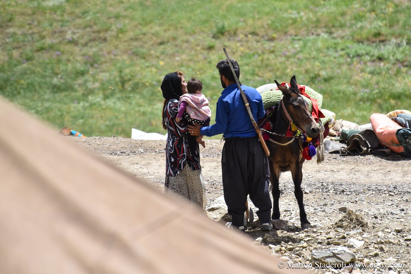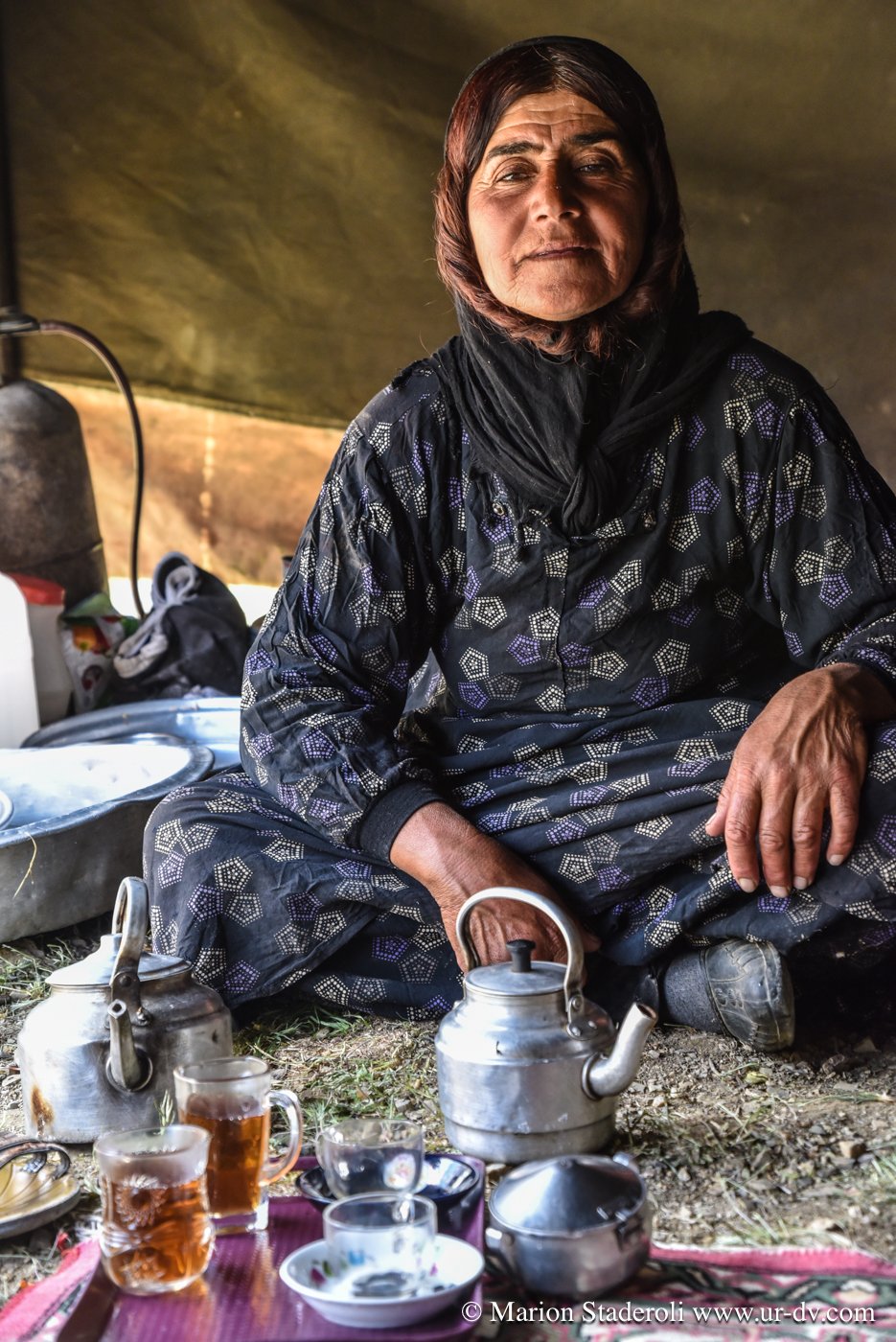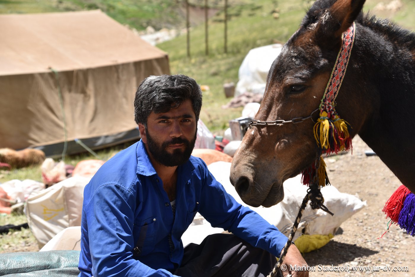 Nous réalisons que ces 100 kilomètres vont nous emmener vraiment très loin, avec un sentiment de bout du monde extrême qui ajoute à la tension psychologique. Mojtaba nous suit de loin, car nous lui envoyons un message pour le tenir au courant de notre progression à chaque moment où nous réussissons à avoir un brin de signal. Ainsi nous nous sentons moins seuls, (à ce moment là du voyage je vois ça comme un avantage, avec le fait que l’on soit attendus, mais plus tard je verrai les choses autrement). Les heures passent sans que nous ne nous en apercevions vraiment, avec toujours cette inquiétude latente de réussir à atteindre notre objectif avant la nuit… Pourtant, même si nous ne nous arrêtons même pas pour grignoter quelques biscuits, nous prenons le temps d’apprécier le trajet et n’hésitons que très peu à nous arrêter un moment, lorsque nous tombons sur une famille de nomades en train d’emballer leur campement pour la transhumance. Ce sont des instants uniques, et nous en profitons pour prendre un peu de repos, nos genoux, nos fesses et notre dos sont déjà bien fatigués. Nous sommes accueillis chaleureusement, ils semblent étonnés de nous voir là, à moto et seuls, et encore plus surpris de connaître le nom de notre destination: « c’est très loin ! » Nous nous arrêtons donc et deux jeunes qui parlent quelques mots d’anglais nous abordent, puis nous invitent à venir prendre un thé sous leur tente. Moments fantastiques, nous sommes complétement dans un autre monde, un peu fébriles mais heureux de cette chance. Une telle plénitude flotte dans l’air… on pourrait rester à des heures, juste à les regarder vivre.