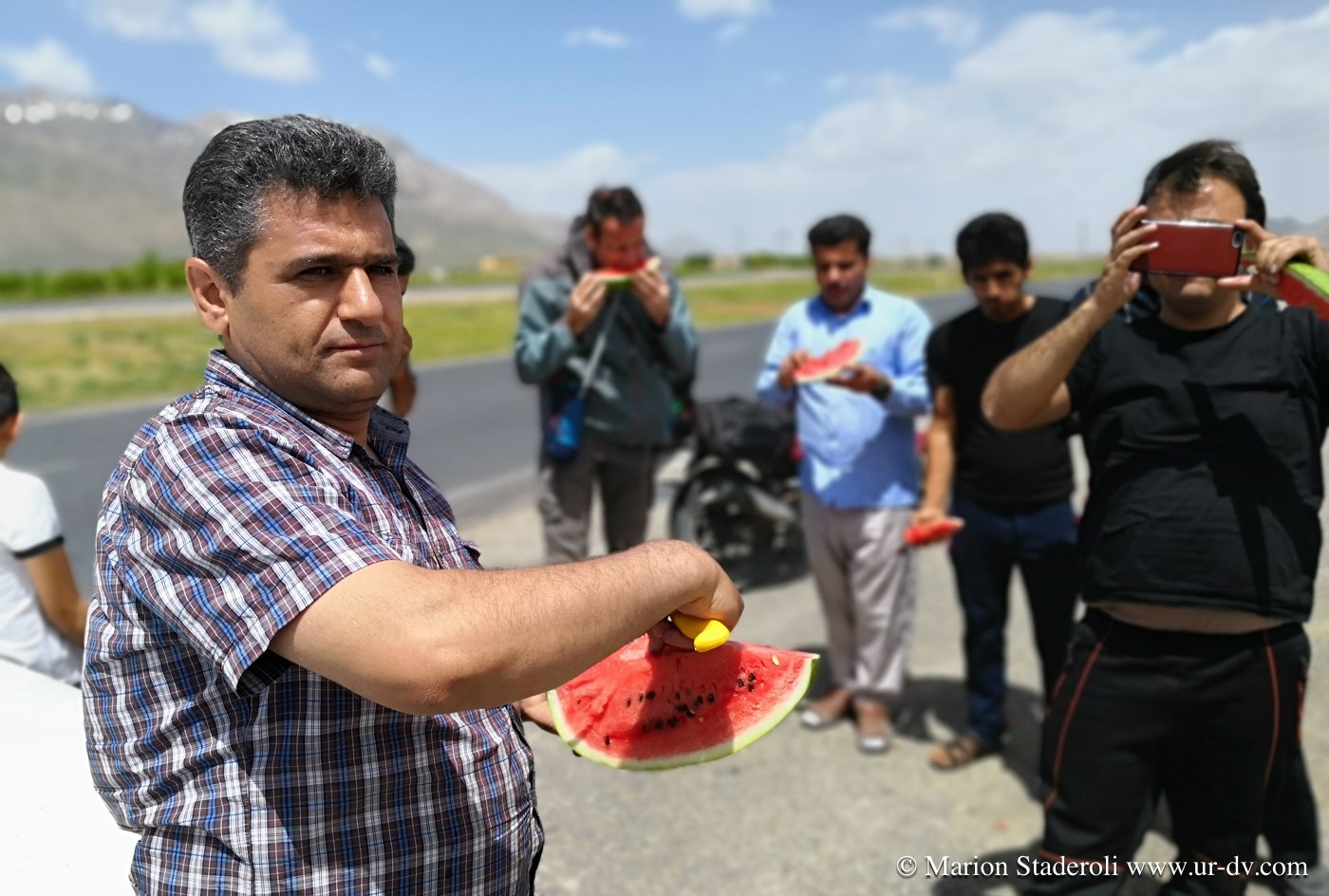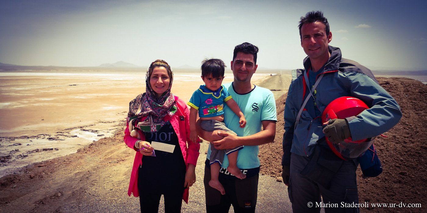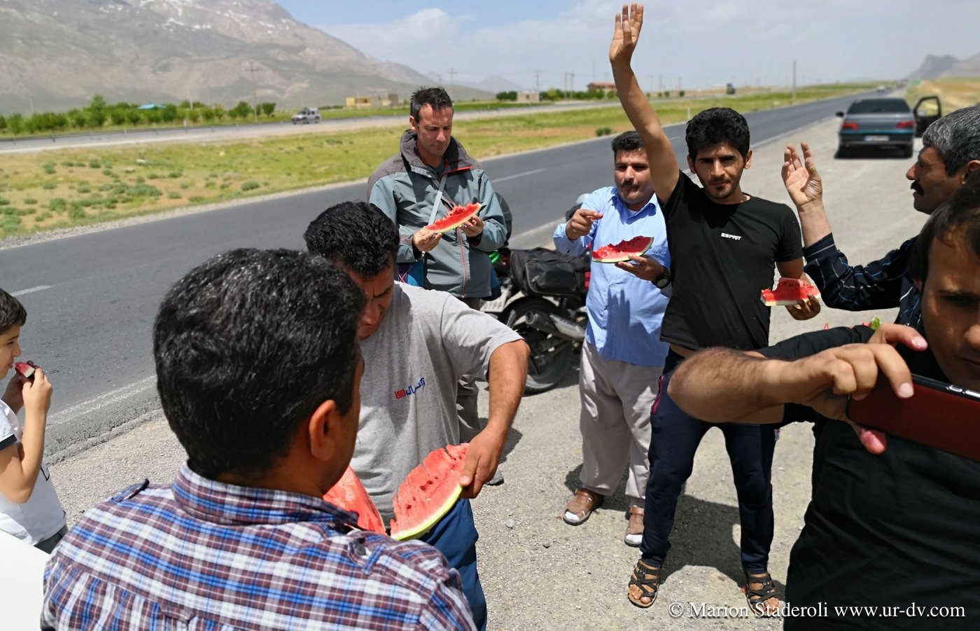 Alors que nous remontons en selle, deux voitures s arrêtent un peu plus loin. Un homme sort et vient en courant vers nous. Il nous parle farsi, on ne comprend rien, on rigole. Il crie et appelle ses amis mimant « photos ». Une dizaines de gars débarquement et nous sommes pris dans un tourbillon de joie, ça gesticule, ça rit, et c est à celui qui posera le plus de fois avec nous et notre monture ! Ils sortent une pastèque et c est la fête ! Ils prennent notre numéro, nous nous écrirons sur WhatsApp !