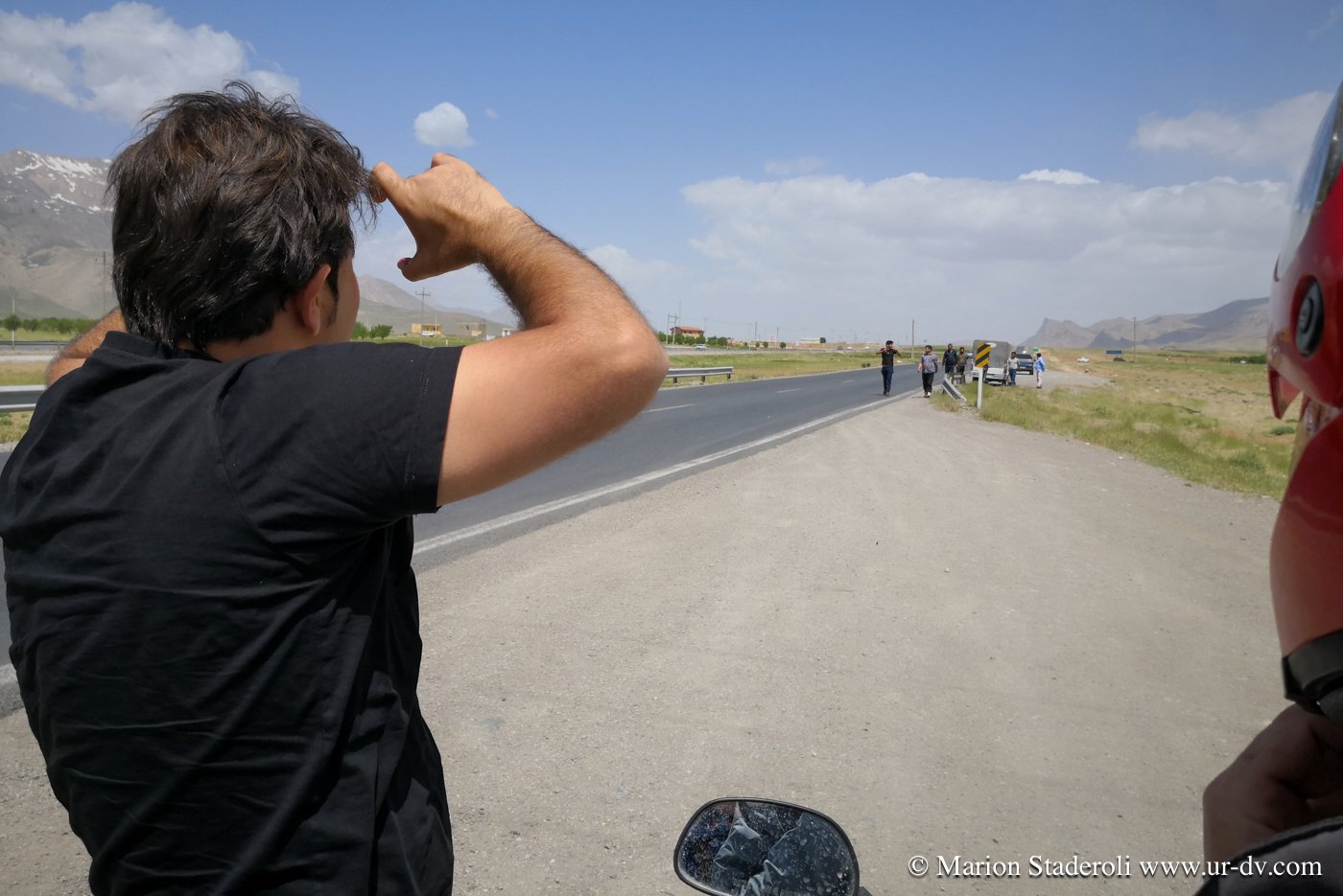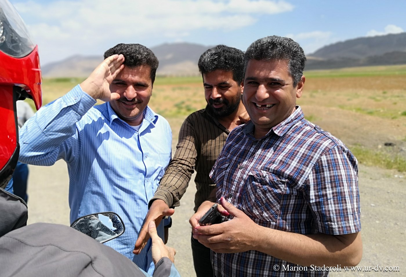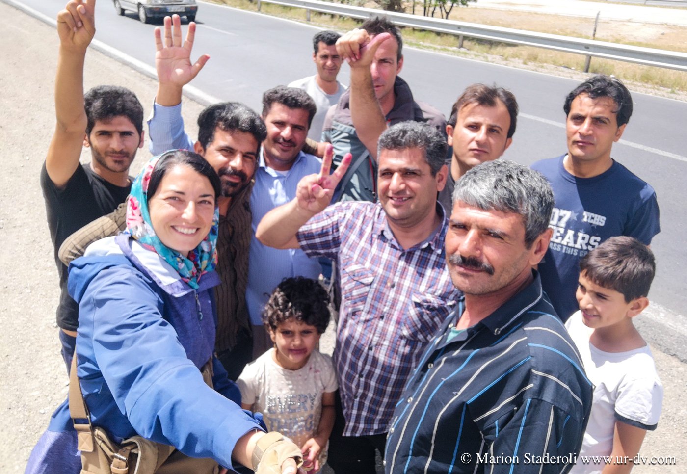 Alors que nous remontons en selle, deux voitures s arrêtent un peu plus loin. Un homme sort et vient en courant vers nous. Il nous parle farsi, on ne comprend rien, on rigole. Il crie et appelle ses amis mimant « photos ». Une dizaines de gars débarquement et nous sommes pris dans un tourbillon de joie, ça gesticule, ça rit, et c est à celui qui posera le plus de fois avec nous et notre monture ! Ils sortent une pastèque et c est la fête ! Ils prennent notre numéro, nous nous écrirons sur WhatsApp !