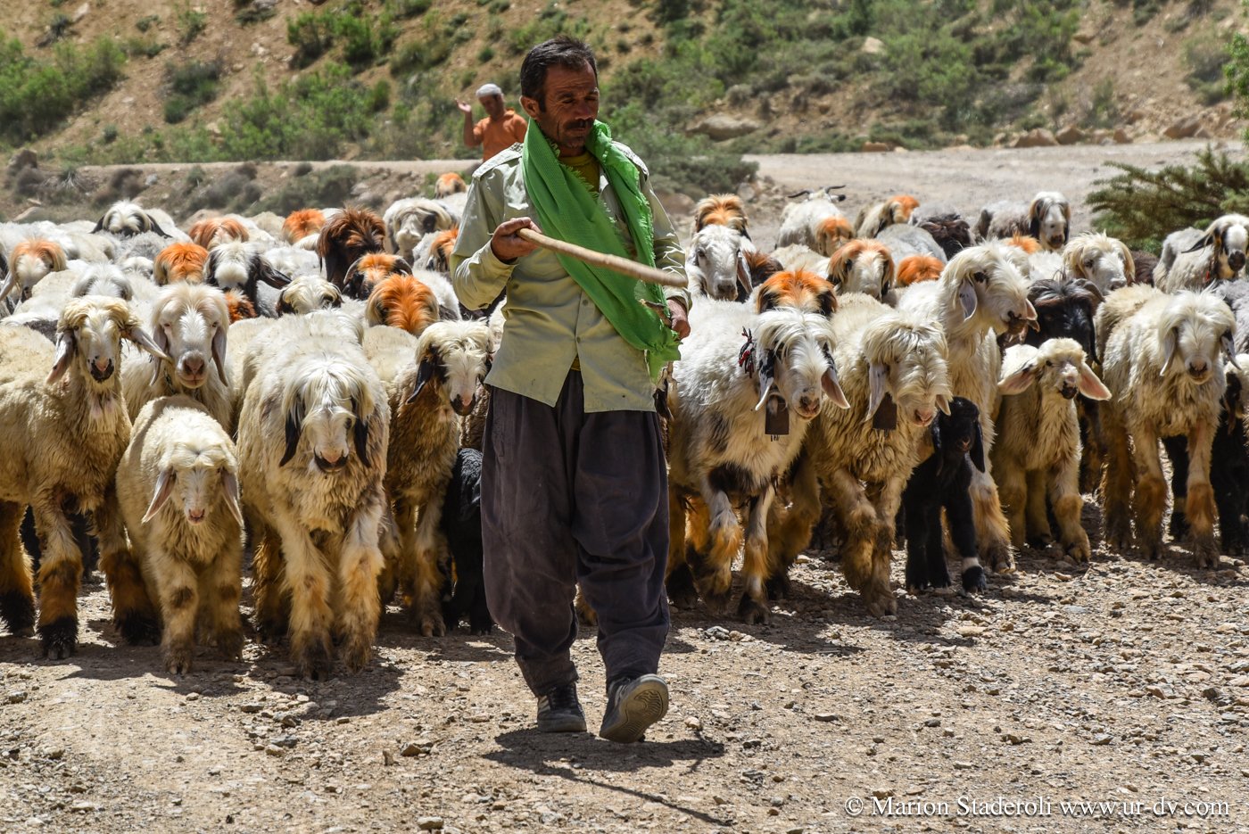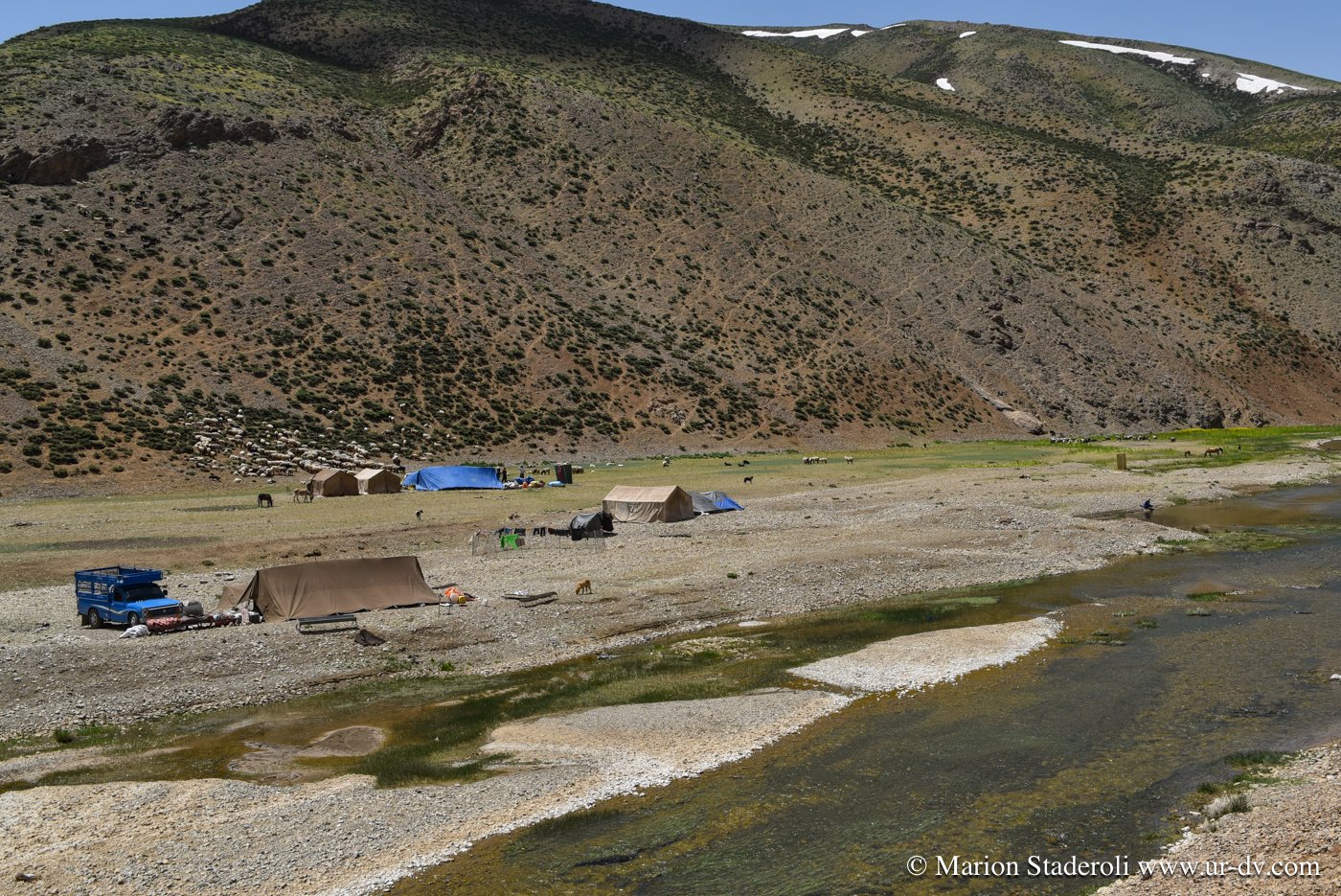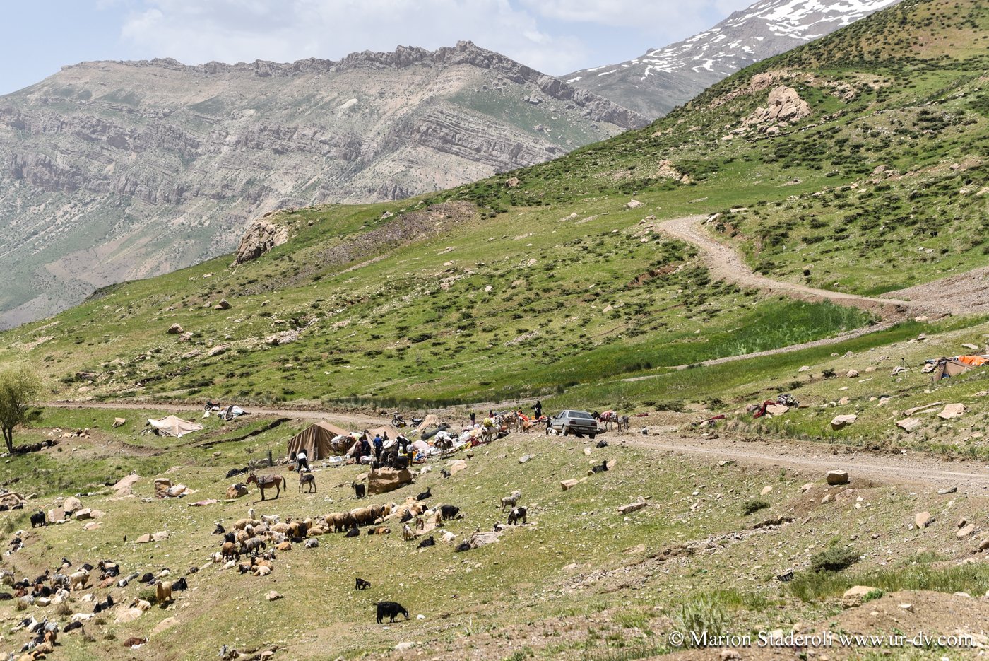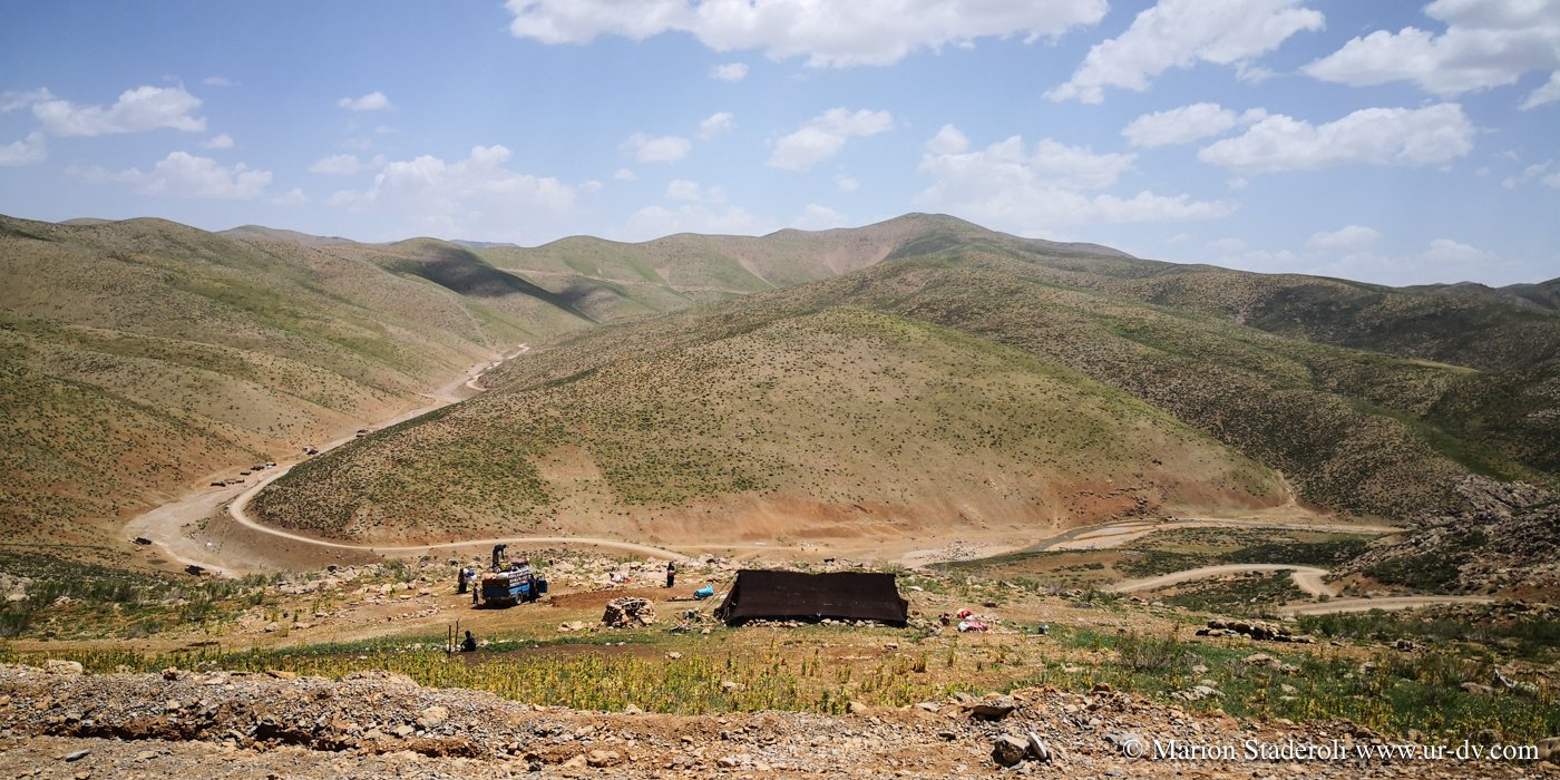 Fin de la route, nous attaquons la piste! Nous sommes dans une région où l’on peut rencontrer les nomades Bakhtiari, et j’espérais sans y croire que nous allions en croiser. Surprise, nous réalisons qu’ils sont en réalité nombreux et nous tombons sur plusieurs camps. La piste est plutôt bonne, nous progressons lentement, environ 30km/H au mieux et nous sommes confiants.