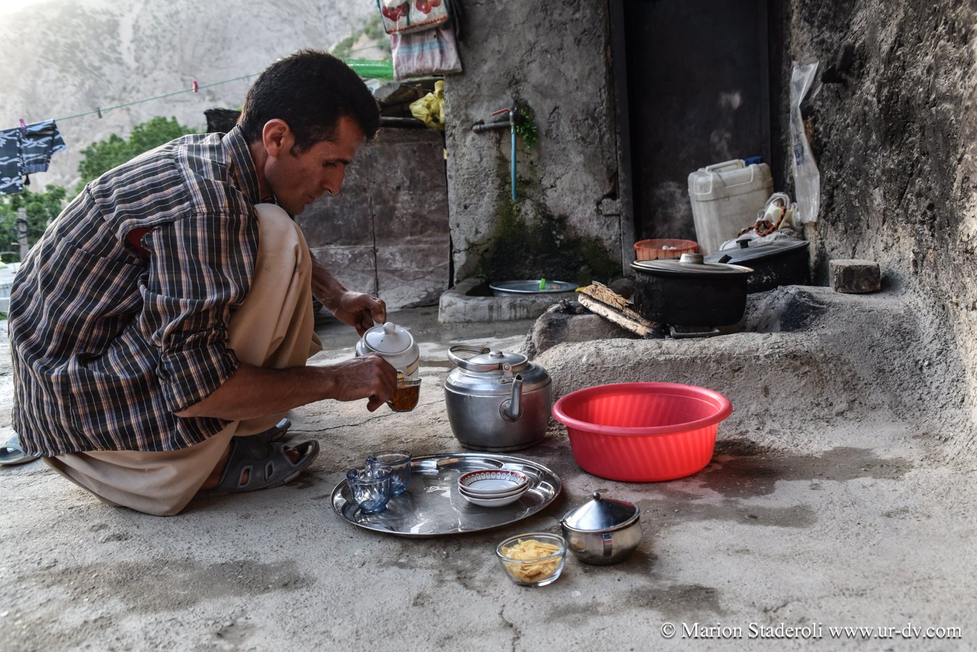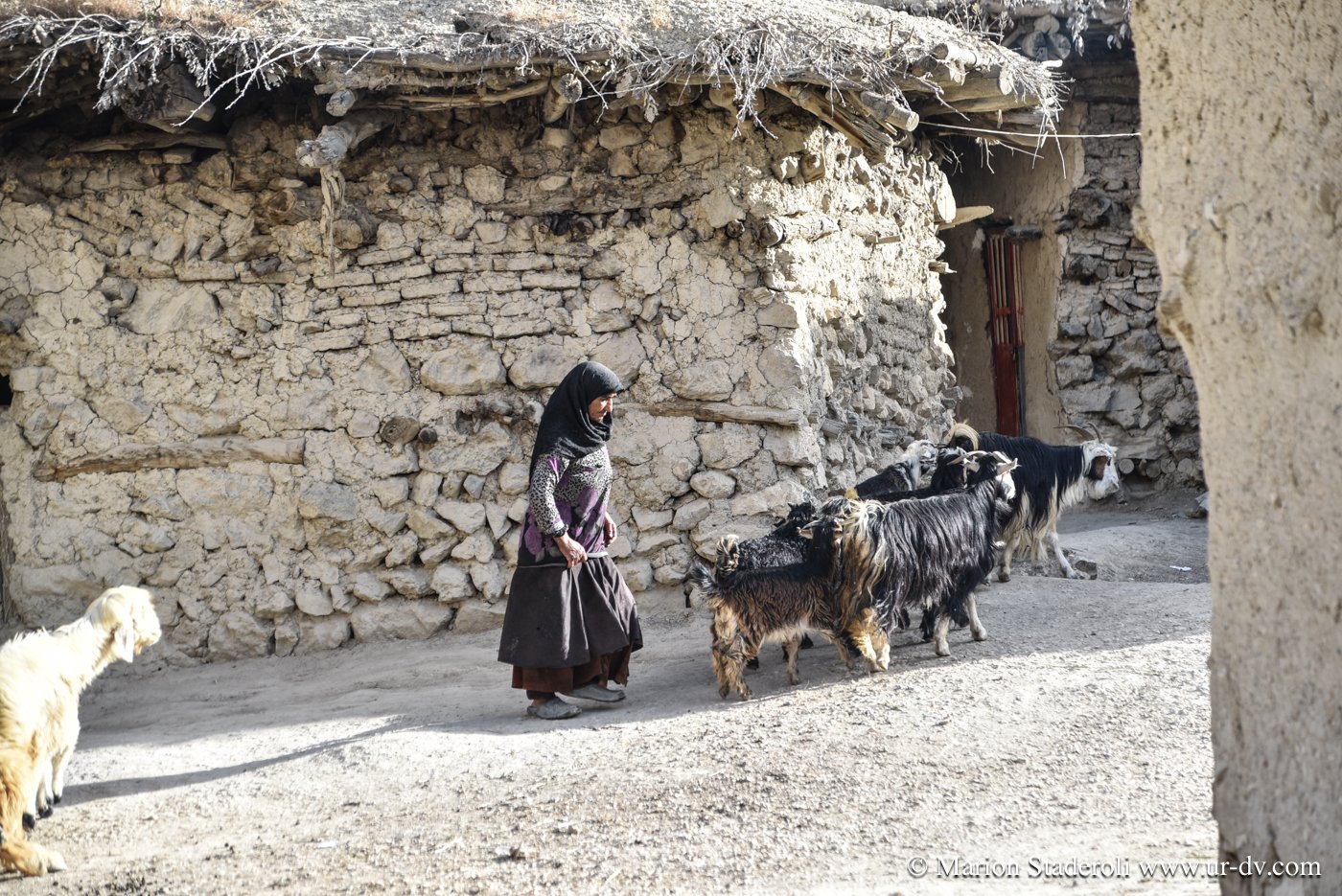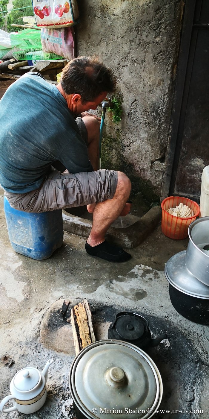 La nuit fut très difficile pour moi, la tension ne me quitte pas car je pense déjà au lendemain et à la route retour. J’ai l’impression comme jamais je n’ai eue d’être au bout du monde et la sensation d’être perdue que j’ai ressenti sur le passage le plus dur me revient sans cesse. Nous avons franchi une dizaine de cols, c’est incroyable comme en à peine une centaine de kilomètres de route (et donc bien moins à vol d’oiseau!) nous sommes loin ! Les images de la journée défilent dans ma tête, les heures tournent et je n’arrive presque pas à fermer l’œil. Le matin, forcément encore plus fatiguée, je me sens angoissée. Je n’y peux rien, je ne pense qu’à une chose, c’est rentrer et vite ! Pourtant nous aurions pu re-tenter de franchir le dernier col, mais je n’y crois plus, je me dis que ce que nous avons vécu là est déjà beaucoup, et je ne peux plus supporter ce stress. Avec le recul je sais que c’était surtout dû à la fatigue, le manque de sommeil me fait perdre le nord, je le sais, je me connais et pourtant c’est dur à contrôler, quel dommage…. Nous prenons un bon petit déjeuner fait de « pain » (galettes dont le goût me rappelle vraiment les crêpes bretonnes de sarrasin) trempées dans du lait de chèvre tout frais, passons un peu de temps dans le village à observer les habitants, échangeons encore un peu avec nos hôtes, et puis les quittons. J’ai la gorge serrée de savoir que nous ne les reverrons certainement jamais… Nous ne les connaissons que depuis quelques heures mais je ressens pour eux un profond attachement.