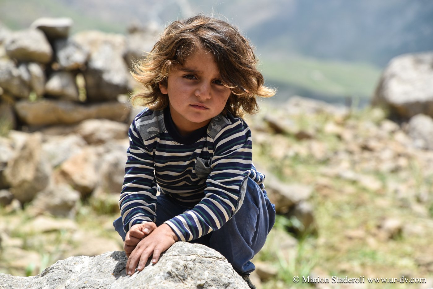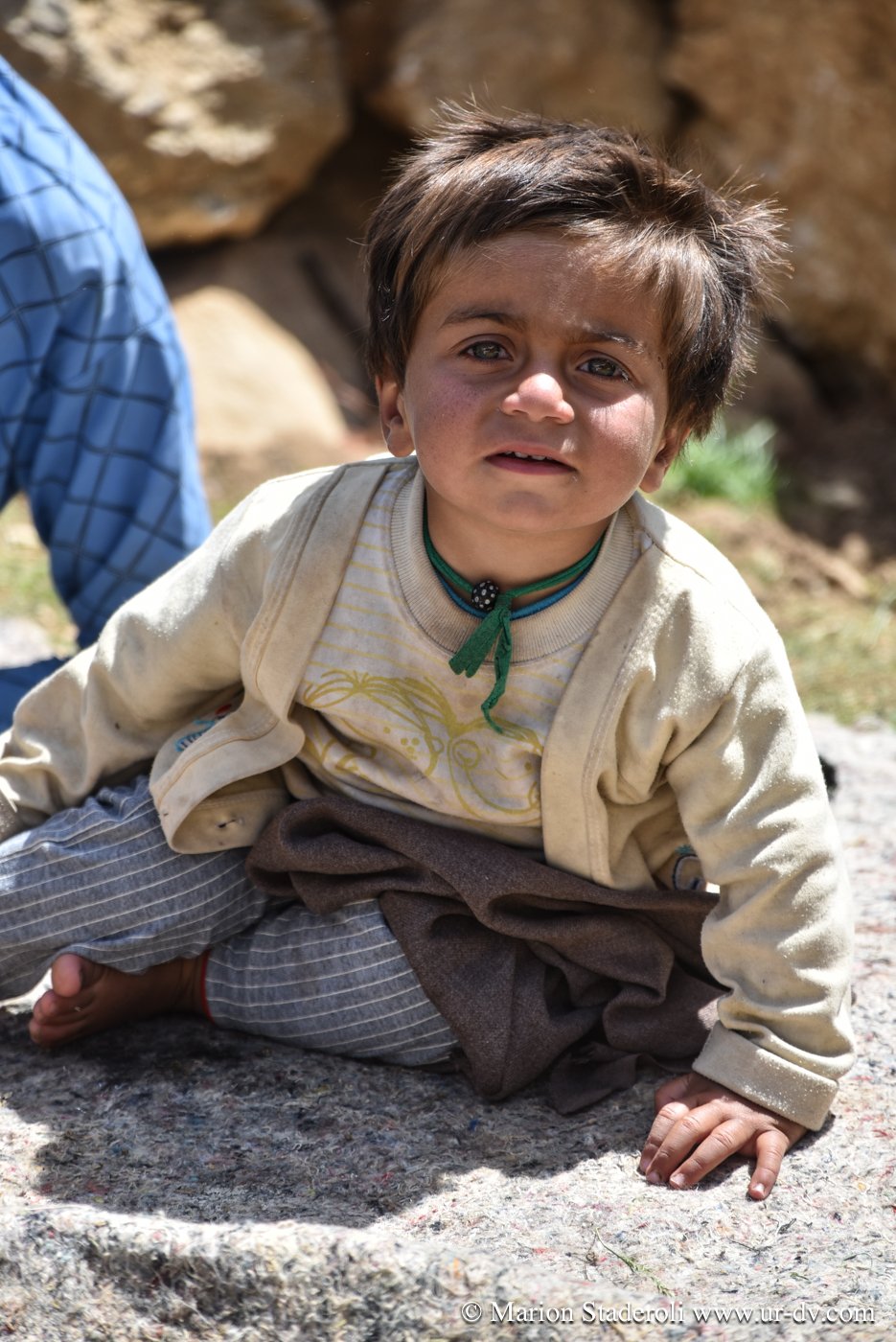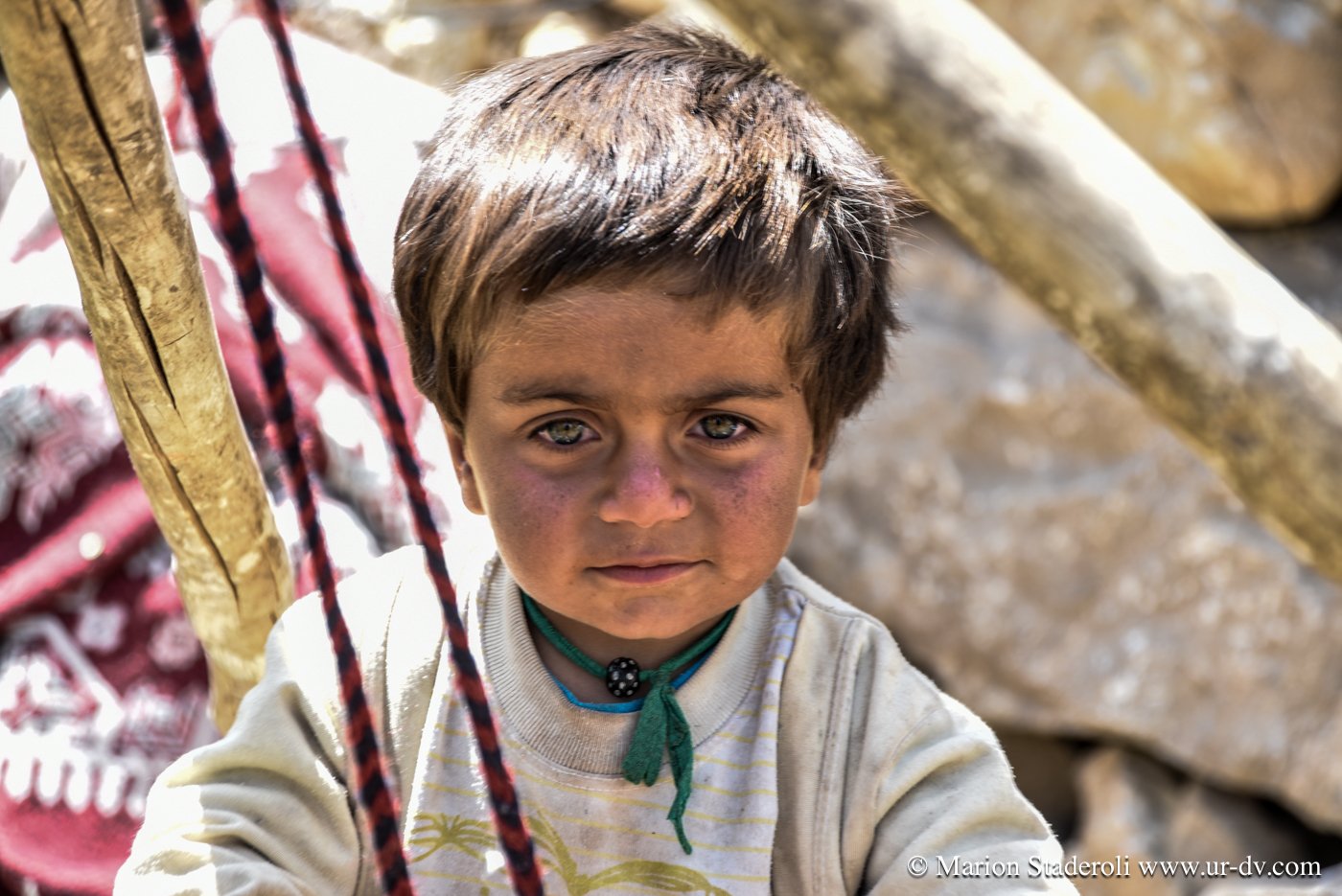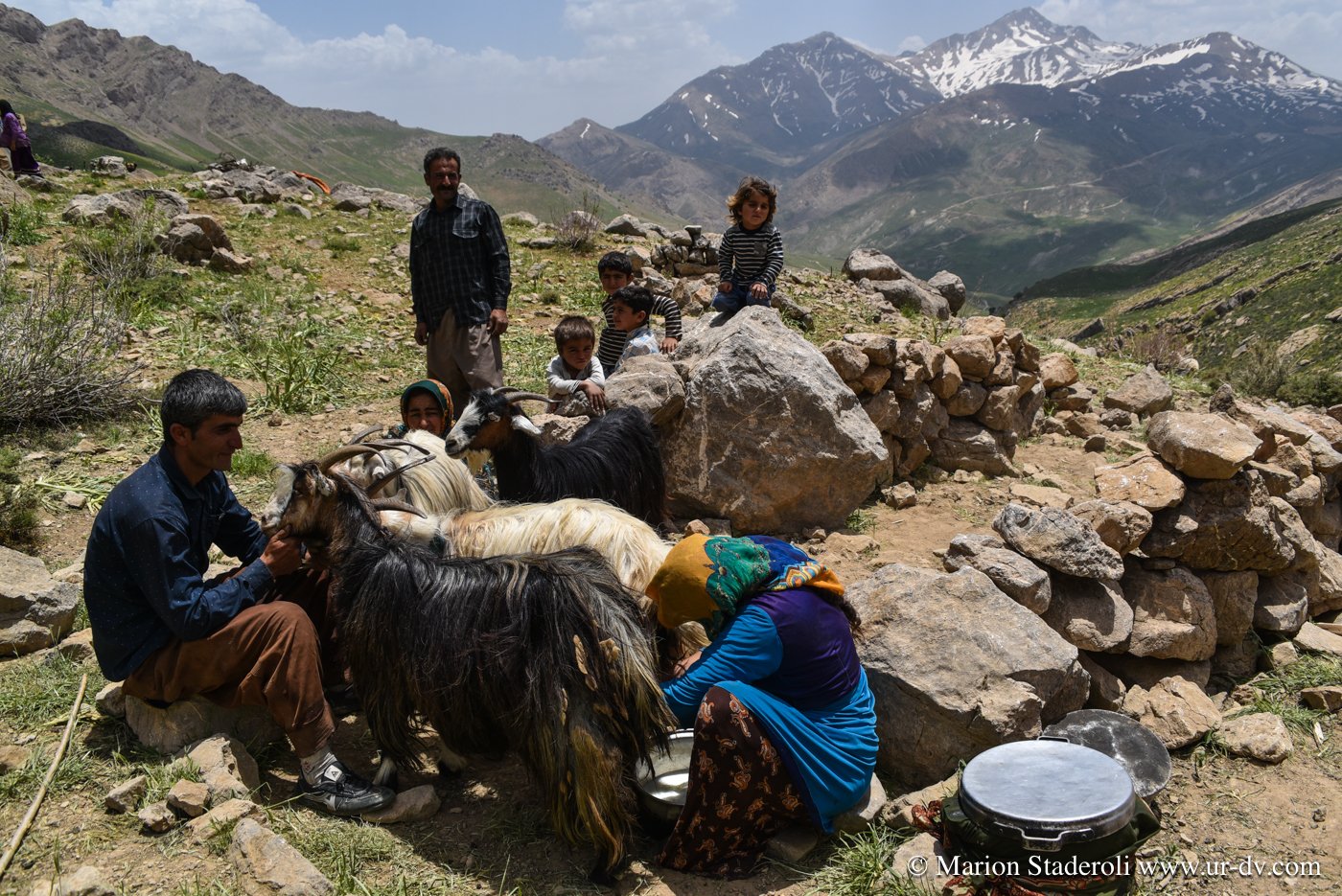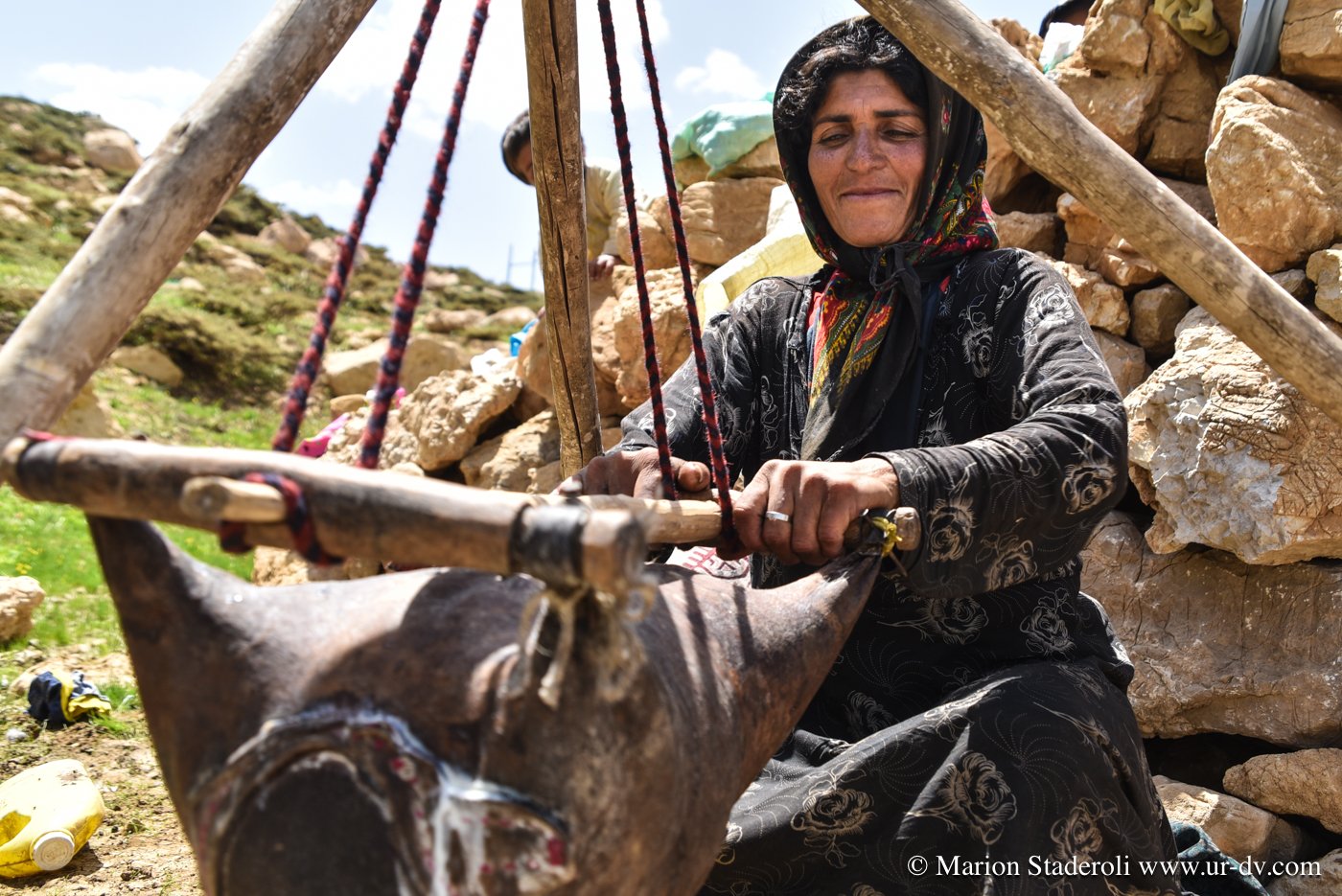 Première rencontre de la journée. Nous nous arrêtons près d’un camp pour faire quelques photos de la vue. Plus loin au-dessus, une jeune fille. Je la salue d’un geste, elle me fait signe d’approcher. Il y a la maman, et ses enfant. Le papa est dans la montagne avec le troupeau. Ils sont tous très beaux, la peau bronzée et abîmée par le soleil et de superbes yeux bleu-vert qui ressortent comme des perles. On nous offre du thé, du lait, on nous montre comment brasser du yaourt dans une outre fixée sur un trépieds. La dame veut même nous en donner plusieurs litres dans un bidon! Fabuleux moments…