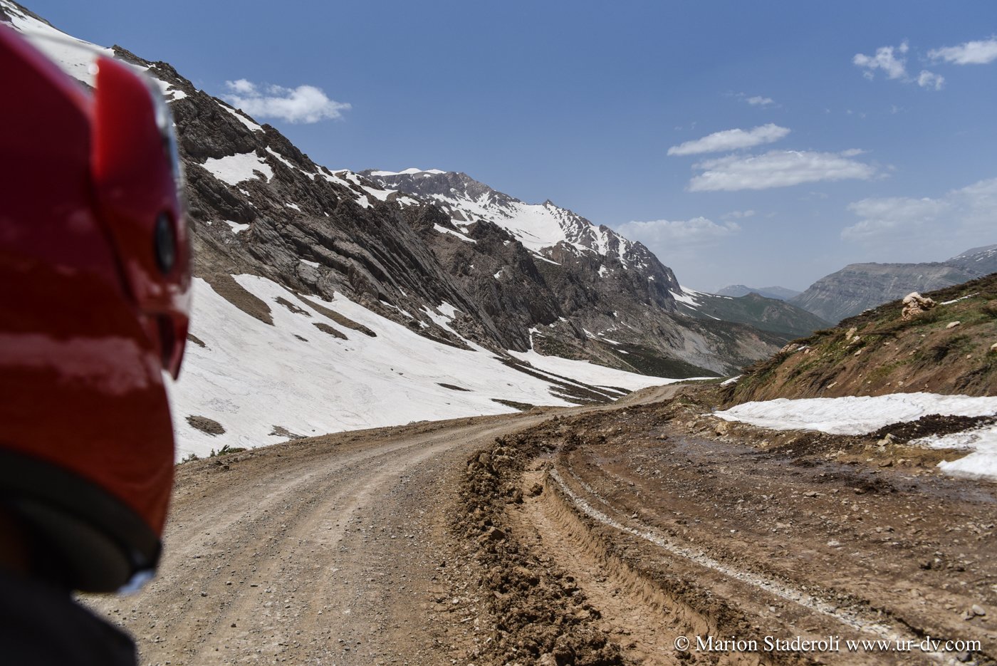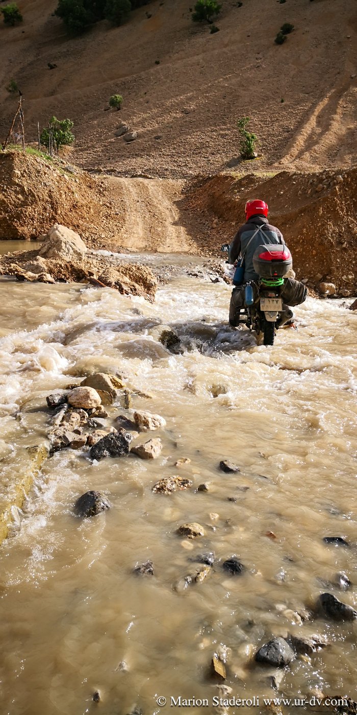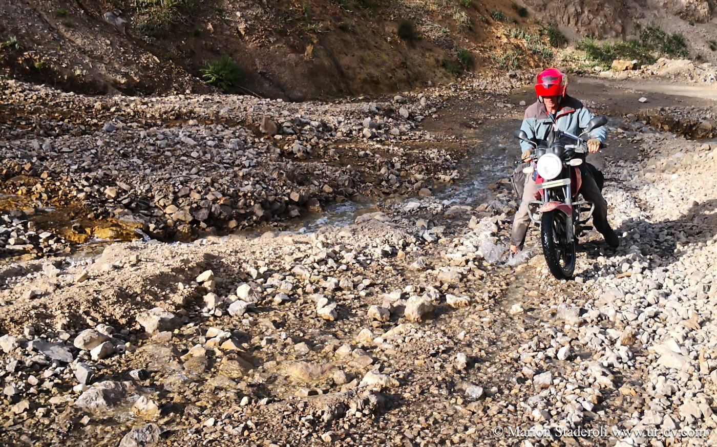 Nous avançons de plus en plus lentement, même pas 5km/H je pense, je me sens complétement tendue, la peur pointe son nez… la peur, un sentiment que je n’ai jamais réellement ressenti en voyage, pourtant nous avons entrepris déjà pas mal des périples hors normes… Mais, même perdus au fin fond des steppes de Mongolie à moto, sous la tente à 4500m au Chili, en trek en Papouasie ou sur des pistes isolées de Namibie, j’ai toujours été confiante en nos capacités et je me disais toujours « quoi qu’il arrive on se débrouillera ». Là, cette conviction indispensable à la réussite me quitte. Antony, lui le sent mieux, il y croit et se sent capable d’avancer et de toucher au but, moi je le pense simplement inconscient de la réalité, trop en train de tirer sur les nerfs. Et disons que moi, je vois le gps et pas lui…. Sur une partie encore plus difficile, nous nous renversons. Nous arrivons avec grand peine à relever la moto, car Antony un peu coincé en dessous ne peut pas vraiment pousser. Nous luttons comme des bêtes pour faire vite car de l’essence s’échappe du réservoir, si nous en perdons trop pour le coup nous sommes foutus, et continuons. La piste est très raide, inondée par endroit à cause de la fonte des neiges et nous avançons à la même vitesse que si nous marchions ! Je dois d’ailleurs marcher à côté de la moto la plupart du temps, mon casque sur la tête, épuisée, et cela dure depuis un moment, je me sens à bout de forces. Antony, même seul, peine, la plupart du temps il a les pieds posés au sol pour garder l’équilibre et ne pas déraper, c’est pas comme ça qu’on va avancer… Et le pire…. c’est que c’est de pire en pire!