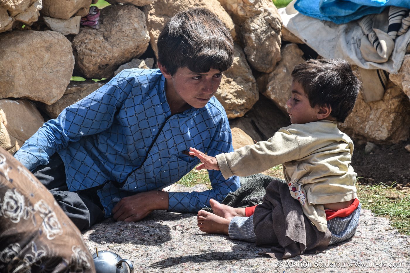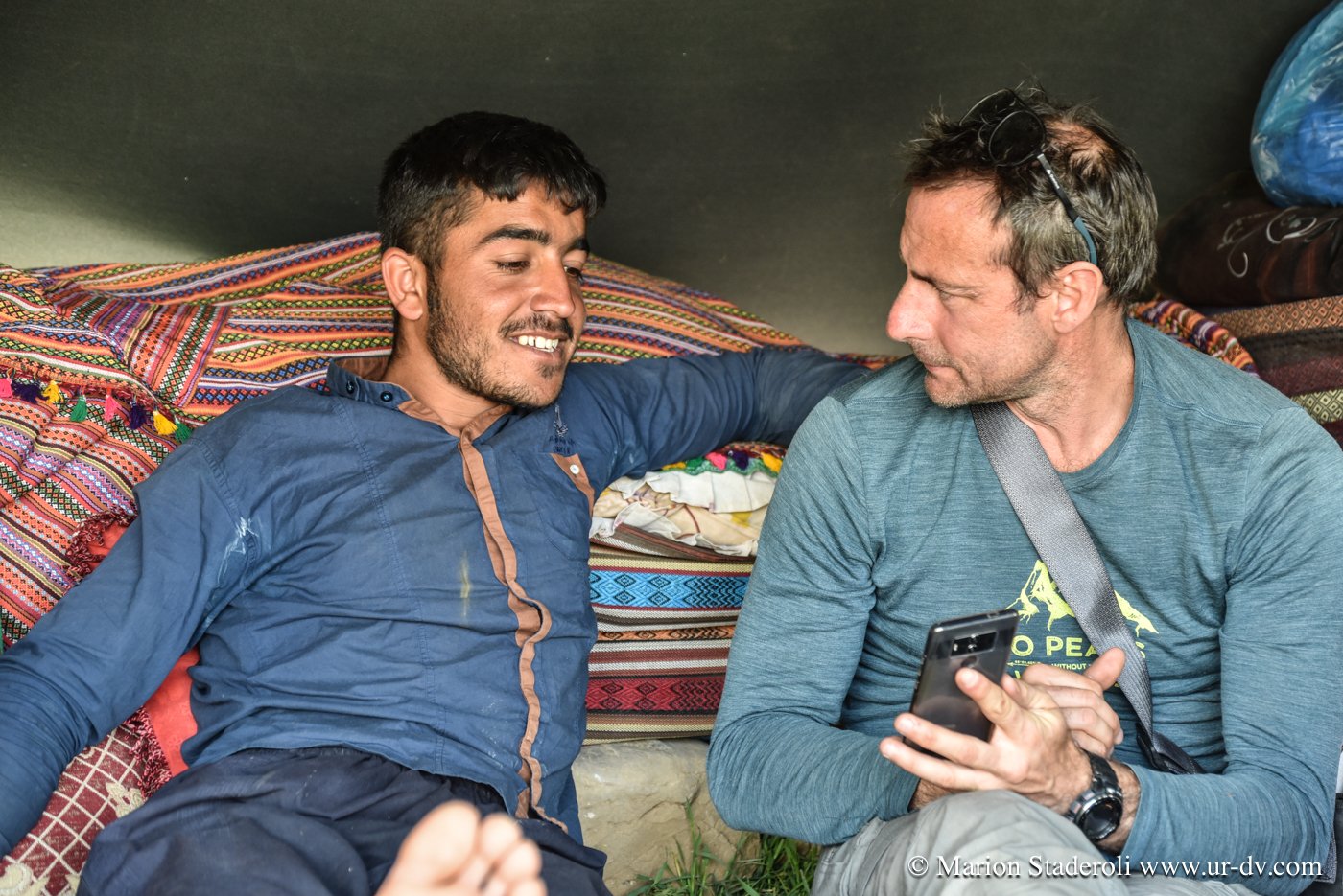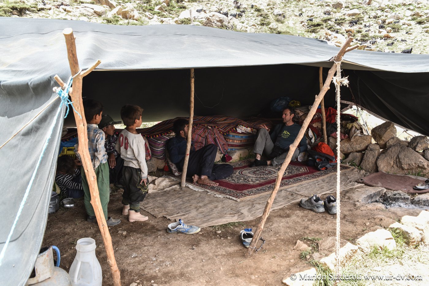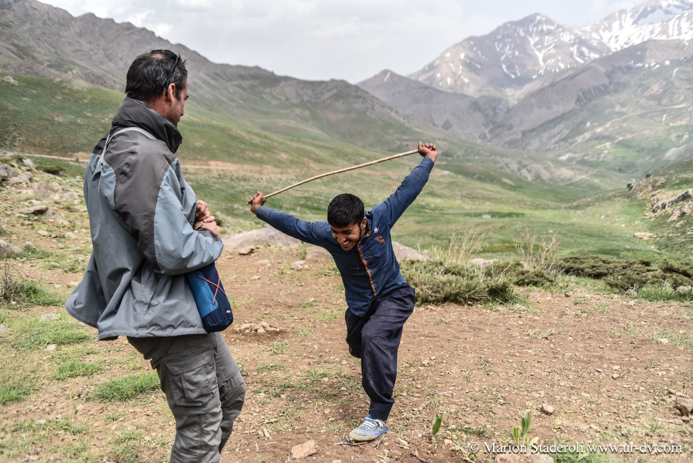 Deuxième rencontre. Nous nous arrêtons photographier une tente de nomades en contrebas sur un sublime panorama. Surprise! Alors que nous nous apprêtons à repartir nous entendons des cris et voyons des personnes faire de grands gestes: ce sont les deux jeunes rencontrés la veille (avec la famille en train d’emballer les affaires, ceux qui parlaient un peu anglais)! Ils nous invite à descendre. Bien sûr nous acceptons avec joie. Nous restons avec eux au moins deux heures, ils nous offrent un repas, nous discutons, Mehran initie Antony à une sorte de combat traditionnel de bâtons (il nous a montré des vidéos c’est super!), les enfants chahutent, bref encore de merveilleux moments à découvrir leur vie… On nous propose même de rester pour la nuit! Très tentant, je m’imagine déjà dormir là sous la tente avec la vue incroyable et les étoiles au-dessus de nous… Nous sommes à deux doigts d’accepter quand nous réalisons que nous ne pouvons pas emmener la moto jusqu’au campement (nous sommes loin, bien plus bas que la piste)… Ils nous disent que quelqu’un peut venir la prendre et la mettre à l’abri dans un autre camp. Nous hésitons , mais c’est une moto de location, même si nous avons envie de faire confiance, nous risquons gros s’il arrive quoi que ce soit, nous sommes contraints de refuser…