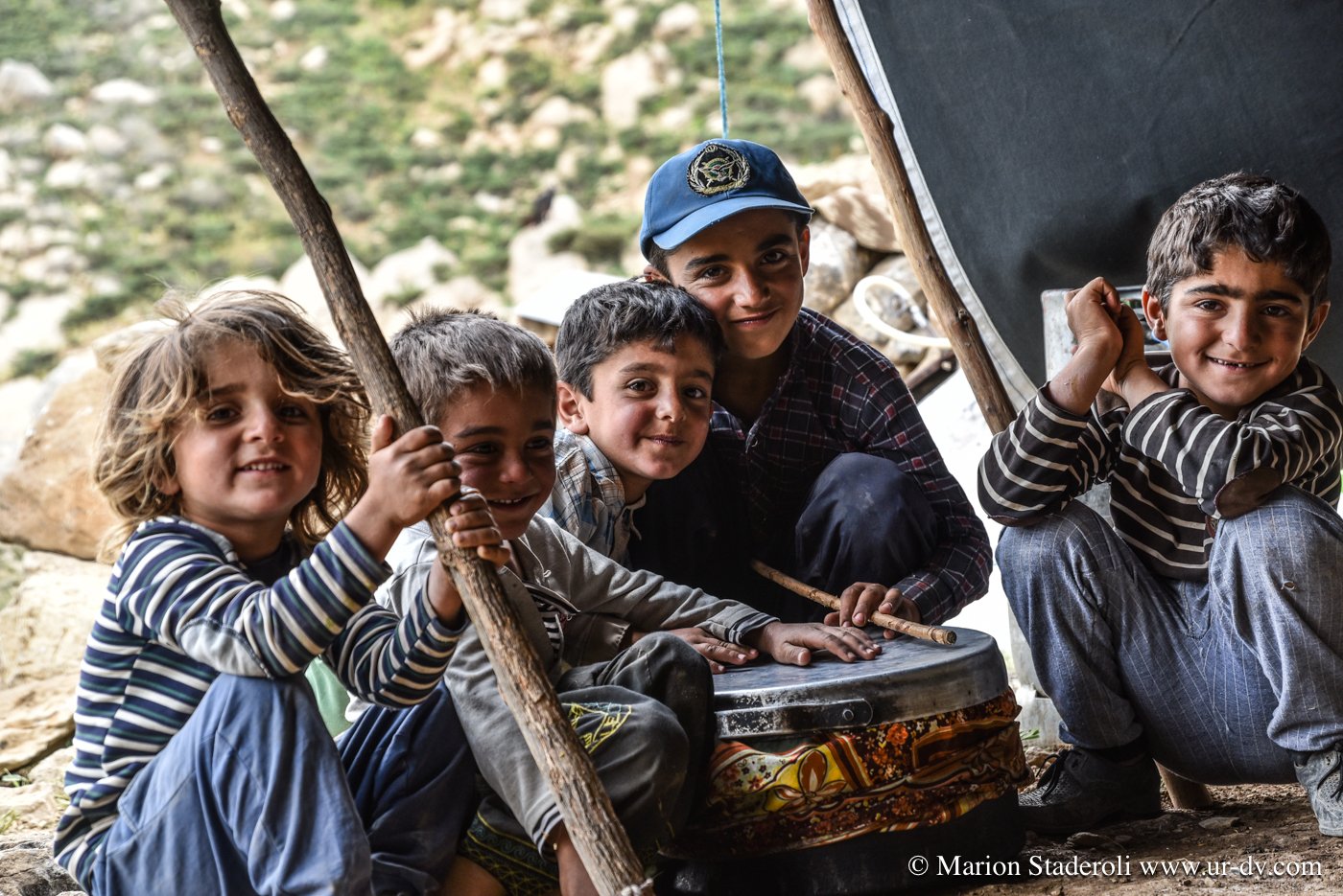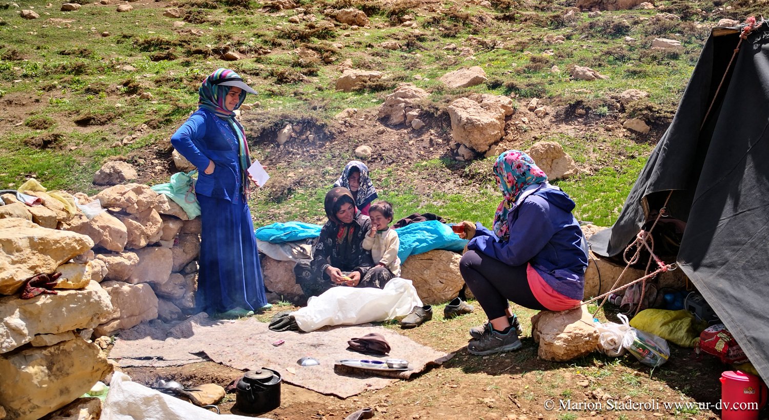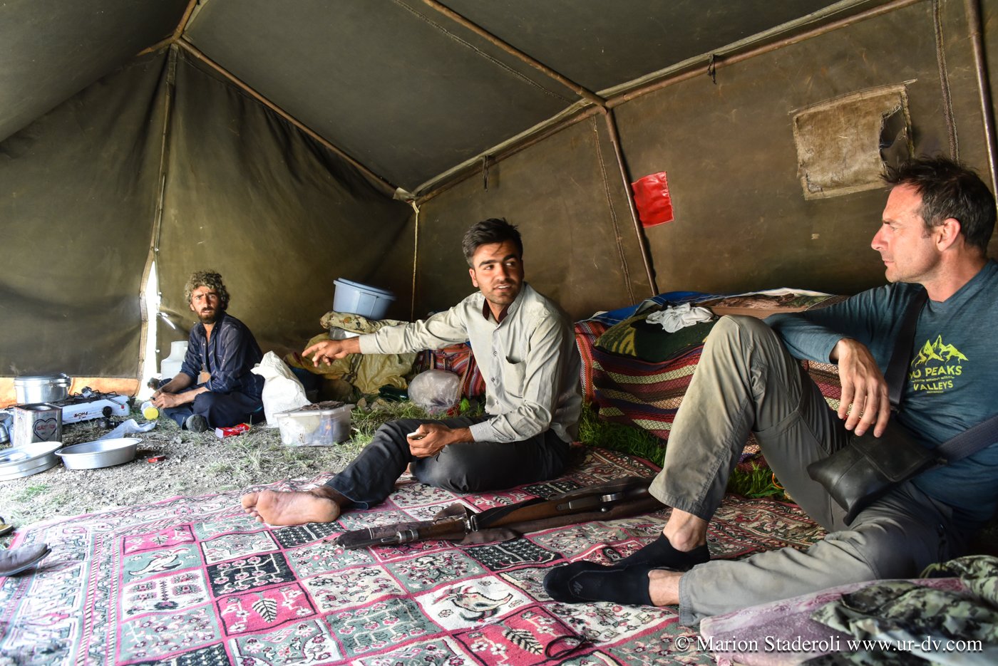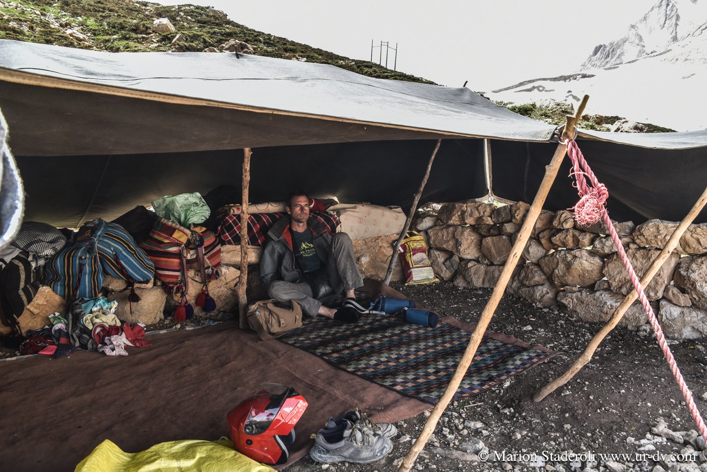 Deuxième rencontre. Nous nous arrêtons photographier une tente de nomades en contrebas sur un sublime panorama. Surprise! Alors que nous nous apprêtons à repartir nous entendons des cris et voyons des personnes faire de grands gestes: ce sont les deux jeunes rencontrés la veille (avec la famille en train d’emballer les affaires, ceux qui parlaient un peu anglais)! Ils nous invite à descendre. Bien sûr nous acceptons avec joie. Nous restons avec eux au moins deux heures, ils nous offrent un repas, nous discutons, Mehran initie Antony à une sorte de combat traditionnel de bâtons (il nous a montré des vidéos c’est super!), les enfants chahutent, bref encore de merveilleux moments à découvrir leur vie… On nous propose même de rester pour la nuit! Très tentant, je m’imagine déjà dormir là sous la tente avec la vue incroyable et les étoiles au-dessus de nous… Nous sommes à deux doigts d’accepter quand nous réalisons que nous ne pouvons pas emmener la moto jusqu’au campement (nous sommes loin, bien plus bas que la piste)… Ils nous disent que quelqu’un peut venir la prendre et la mettre à l’abri dans un autre camp. Nous hésitons , mais c’est une moto de location, même si nous avons envie de faire confiance, nous risquons gros s’il arrive quoi que ce soit, nous sommes contraints de refuser…