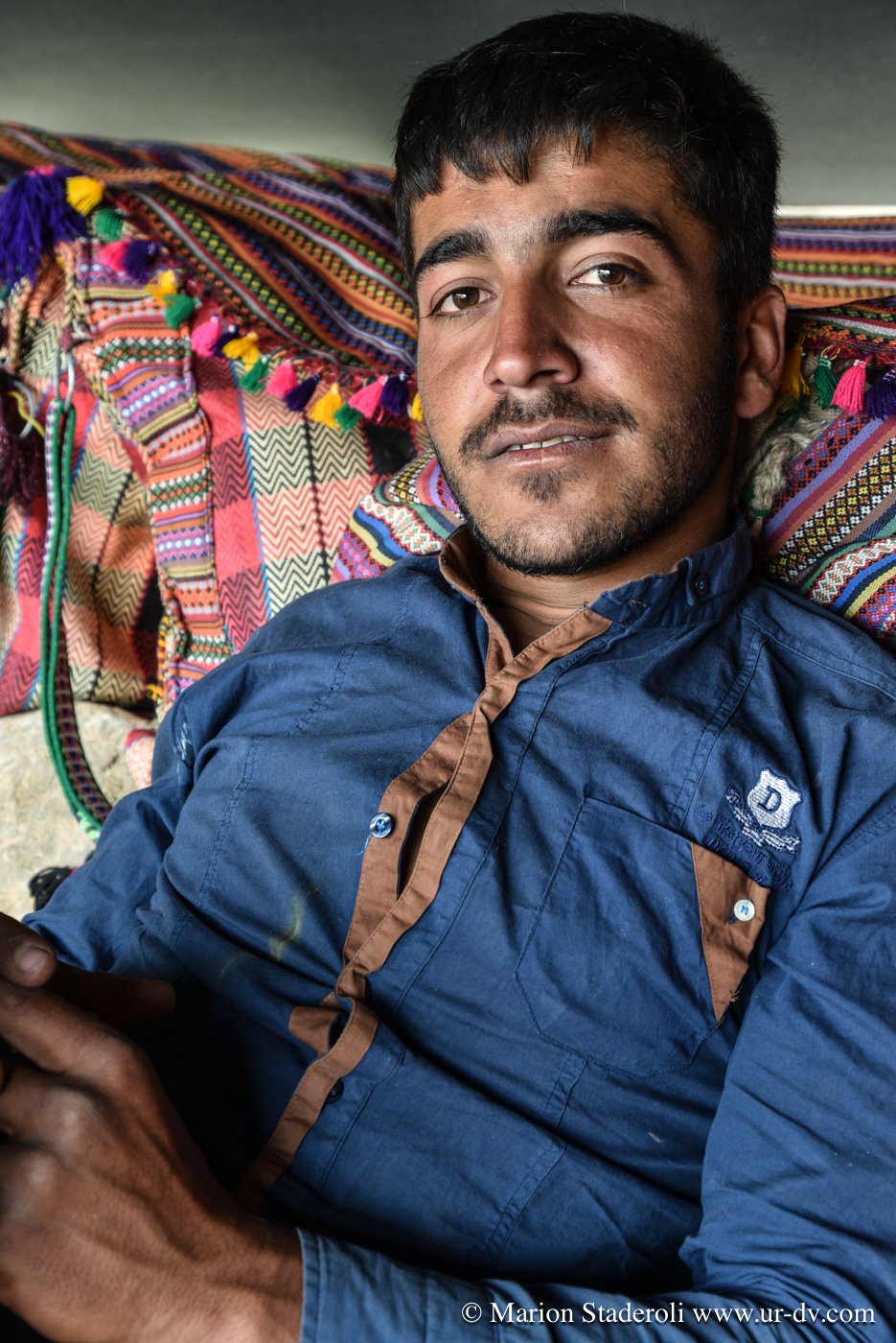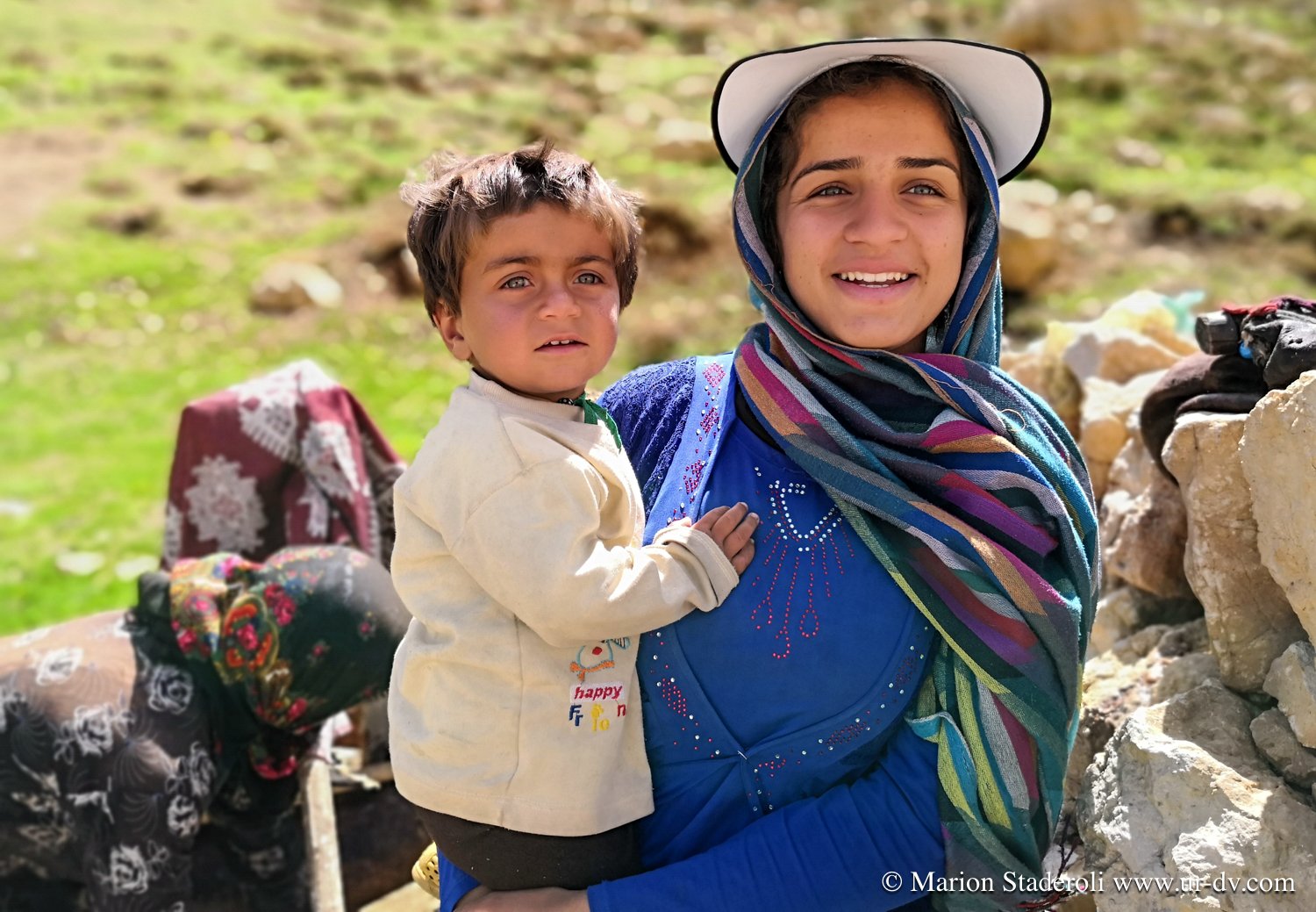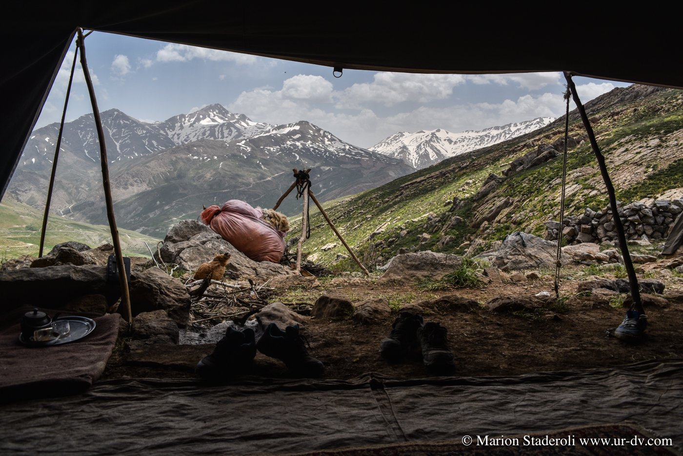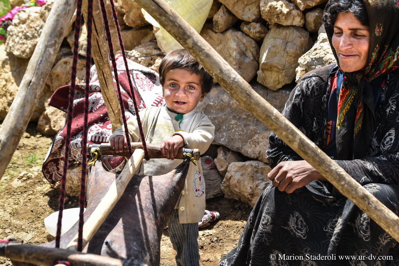 Deuxième rencontre. Nous nous arrêtons photographier une tente de nomades en contrebas sur un sublime panorama. Surprise! Alors que nous nous apprêtons à repartir nous entendons des cris et voyons des personnes faire de grands gestes: ce sont les deux jeunes rencontrés la veille (avec la famille en train d’emballer les affaires, ceux qui parlaient un peu anglais)! Ils nous invite à descendre. Bien sûr nous acceptons avec joie. Nous restons avec eux au moins deux heures, ils nous offrent un repas, nous discutons, Mehran initie Antony à une sorte de combat traditionnel de bâtons (il nous a montré des vidéos c’est super!), les enfants chahutent, bref encore de merveilleux moments à découvrir leur vie… On nous propose même de rester pour la nuit! Très tentant, je m’imagine déjà dormir là sous la tente avec la vue incroyable et les étoiles au-dessus de nous… Nous sommes à deux doigts d’accepter quand nous réalisons que nous ne pouvons pas emmener la moto jusqu’au campement (nous sommes loin, bien plus bas que la piste)… Ils nous disent que quelqu’un peut venir la prendre et la mettre à l’abri dans un autre camp. Nous hésitons , mais c’est une moto de location, même si nous avons envie de faire confiance, nous risquons gros s’il arrive quoi que ce soit, nous sommes contraints de refuser…