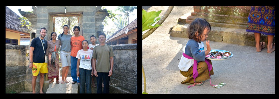 Ca y est nous avons déménagé! Pas très loin, nous sommes restés dans le même Bale! Nous sommes chez Putu (prononcez Poutou) le frère d’Irak et sa femme Compiang (petite photo en bas à gauche). Ils sont eux aussi adorables, mais ne parlent pas anglais et juste quelques mots de Français. Alors nous échangeons de grands sourires et parlons avec les mains, mais ne pouvons pas papoter. Ils sont en train d’apprendre car leur chambre est toute récente, nous ne sommes que les 3ème invités! Le pavillon se trouve à l’entrée du Bale, du coup c’est super parce que nous voyons tout ce qui se passe ici. Chez Irak c’était le calme ici, c’est plus vivant! Nous apprécions les deux. Nous sommes juste en face du pavillon où la mamie tresse les offrandes presque toute la journée, et nous avons une petite fille de 3 ans, Sita, qui aime bien venir nous crier « Haloooo » avec son sourire coquin chaque fois qu’elle passe. A côté du « portail » nous voyons les allées et venues, ceux qui rapportent des sacs de riz, ceux qui vont chercher des noix de cocos pour fabriquer de l’huile, ceux qui font les offrandes, etc