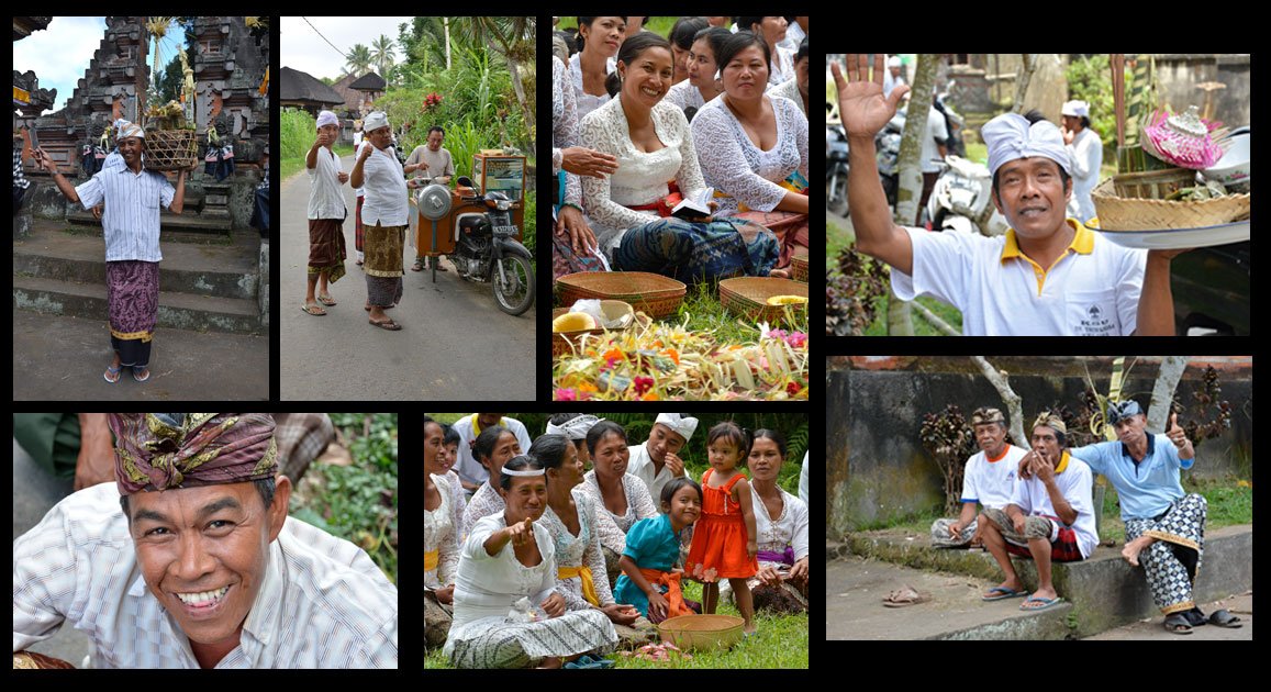Sur le chemin du retour dans un petit village appelé Kelusa, j’ai flairé qu’il allait se passer quelque chose d’intéressant et nous nous sommes arrêtés. En effet plusieurs personnes au bord de la route étaient habillés en habits traditionnels. Ca n’a pas loupé, après avoir marché 100 mètres dans un chemin nous sommes tombés sur des hommes sur leur 31, assis sur les marches d’un temple. Nous leur disons « Halo » et surprise: plusieurs parlent anglais! Ils nous posent des questions, puis on leur demande ce qu’ils font, et si il va y avoir une cérémonie. Ils nous ont alors proposé (si nous avions un sarong pour mettre sur nos shorts, comme le veut leur religion) d’entrer voir les préparatifs puis de revenir l’après midi pour voir une cérémonie. Il va y avoir plusieurs durant 3 jours. Nous les avons vu préparer toutes les offrandes, puis découper deux cochons qu’ils vont cuisiner pour le lendemain. Ils étaient très accueillants.