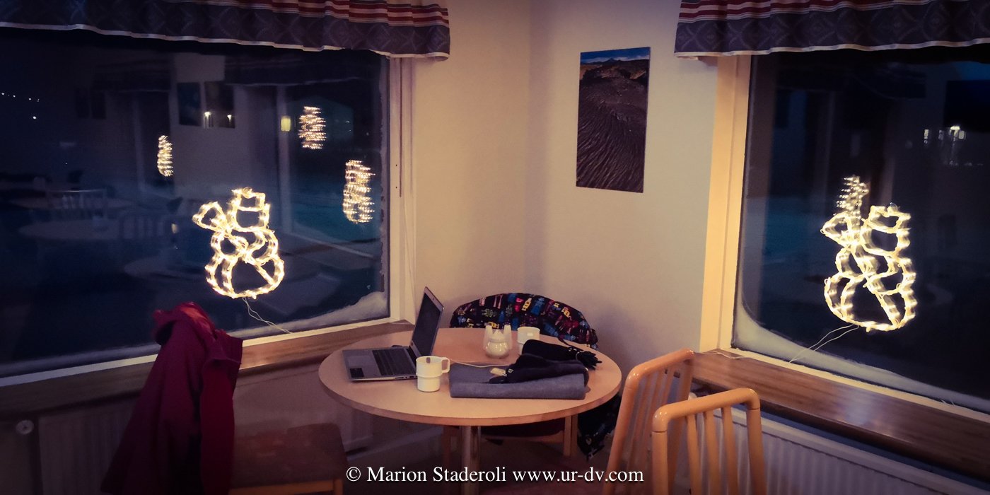 Nous avons donc atterri à Hofsos, mini village fantôme en hivers. Des maisons alignées, des guirlandes lumineuses aux fenêtres mais pas âme qui vive! Rapide balade face à la mer, et puis on reste au chaud!