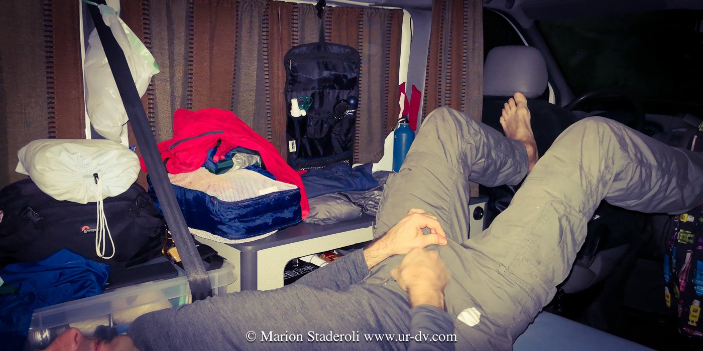 Réveillés vers 7H, on attrape ses vêtements dans le sac qui pend au dessus de notre tête. Un petit café préparé sur notre réchaud à gaz, puis on se dirige vers la première station service pour se débarbouiller et aller aux toilettes. Au premières lueurs du jour on prend la route, c’est parti pour une journée quasi non-stop (il était rare que l’on mange, en décalage avec les horaires et le soleil!). En fin de journée, vers 16H30 il faut penser à trouver où passer la nuit. Rapide repérage (ou plus laborieux parfois), puis on passe un peu de temps dans une station service ou une piscine, et puis, vient le temps de rentrer, d’allumer le chauffage, de « cuisiner » , de manger et se coucher.