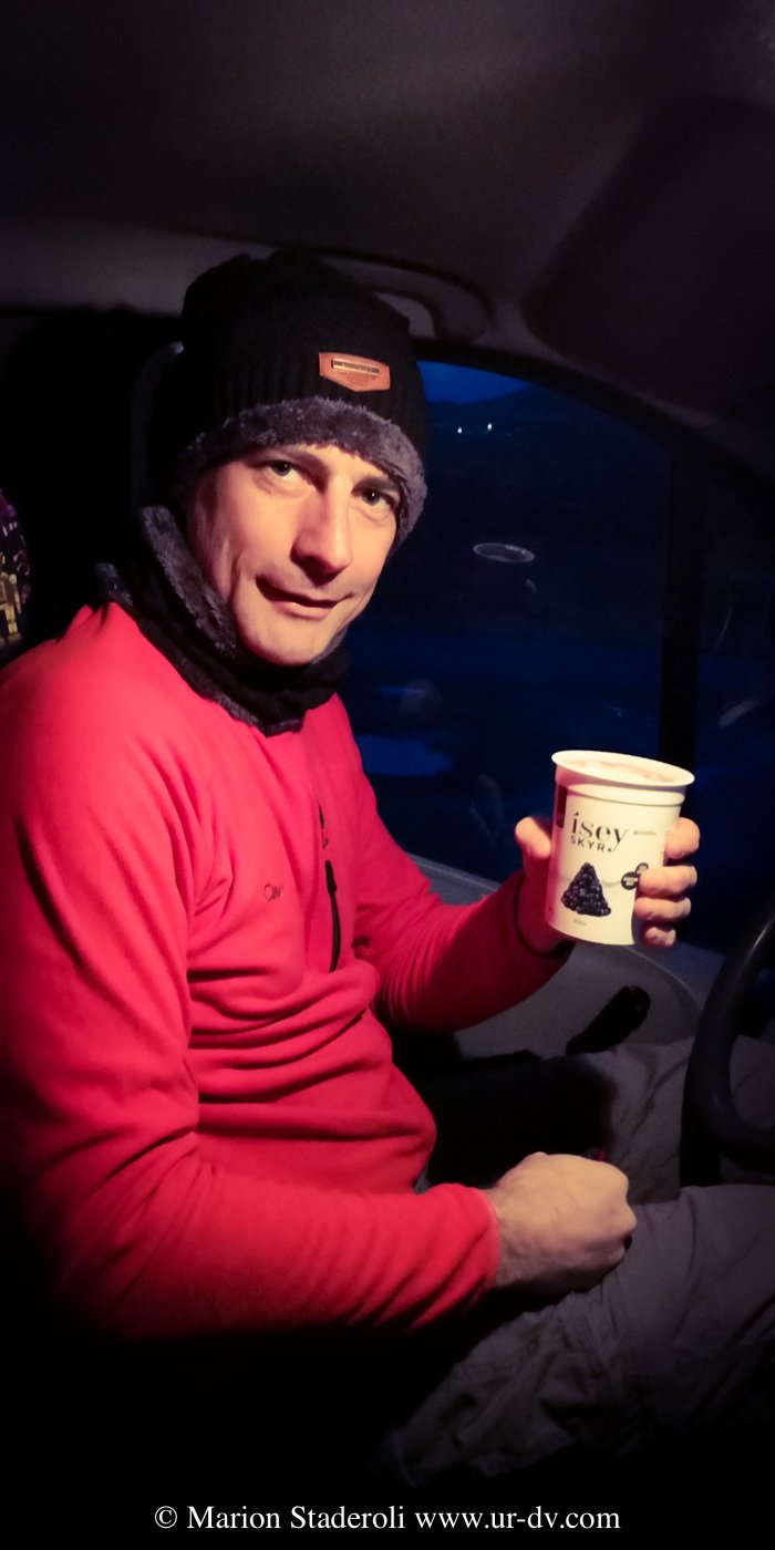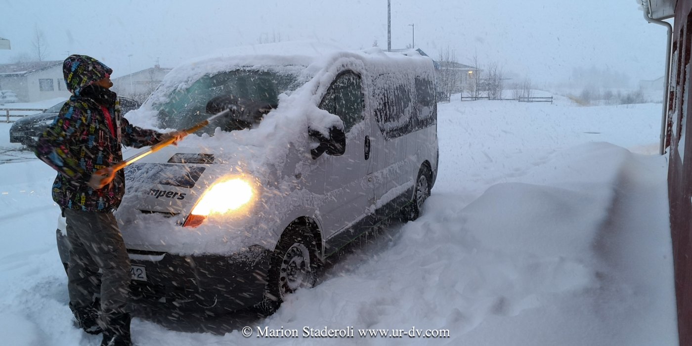 J’ai lu très souvent des messages alarmants sur le fait que conduire en Islande en hivers est dangereux et qu’il faut absolument un 4X4. Franchement… c’est faux ! Nous avons en tout parcouru 2800km, sur la route 1 et sur plusieurs routes secondaires (même parfois non goudronnées) et Antony n’a ressenti aucune difficulté. Au départ nous étions inquiets, mais après avoir testé le freinage et donné quelques coups de volants secs sur une chaussée glissante, nous avons pu voir que tout adhérait bien. Le verglas était bien présent, la neige aussi, néanmoins nous avons gardé une allure de 70km/H de moyenne. Parfois moins bien sûr, car quand on fait face a une belle chute de neige avec vent, et parfois quand il ne fait plus vraiment jour, on n’y voit pas grand chose ! Mais pas d’affolement, on ralentit et tout se passe bien. A une ou deux reprises nous n’avons pas pu emprunter la route prévue à cause de la neige trop épaisse (jusqu’à 10cm ça passe, après c’est plus embêtant, on risque surtout de ne pas réussir à faire demi tour), mais cela est resté marginal sur des routes en cul de sac non entretenues, et ailleurs nous avons vu combien l’action des déneigeuses est permanente et efficace même sur les routes secondaires.
