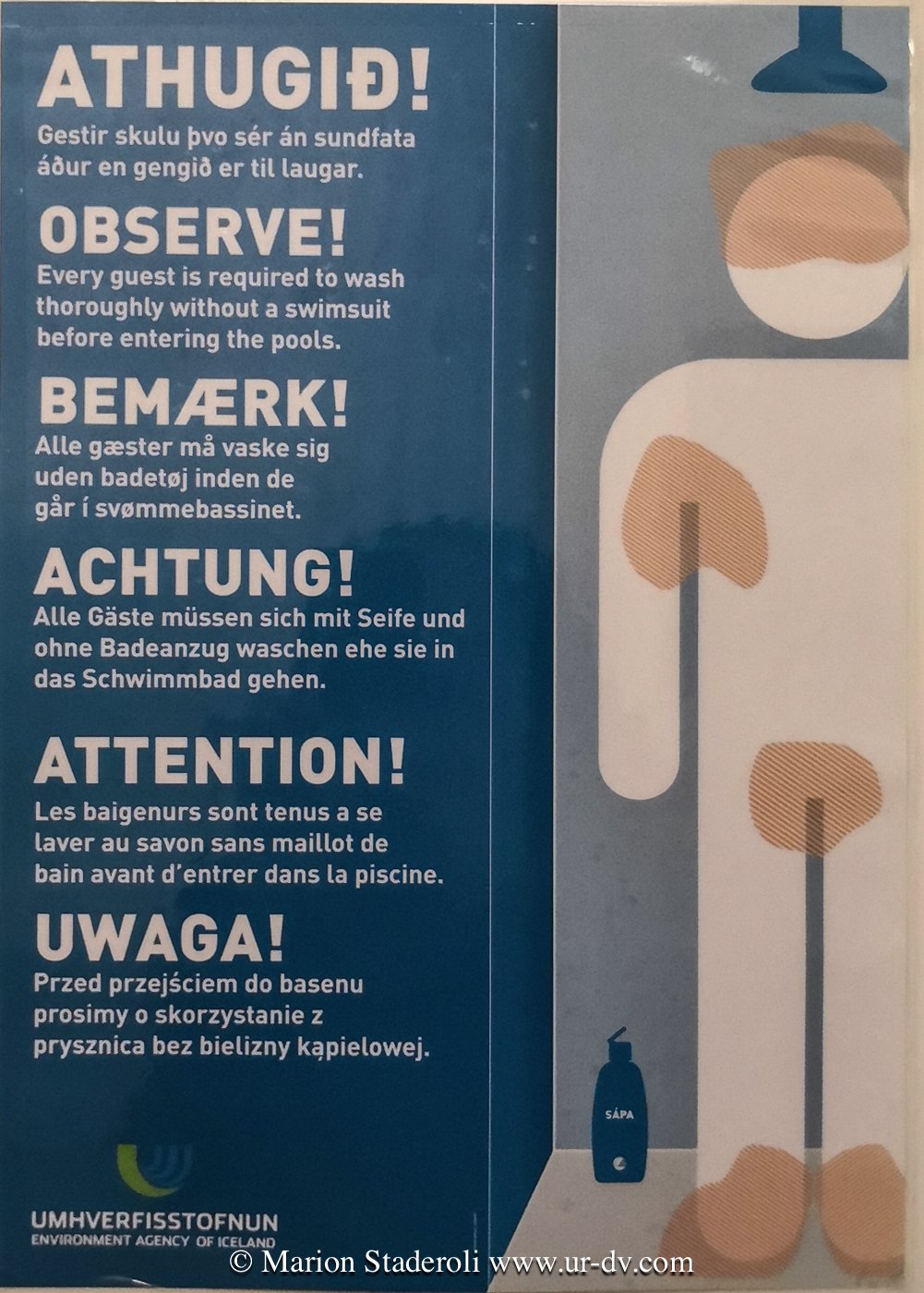 Les piscines alimentées par l’eau naturelle (et donc chaude) sont une institution, et le moindre village en possède une. Après le boulot on ne va pas au pub, mais on se retrouve dans ces infrastructures pour faire trempette et discuter de la pluie et du beau temps avec son voisin. Un véritable art de vivre que l’on découvre avec ravissement. Tout est en extérieur, il y a en général un grand bassin à 35° qui permet de nager, puis des plus petits entre 38 et 40° pour se prélasser, un sauna et un bac proche de 0° pour se réveiller (si si, ça fait du bien j’ai testé!). Nous avons usé et abusé de ces infrastructures, en gros tous les deux ou trois jours. Attention l’hygiène y est très importante et il est obligatoire de se doucher nu avant d’y entrer, ce petit panneau le rappelle partout.