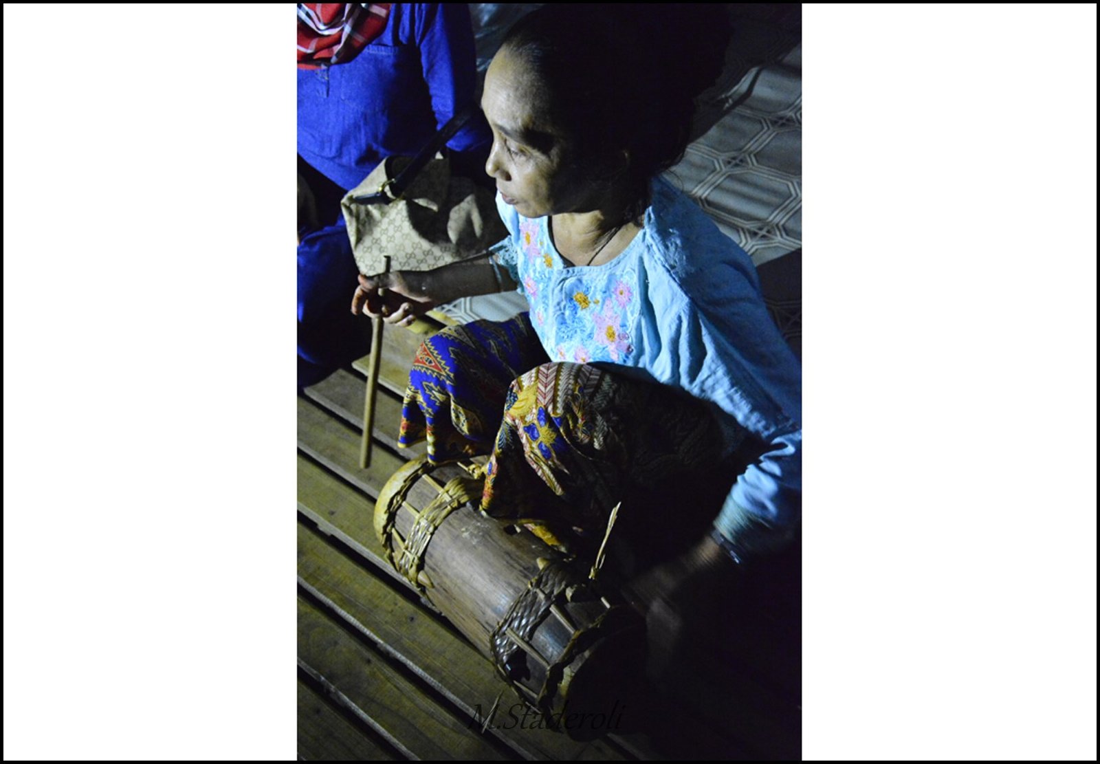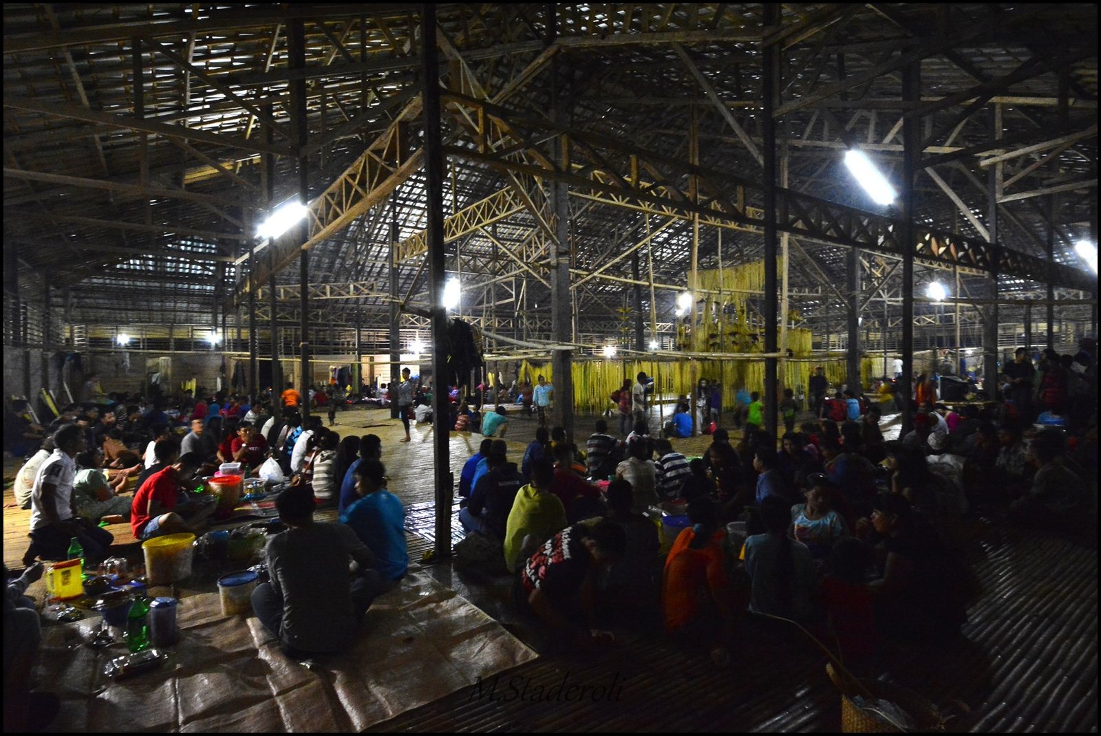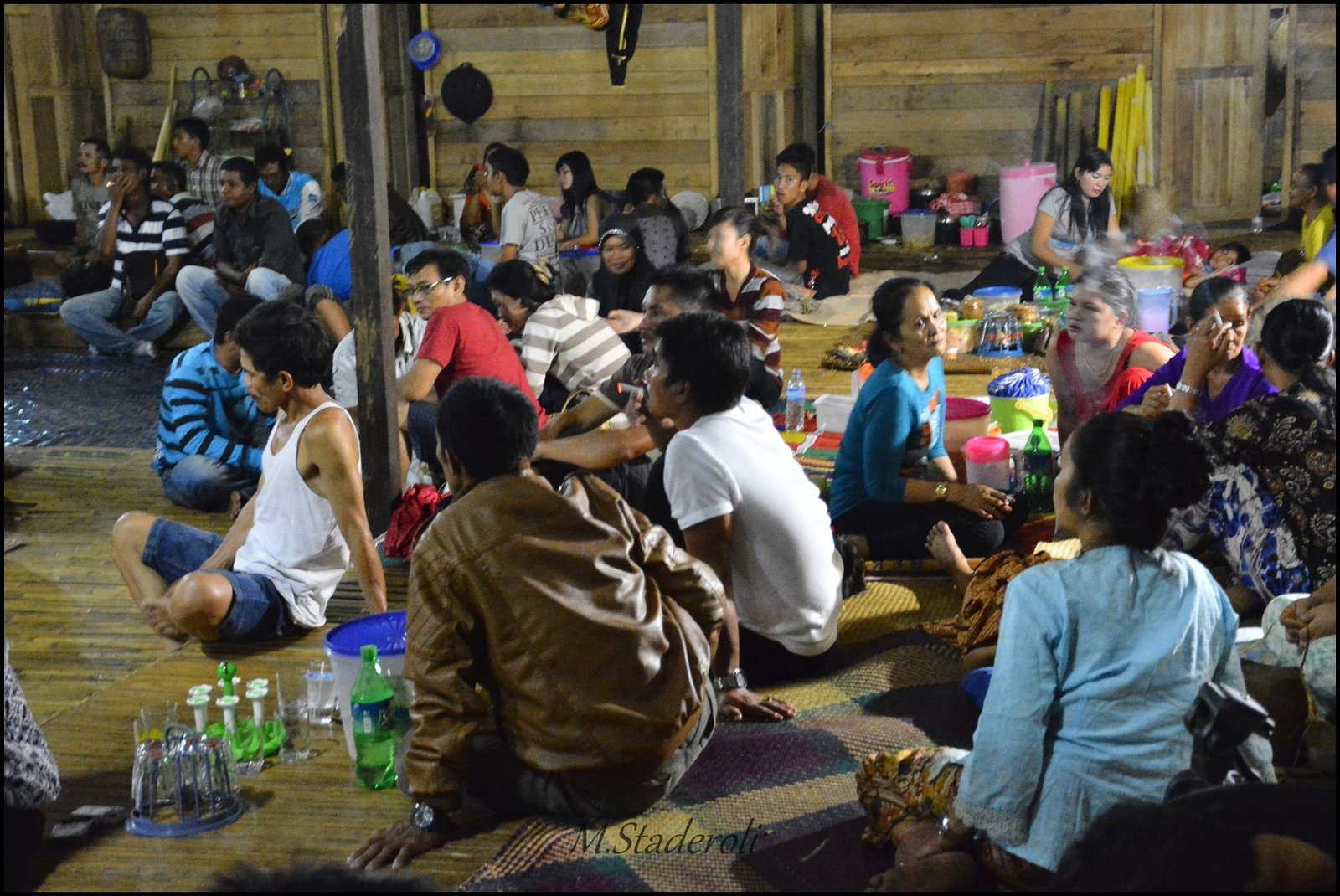 Bref la soirée s’est déroulée ainsi, entre moment d’attente, et petits « événements ». Les gens semblaient contents de nous voir là. Ensuite plusieurs hommes se sont habillés d’un sarong et coiffés d’une sorte de foulard enroulé (ça ressemble à ceux de Bali). Ils ont pris ce qui ressemblait à de gros bracelets argentés ou dorés et ont commencé à les secouer en rythme avec les percussions déjà présentes. Nous pensions alors qu’ils allaient danser (Joe m’avait dit vers 10H30) mais ils se sont assis par terres et ont continué entre musique et chants. Tout ceci est lancinant presque hypnotique et nous n’avons pas tardé à avoir très sommeil. D’ailleurs nous n’étions pas les seuls car très vite des nattes ont tapissé le sol et partout de petits groupes ont commencé à dormir ! Étrange comme fête hein ? Vu que ça dure toute la nuit et certainement jusqu’à midi le lendemain, en même temps… Nous aurions pu rester dormir mais nous avions prévu de venir simplement voir la cérémonie, les danses et puis aller dormir à l’hôtel et revenir le lendemain. Nous avons attendu jusqu’à minuit et demi mais ne voyant que rien d’autre ne se passait et que pas mal de monde dormait nous sommes partis. A priori vers 1H30 il y a eu des danses… Retour à l’hôtel à la lampe frontale (et il faut traverser un pont qui est en partie écroulé haha), heureusement qu’il n’y a pas de bête féroces dans le coin…