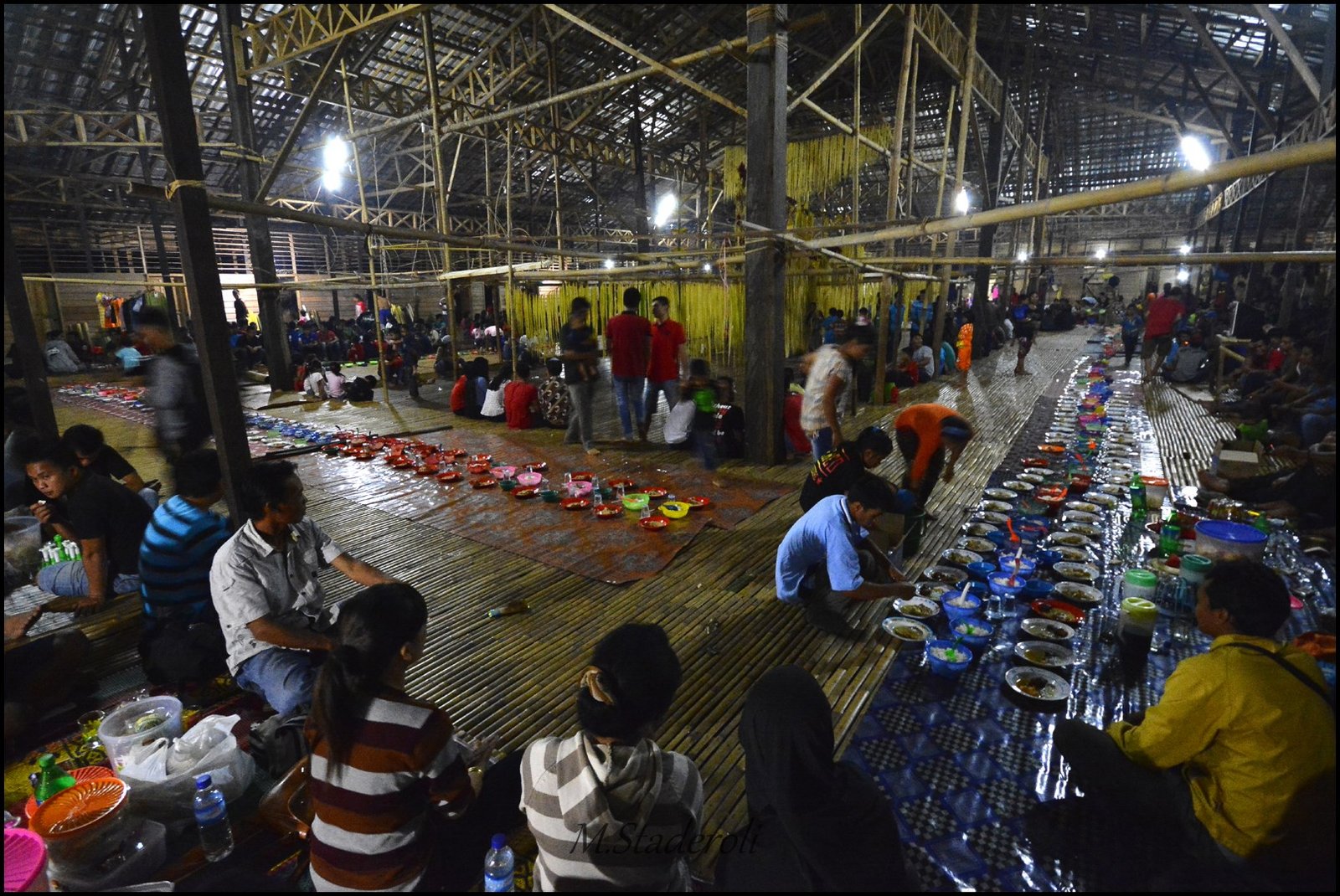 Nous nous retrouvons donc devant un dilemme… Attendre plus de cinq heures ici ? Rentrer ? Nous ne voulions pas rater ça… Nous avons un peu attendu, puis un groupe de personnes est entré et nous avons reconnu avec eux Shan, le gars si avenant (un passionné de photos de Banjarmasin) qui le matin nous avait dit de revenir le soir à 19H. Il nous a vus aussi et peu après il est venu nous chercher pour que nous nous asseyions avec eux. Ils nous présente ses amis qui ne sont autres, au hasard, que des photographes ! Un photographe pro, un photographe journaliste et des amateurs passionnés. Le photographe de presse parle bien anglais, il vit près de Banjarmasin. Très vite les adresses de site et facebook s’échangent, voilà, j’ai encore de nouveaux amis 😉 Tout ceci nous a permis de nous occuper. Nous avons discuté, puis avons fait quelques photos d’enfants (pour eux qui parlent leur langue c’est simple, ils leur demandent de faire ceci ou cela et ils photographient!).