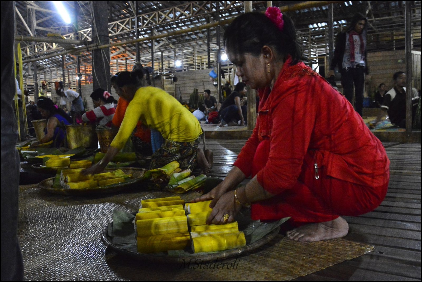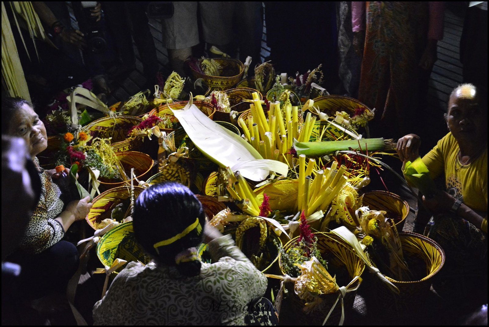 Nous sommes arrivés vers 19H. Vers 20H des tapis ont été déroulés et des plats de nourriture et des assiettes posés au sol en lignes faisant ainsi comme une table gigantesque tout autour de la pièce. Nous ne savions pas trop à quoi nous attendre et nous avions mangé avant. Certains sont allés piocher dans les plats. Ensuite tout a été débarrassé. Vers peut-être 21H30 des personnes on commencé à taper sur les sortes de tambours, en un rythme régulier et répétitif. Des hommes ont dansé brièvement tout autour de la structure décorative au centre. Puis les femmes ont défilé en portant ce que je décrirais comme des offrandes au centre (on voit ici l’influence Hindouiste qui nous rappelle Bali). Tout cela a duré assez longtemps.