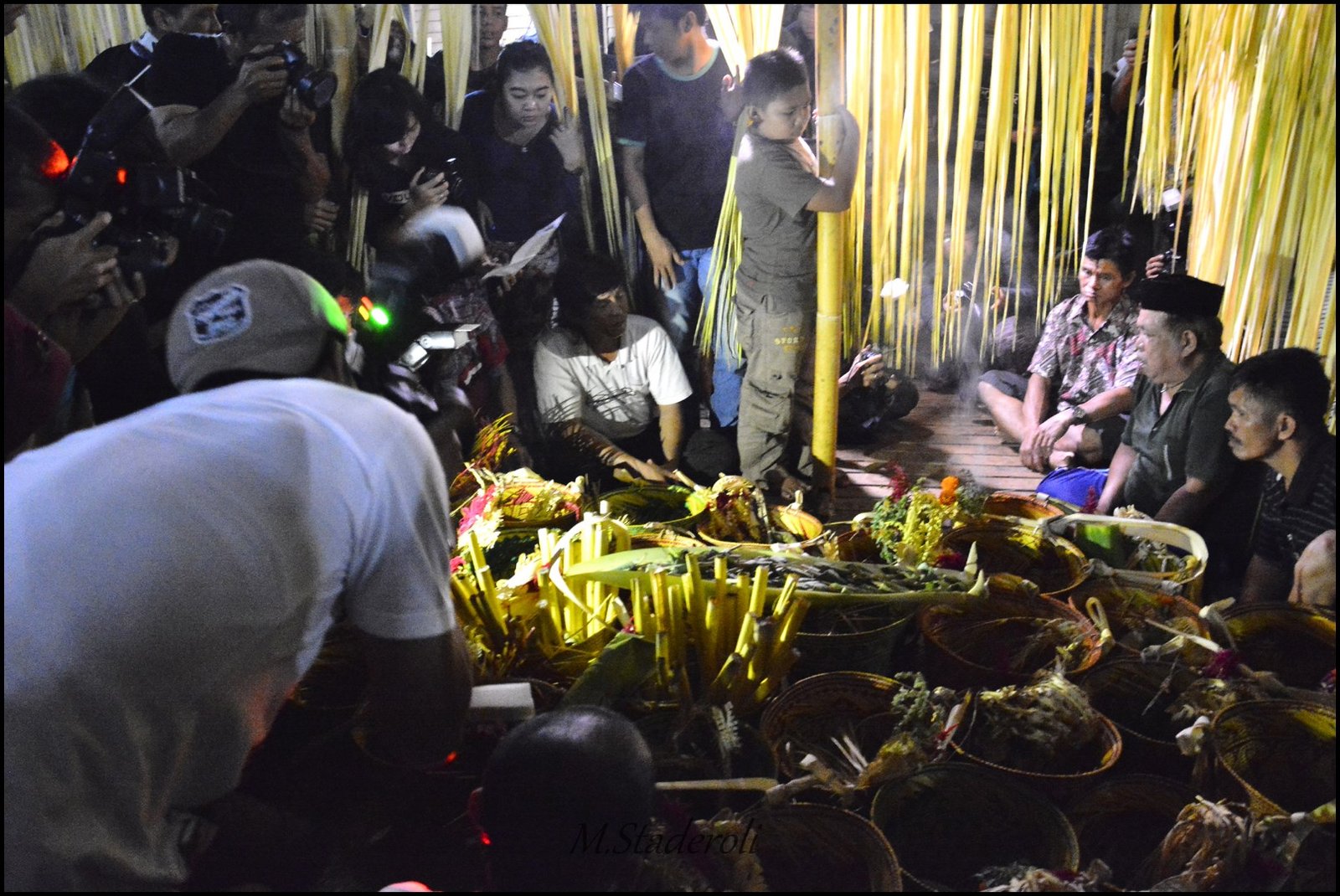 Ensuite les hommes se sont assis au même endroit, ont fait ce qui ressemblait à des prières et se sont posé une sorte de pommade sur certains endroits du corps. Puis ré-offrandes. Au départ j’étais un peu gênée ne sachant pas si j’allais pouvoir photographier, me lever, m’approcher etc J’ai vite vu qu’il n’y avait aucune règle ni aucun tabou ! Tout le monde faisait sa vie, passait au milieu, des dizaines de photographes allaient se coller le nez contre les personnes effectuant la cérémonie (c’est même trop à mon sens). Je n’ai pas fait beaucoup de (bonnes) photos. D’une part c’était très sombre et puis il y avait tellement d’autres photographes que c’était galère pour se faire une place, je n’avais pas envie de jouer des coudes… Il y avait également une caméra qui filmait pour une chaine TV de Banjarmasin, et figurez vous que j’ai été interviewée ! Ahahaha ! Déjà en français j’aurais pas été à l’aise alors là en anglais ! Ca va que le gars m’a attrapée au vol et que je n’ai pas eu le temps de réfléchir.
