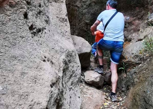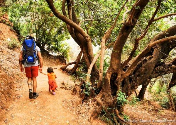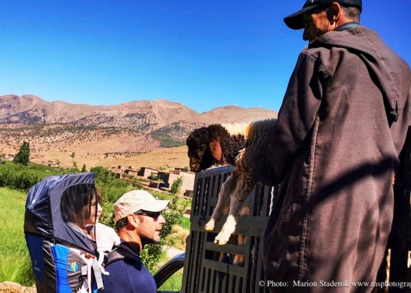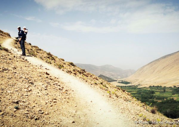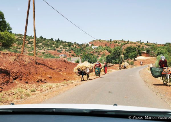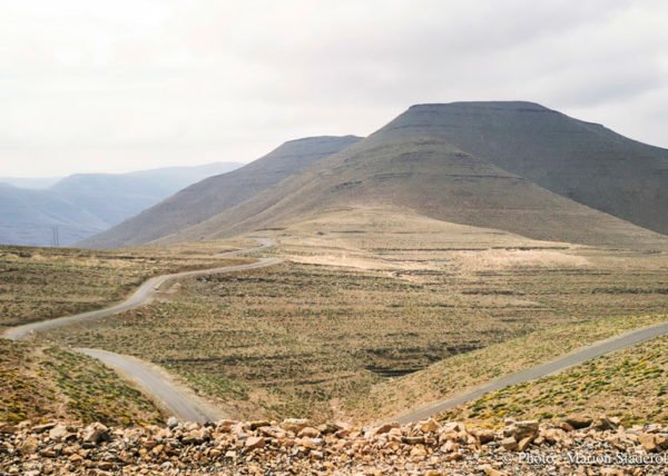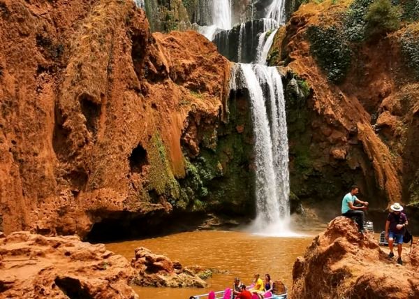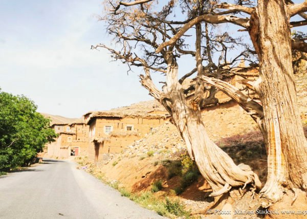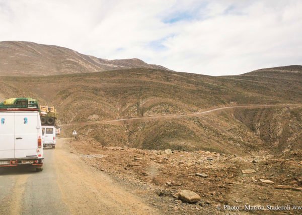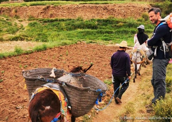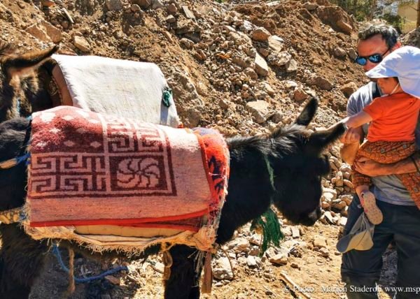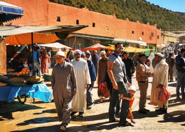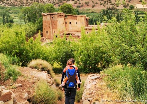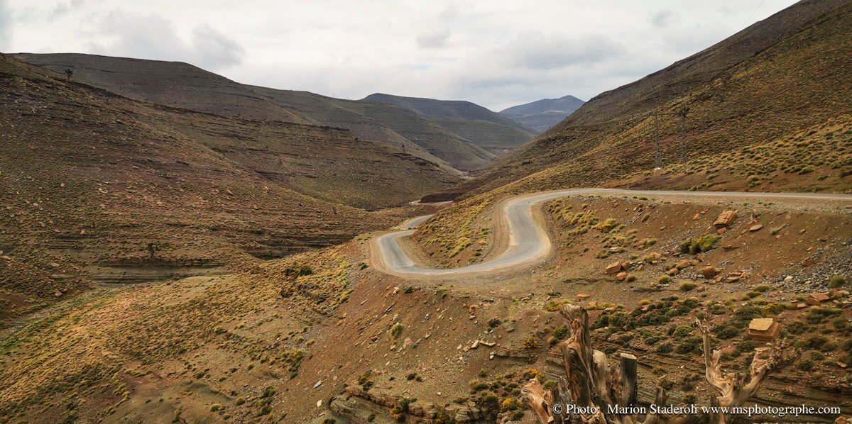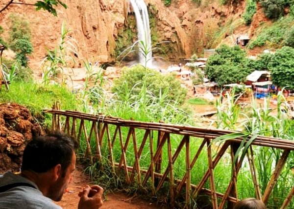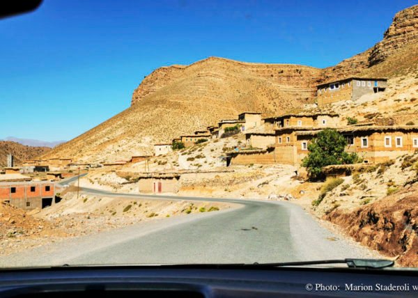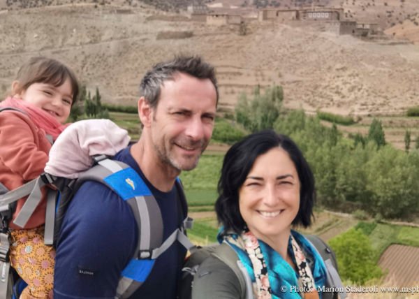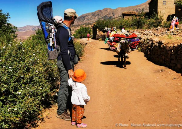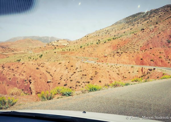 Nous en avons eu pour 5H de trajet(220km) depuis Marrakech. Nous sommes passés à l'aller par la cascade d'Ouzoud qui nous a permis de faire une belle pose pour le repas et pour que Lou se dégourdissent bien les jambes (puis dorme de nouveau top !) Seuls on ne s'y serait pas forcément arrêtés car c'est bien touristique, mais c'est un lieu sympa si on arrive tôt et qu'il y a peu de monde. Prenez le chemin à droite, et descendez manger au camping, c'est vraiment joli et calme comparé à l'autre côté où vont les groupes. Nous avons ensuite emprunté des routes de montagne comme ci-dessus, vraiment un autre monde. Au retour nous avons opté pour passer via Ait Boulli, une autre vallée incroyable faite de villages ocres ou rouges à flanc de montagne... Nous avons fait un arrêt repas/balade au "pont naturel" près de Demnate (un spot touristique également)