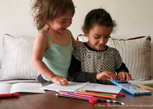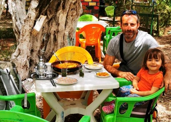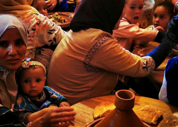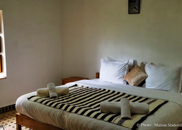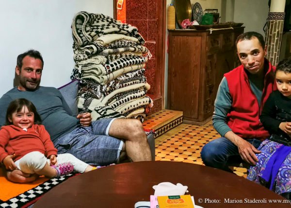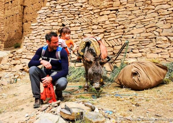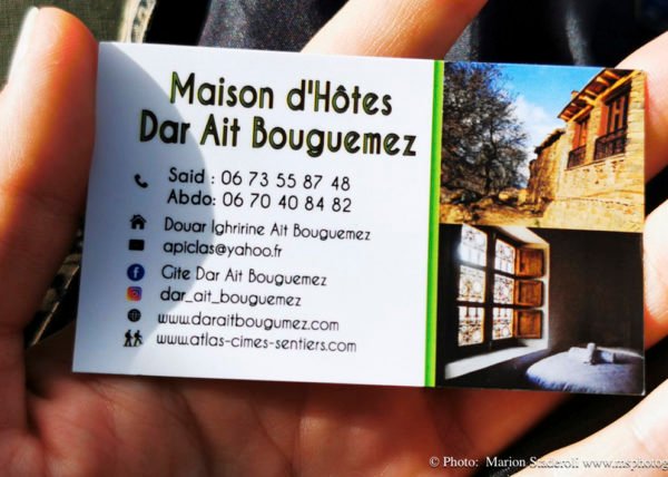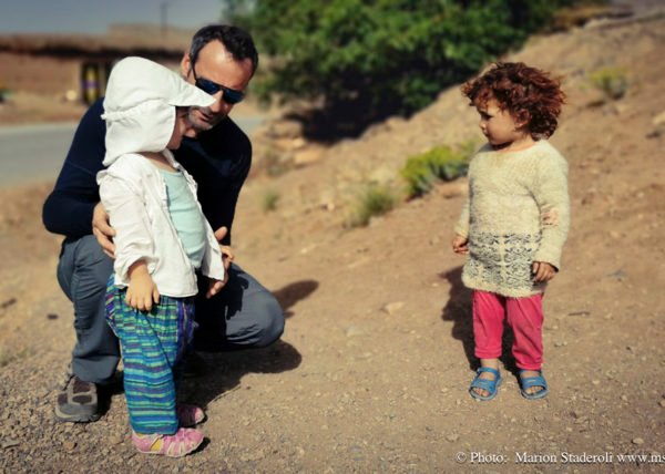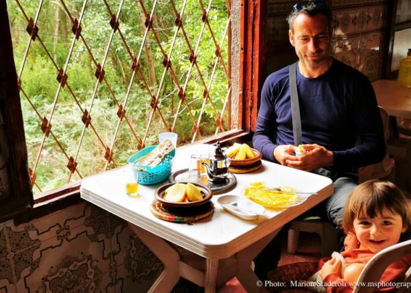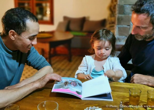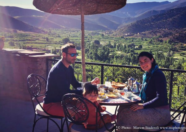 Nous avons logé au Dar Ait Bouguemez (vous trouverez des gîtes d'étape et un hôtel plus haut de gamme) qui m'a tout de suite tapé dans l’œil : vue magnifique et ambiance familiale chez l'habitant , tout en étant "confort". Un prix très accessible (regardez leur site c'est plus simple), pour ne pas dire bon marché. Bref, parfait ! Nous avons vécu côte à côte avec cette adorable famille, et passé de beaux moments. Saïd, le papa, parle le Français (c'est un peu laborieux mais ça passe), Fatima, la maman, juste quelques mots, et elle prépare de délicieux et copieux repas (oui c'était juste pour nous !). Ils ont trois enfants, deux garçons (dont l'un a malheureusement une maladie grave et incurable, ça vous fend le coeur...) et une petite fille Fatimzarha, qui fut une copine pour Lou. Nous étions les seuls sur place, comme à la maison !